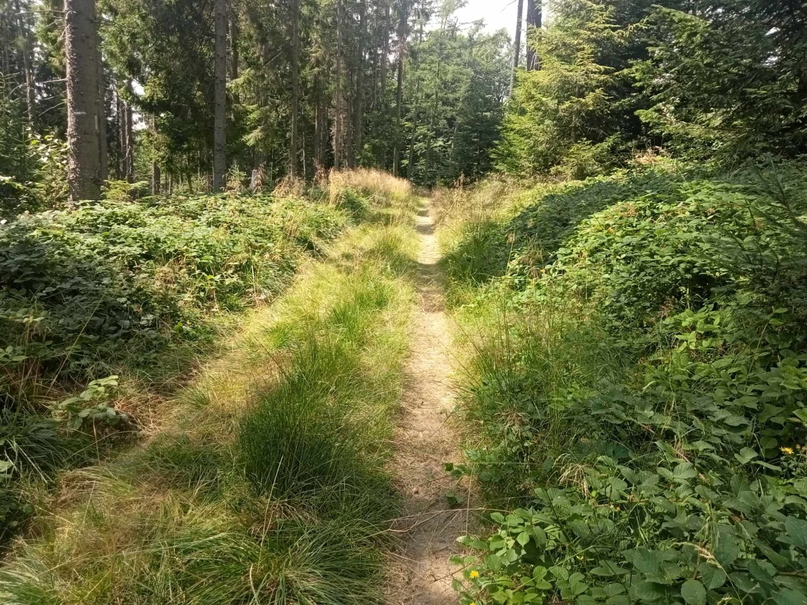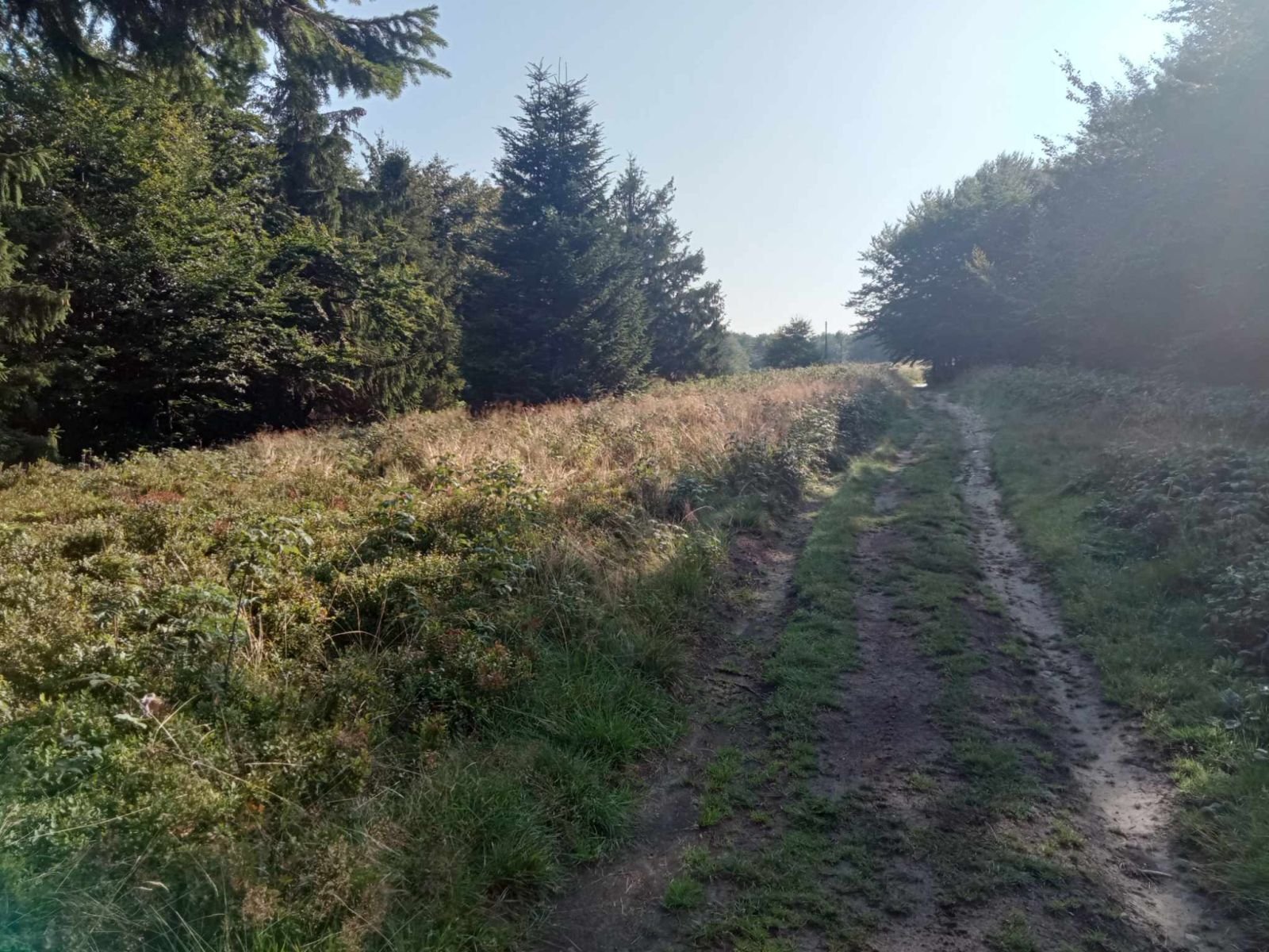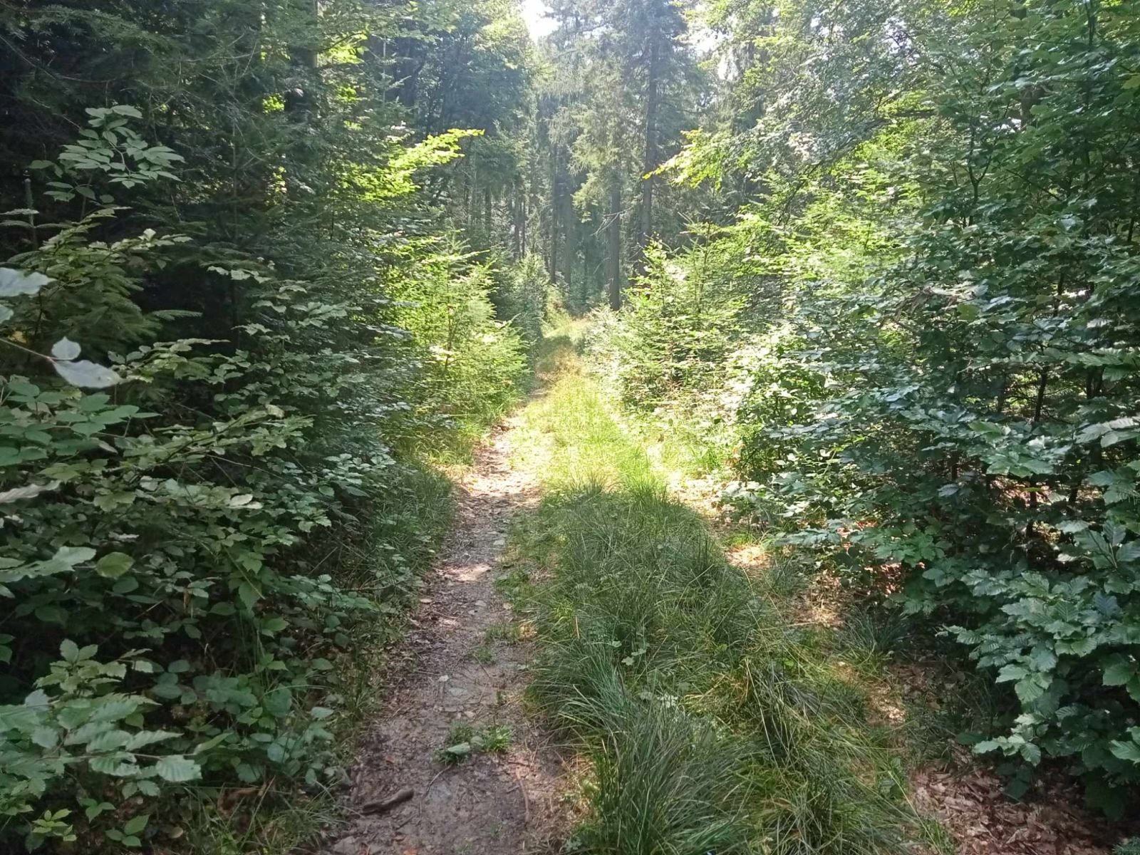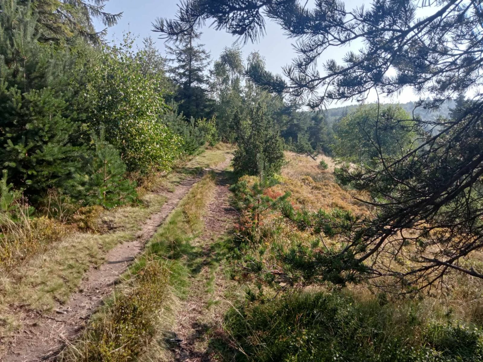 Zejście czarnym szlakiem nie zaczyna się obiecująco - wysoka trawa - mało kto tędy chodzi. Czarny szlak od Pod Bukową do Szczawnika to 6 kilometrów można powiedzieć, że jest to trasa delikatnie mówiąc dla konseserów. Wiele ciekawego na tym szlaku nie zobaczymy. Początkowy etap jeszcze w miarę co widać na zdjęciu, później już najczęściej zejście po kamieniach.