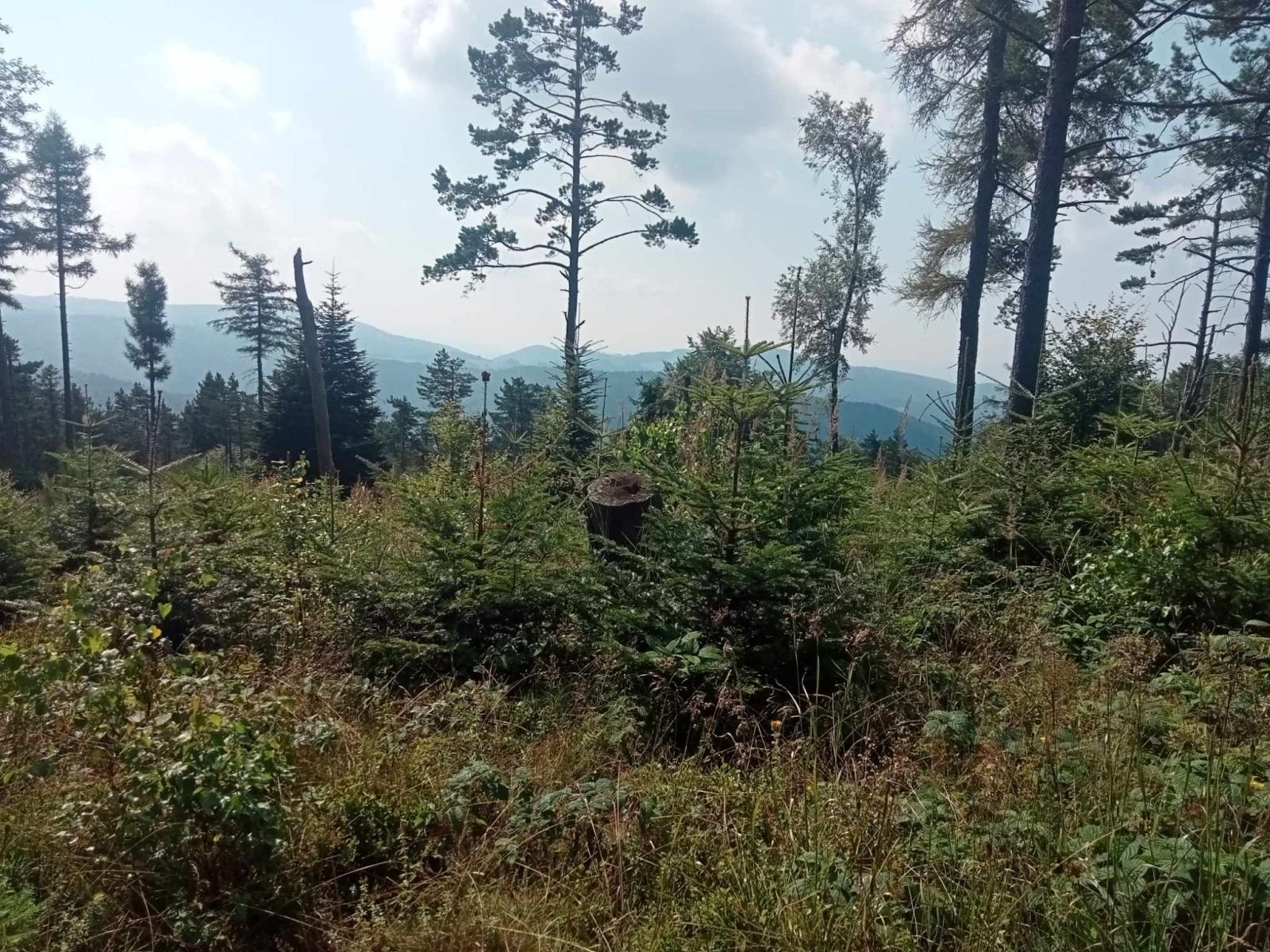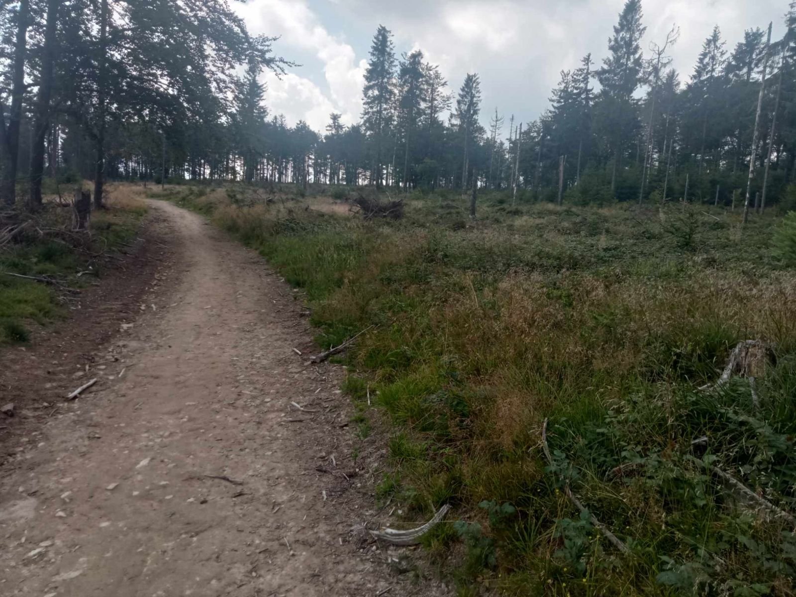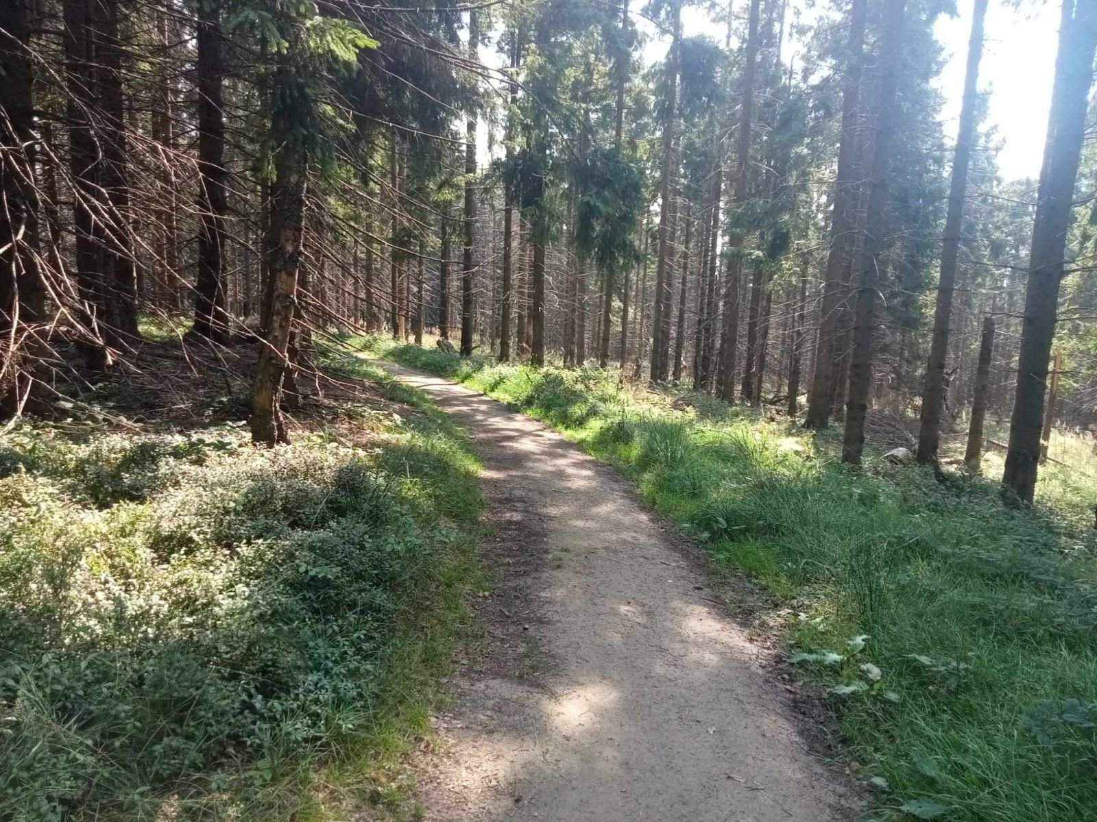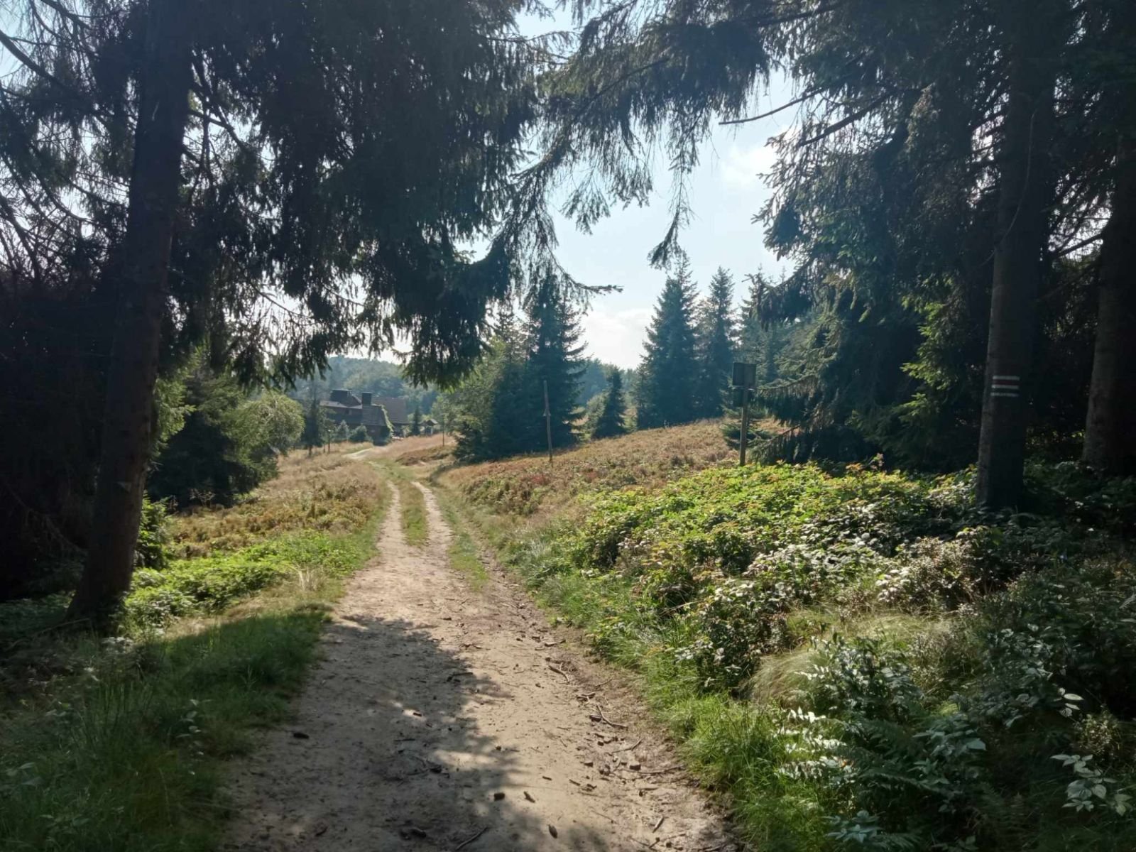 Zejście czarnym szlakiem nie zaczyna się obiecująco - wysoka trawa - mało kto tędy chodzi. Czarny szlak od Pod Bukową do Szczawnika to 6 kilometrów można powiedzieć, że jest to trasa delikatnie mówiąc dla konseserów. Wiele ciekawego na tym szlaku nie zobaczymy. Początkowy etap jeszcze w miarę co widać na zdjęciu, później już najczęściej zejście po kamieniach.