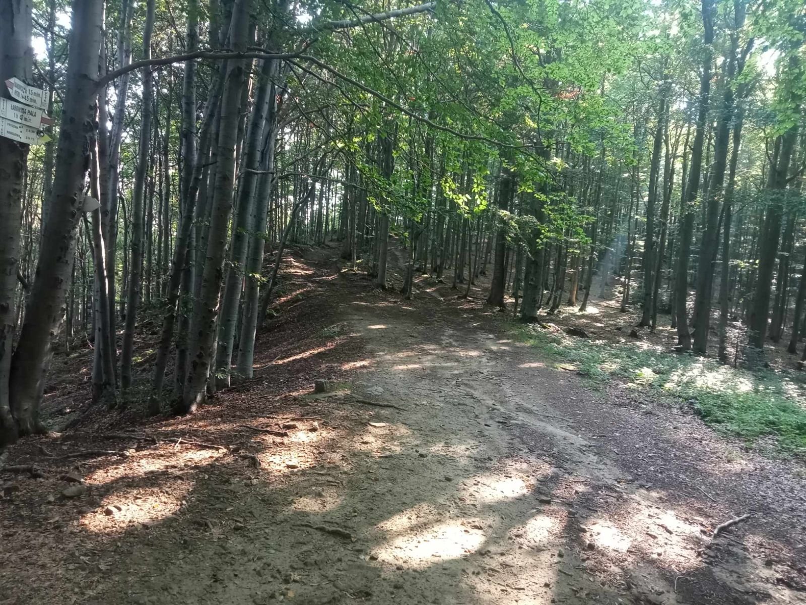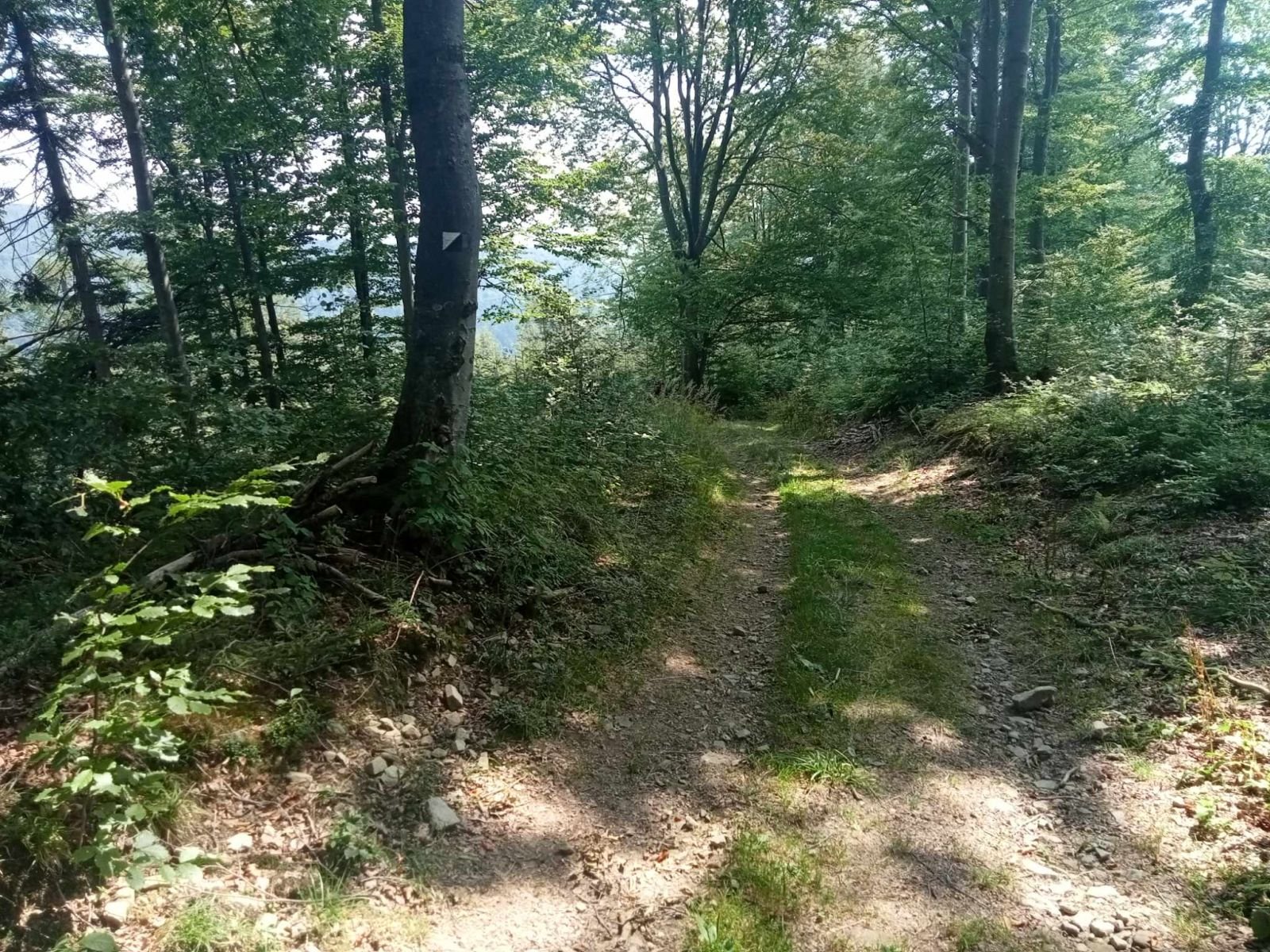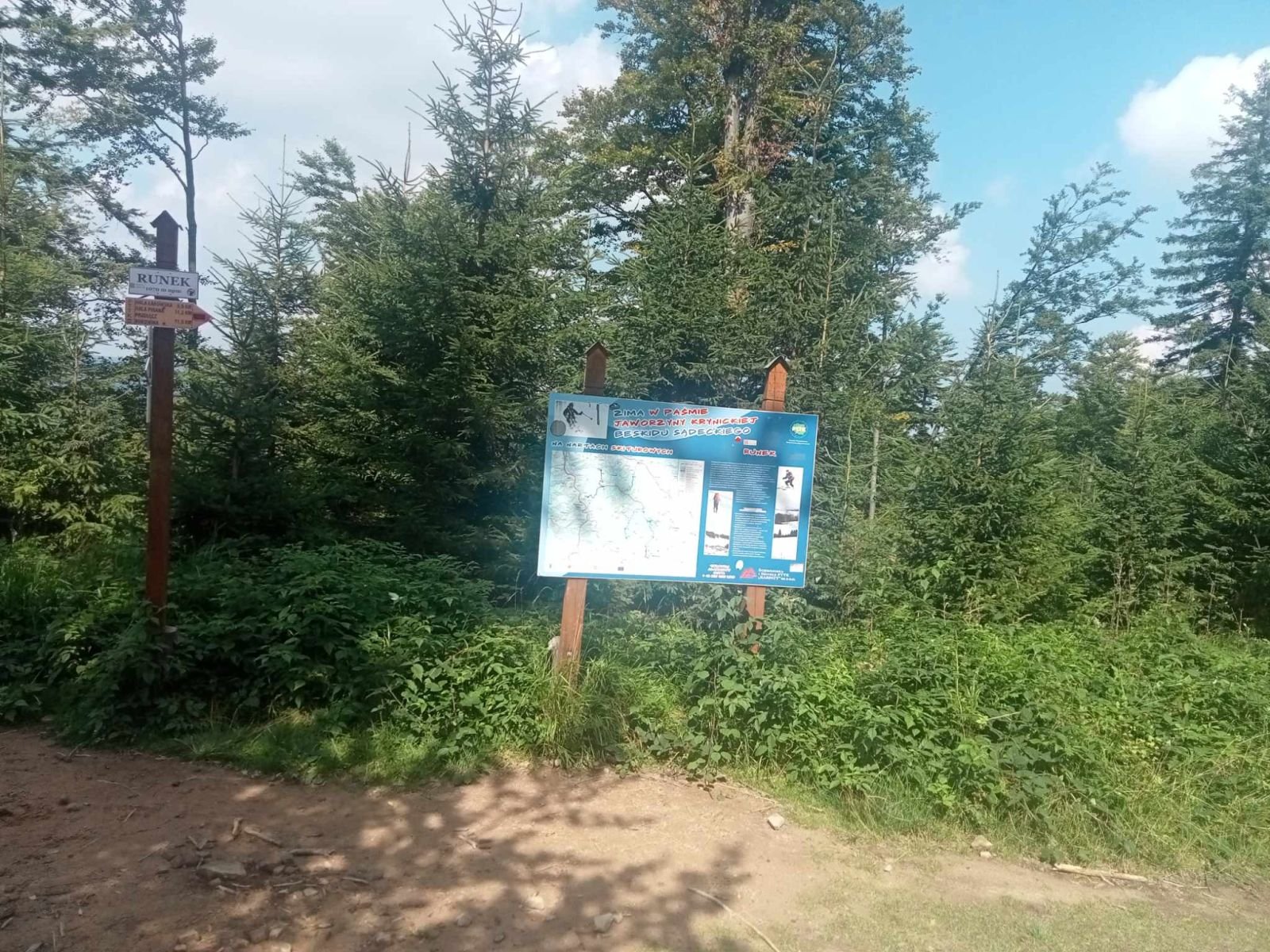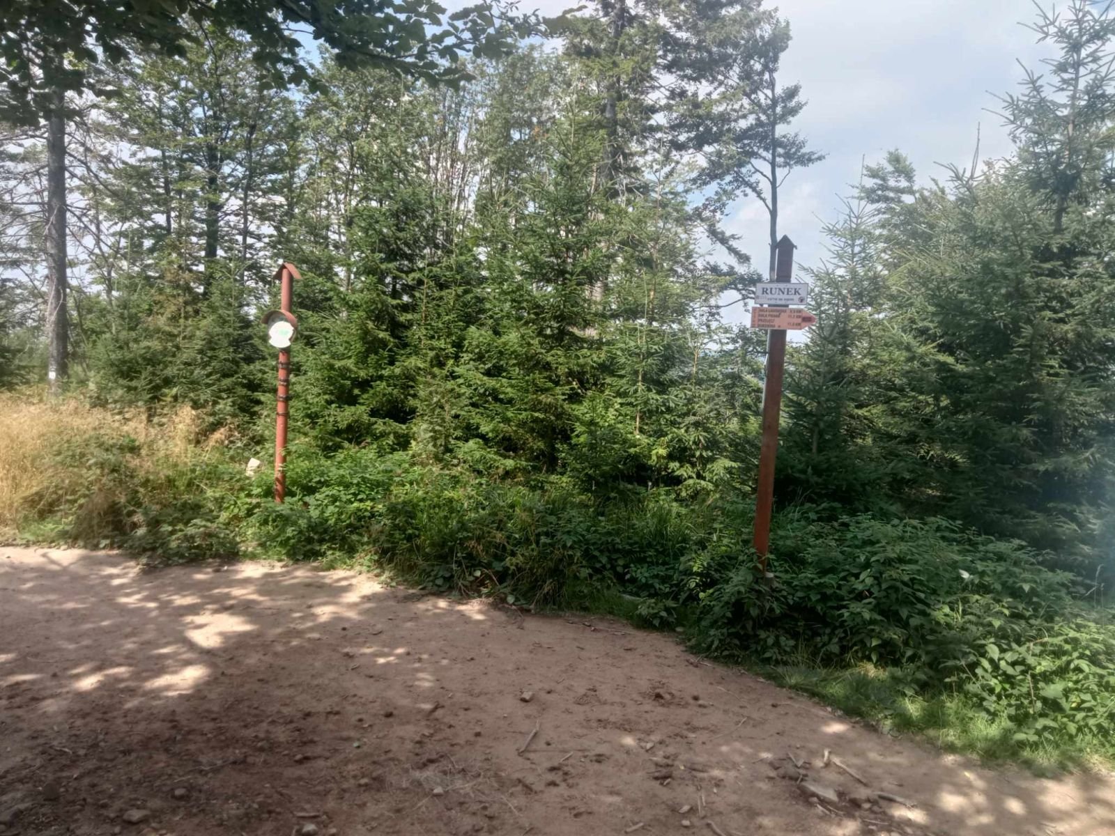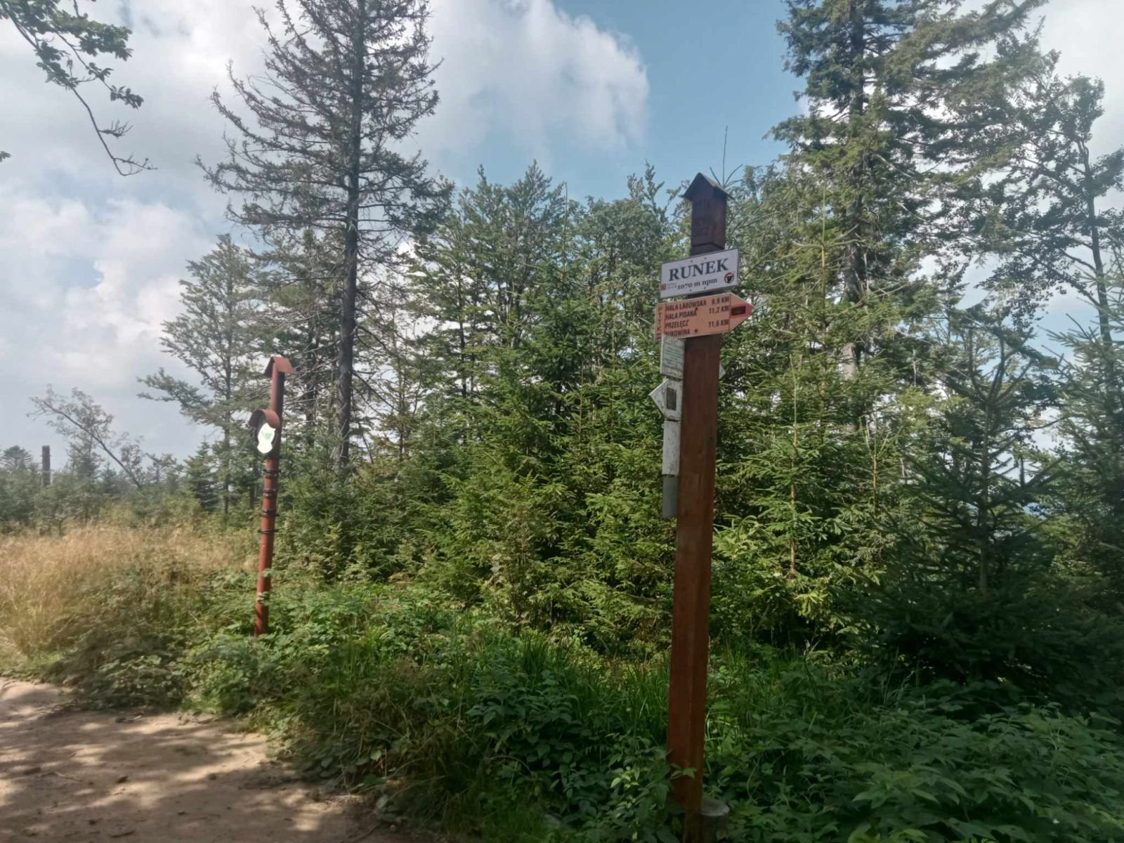 Runek szczyt do którego sporo osób podążą ze strony Muszyny - po drodze bardzo dużo osób taki cel miało przed sobą. Wierzchołek jest całkowicie pokryty lasem widoki są tu marne. Jeżeli już tu jesteśmy i to jest nasz cel wyprawy polecamy skręcić w kierunku Bacówki nad Wierchomlą i tam widoki już powinny być lepsze. Trochę tu wieje co przy tym upale daje trochę oddechu. Na szlaku spotykamy dość sporo osób z małymi dziećmi, które niekoniecznie są przygotowane na taką drogę...