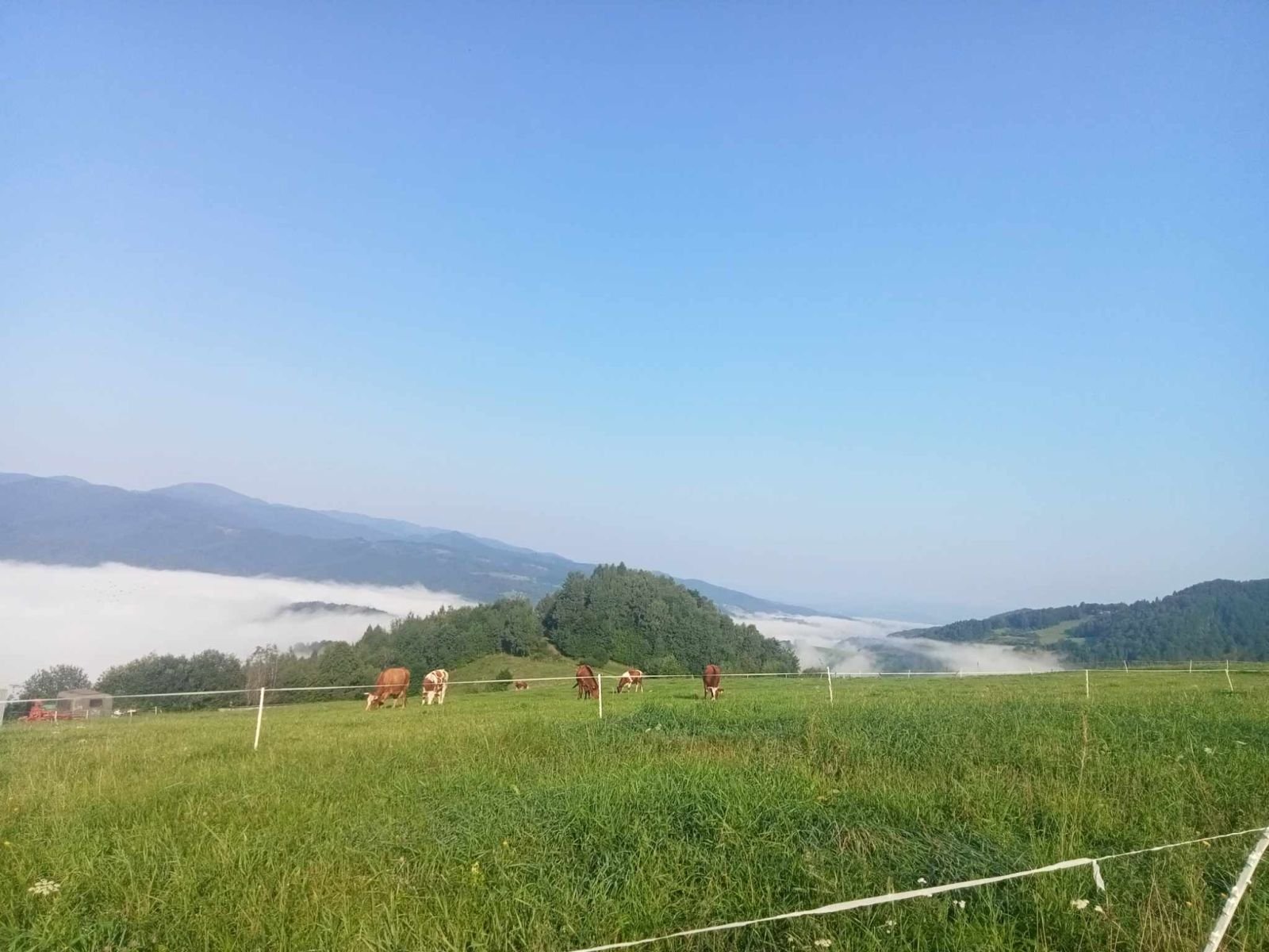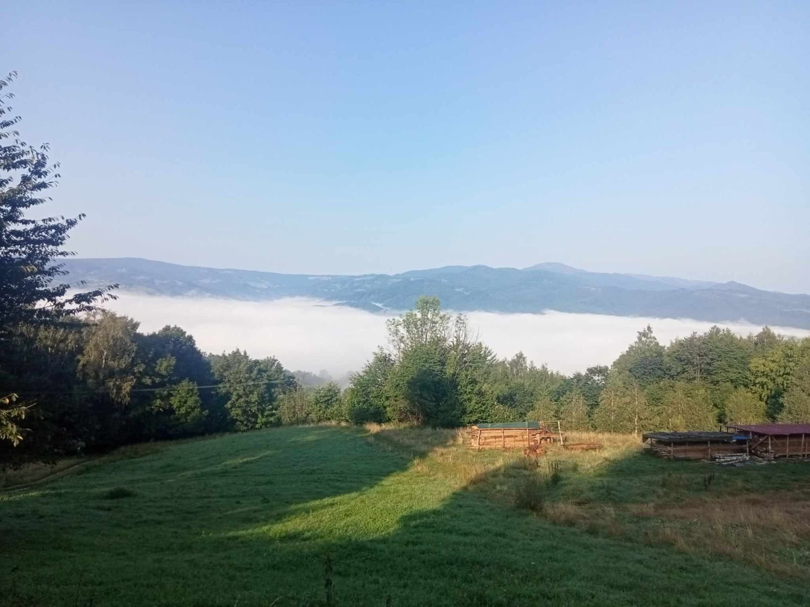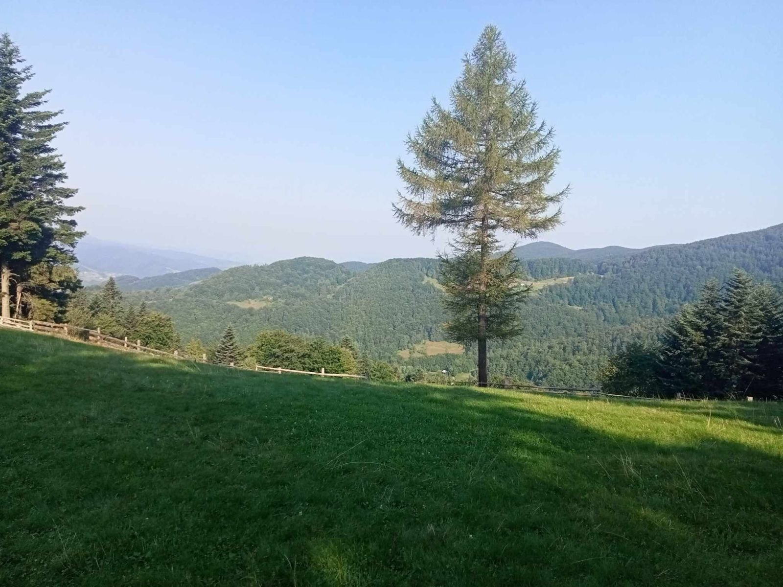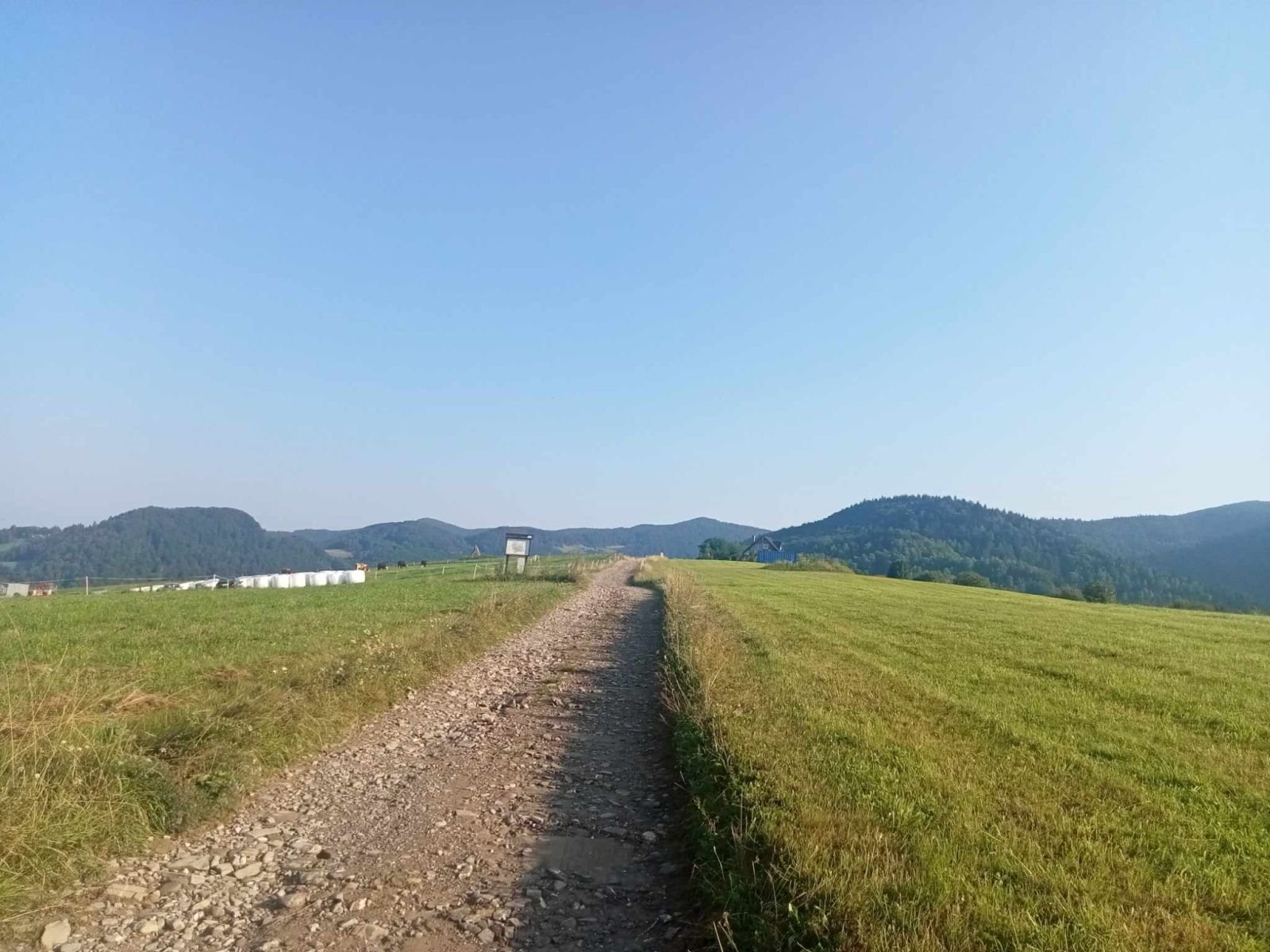 Po niełatwym podejściu wchodzimy na szerokie łąki przy osiedlu Jarzębiaki, nie widać tego na zdjęciu ale są i krówki. Przed nami podejście pod Przełęcz Bukowina, widoczna w oddali na zdjęciu. Tu powinna być gdzieś kapliczką, którą ostatecznie przegapiliśmy w sumie nie wiadomo czemu ;)