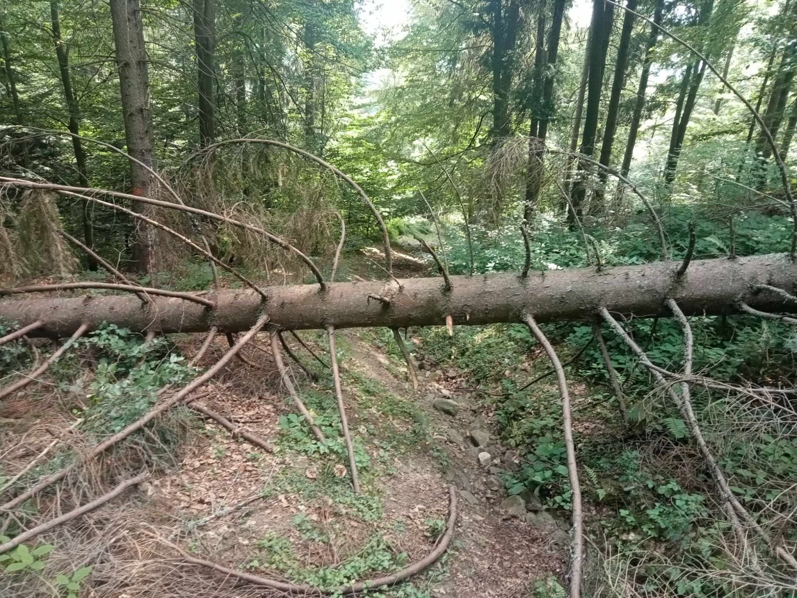 Powalone drzewo na szlaku czyli naturalna przeszkoda. Gorzej mają Ci na rowerach a ich tu nie brakuje.