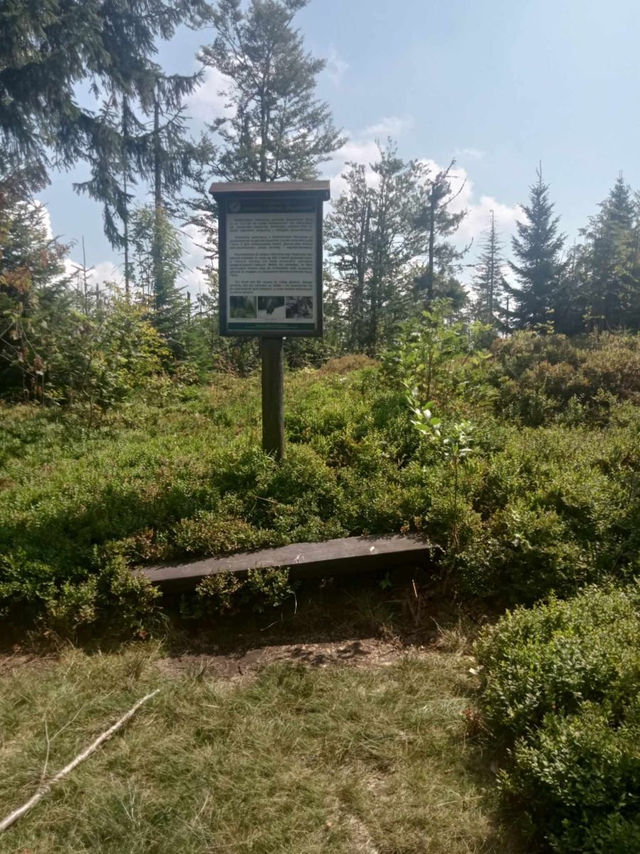 Taka przyjemna ławeczka z informacją - ostoja Głuszca. Można troszkę poczytać, wypocząć. Jak się wpadnie w dobrym momencie to można i zjeść trochę borówek. Tych ławeczek na tym szlaku nie brakuje.