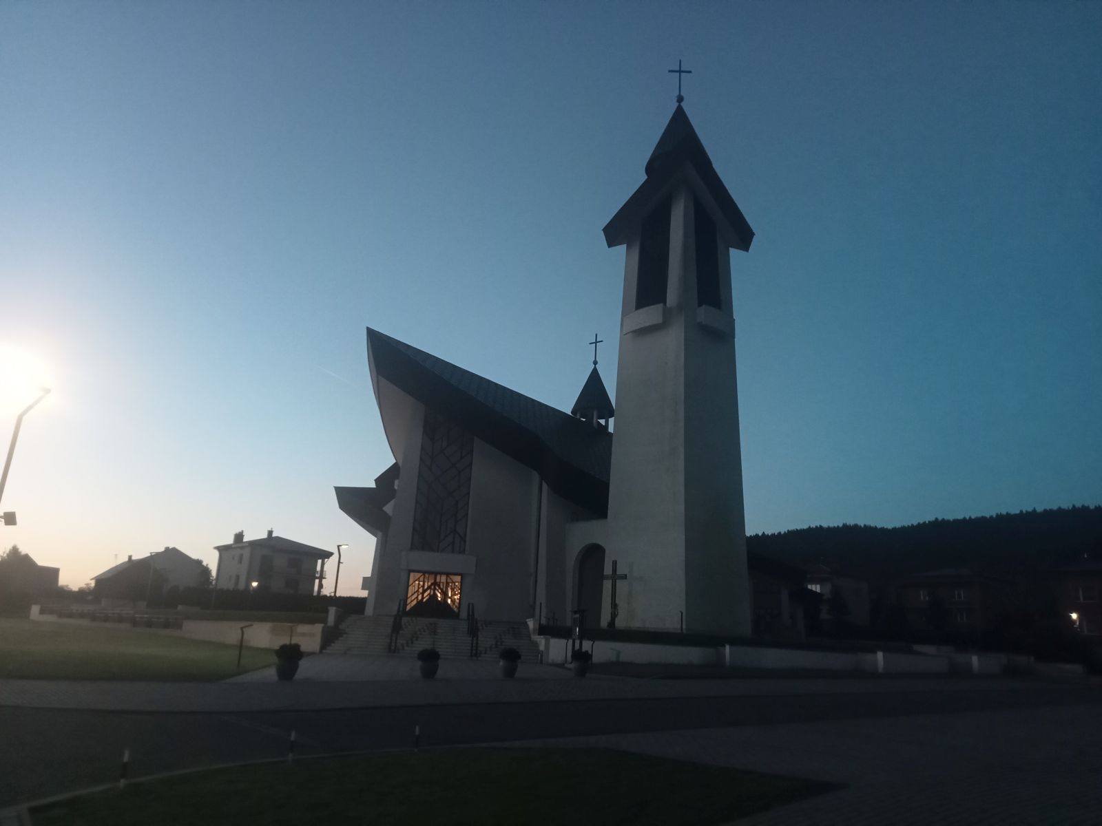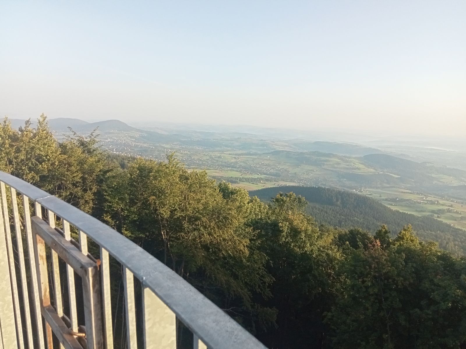 O godzinie 5:00 ruszamy ze Starego Sącza pociągiem relacji Piwniczna - Tarnów, konduktor informuje nas, że jesteśmy pierwszymi jego "klientami" w tym dniu. Ptaszkowa - bezchmurne niebo godzina 5:40 troszkę ciemnawo, dzień coraz krótszy. Dworzec kolejowy znajduję się nieopodal kościoła. Ptaszkowa położona 7 km od Grybowa liczy sobie ponad 3 tysiące mieszkańców - jak na wieś sporo. Na zdjęciu kościół Parafialny Imienia Najświętszej Maryi Panny. Kościół naprawdę duży. Jesteśmy już na szlaku, który prowadzi obok kościoła i pnie się w górę, do wieży widokowej na Jaworze mamy niespełna 5 km. Suma podejść to 405 metrów więc nie jest to trudny szlak. Idzie się naprawdę dobrze, choć wejście w las gdzie jest ciemno o tej godzinie no jest niezbyt miłym akcentem. Końcowy etap, czyli podejście pod wieże jest nieco wymagające, można to porównać z wyjściem na Modyń. Śmiało można zabrać ze sobą dzieci, widoków na szlaku nie znajdziecie, idziemy praktycznie cały czas lasem. Jedyny punkt widokowy to wieża. Idzie się dość łatwo i dość przyjemnie. Do samej wieży nie spotykamy nikogo. Spodziewaliśmy się mgły, jednak była bardzo ciepła noc i poranek, więc praktycznie jej nie było. Na szlaku są dwie rzeczy, które robią wrażenie - potężny kościół i wieża widokowa, czas dojścia do niej niebieskim szlakiem to około 1:40 spokojnym marszem.