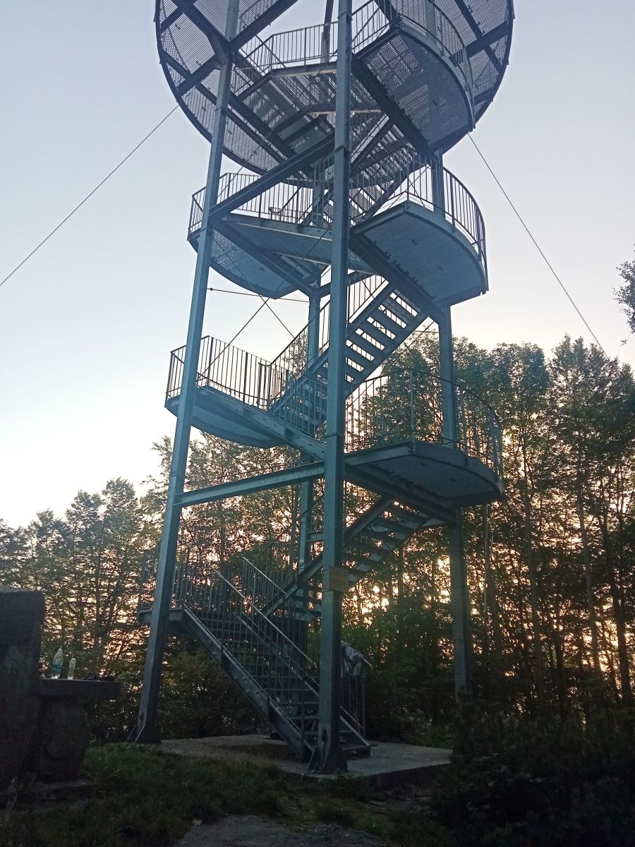 Platforma widokowa znajduje się na wysokości 15,8 m. Całkowita wysokość wieży + 9 m krzyż to 29,3 m Przy dobrej pogodzie jaką mieliśmy widoki są całkiem całkiem. Szczerze polecamy ten punkt widokowy. Na samej górze miła niespodzianka, ponoć przypadkowo napotkany kolega ze szkolnej ławki. Oprócz niego dwie osoby, które tu ... nocowały ale to już nie koledzy. Tak wszystko się ułożyło, że skorzystaliśmy z jego gościnności i wylądowaliśmy w Grybowie. Trochę zakręcona z tego wyszła wyprawa, ale jeszcze tu wrócimy.