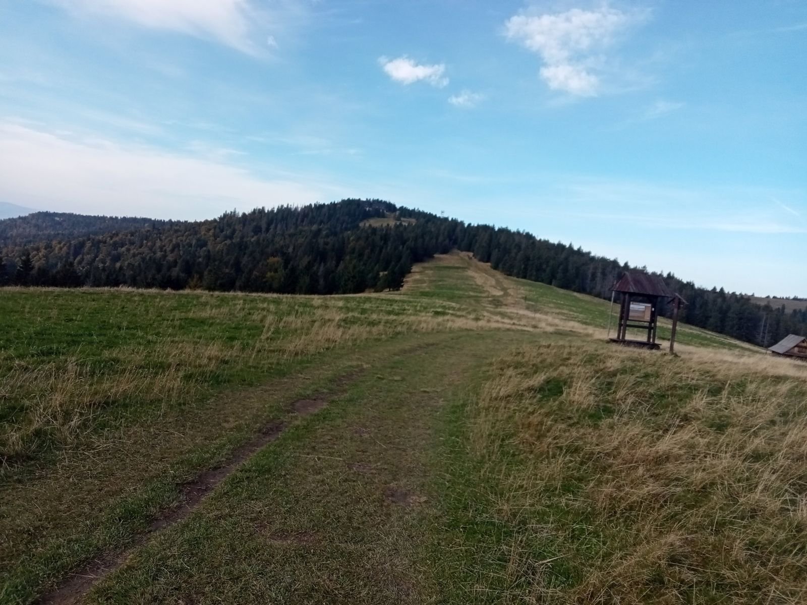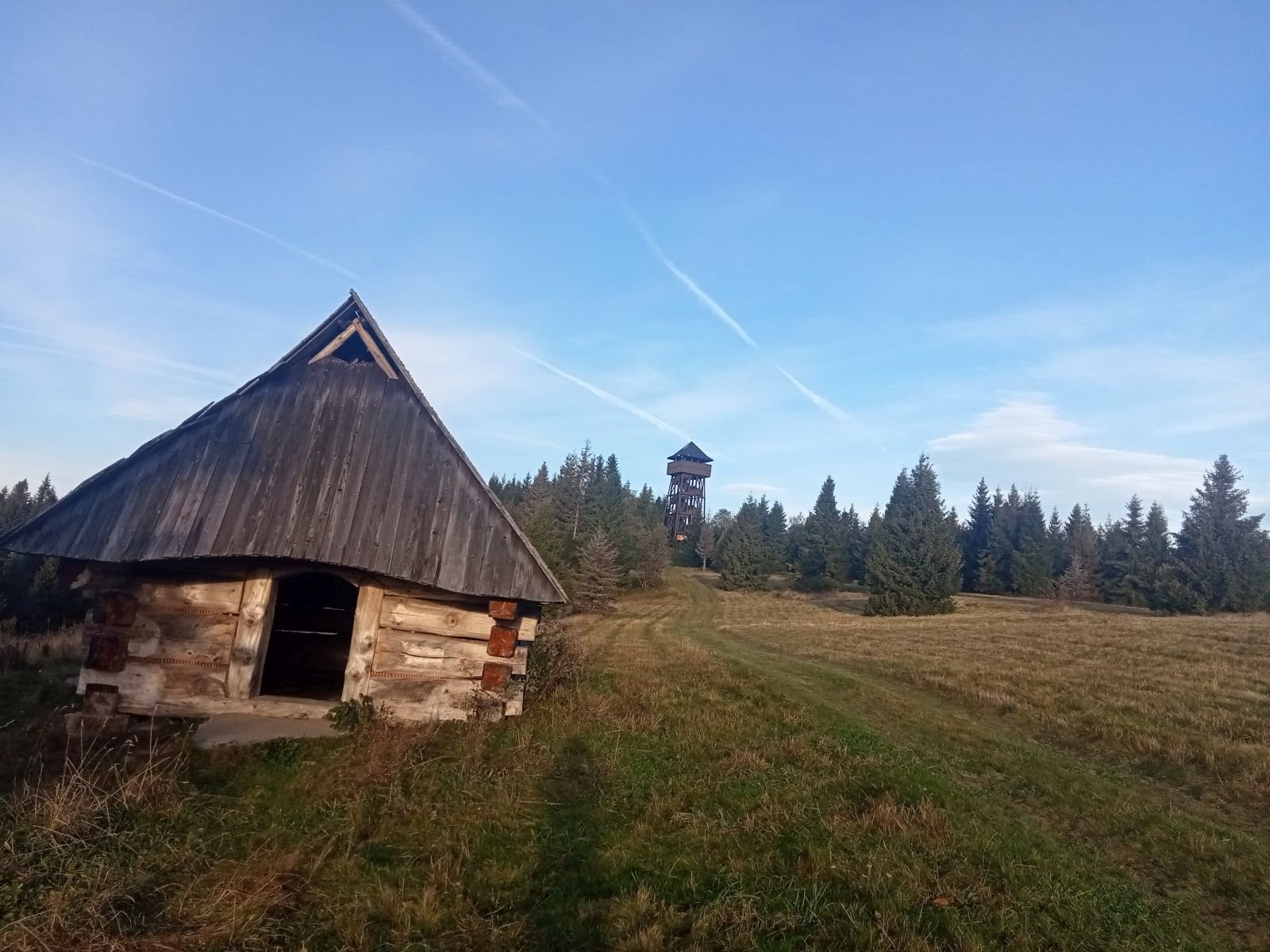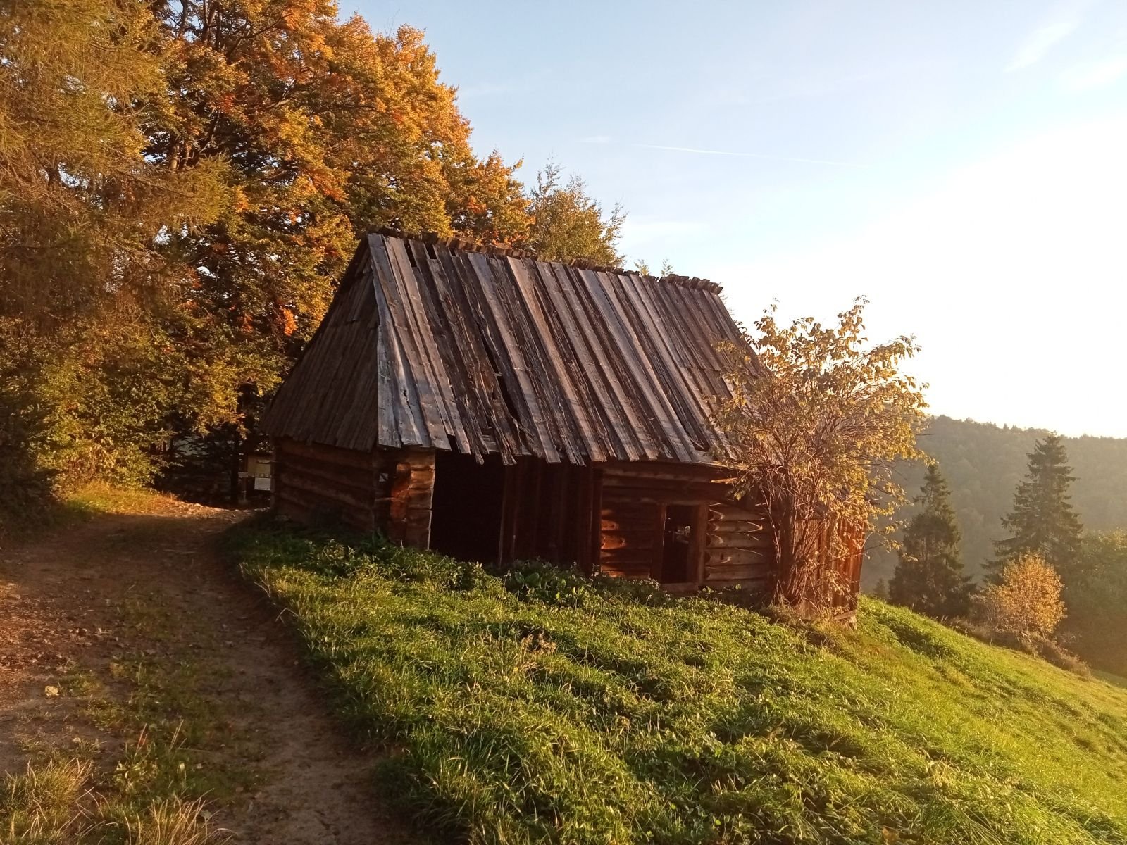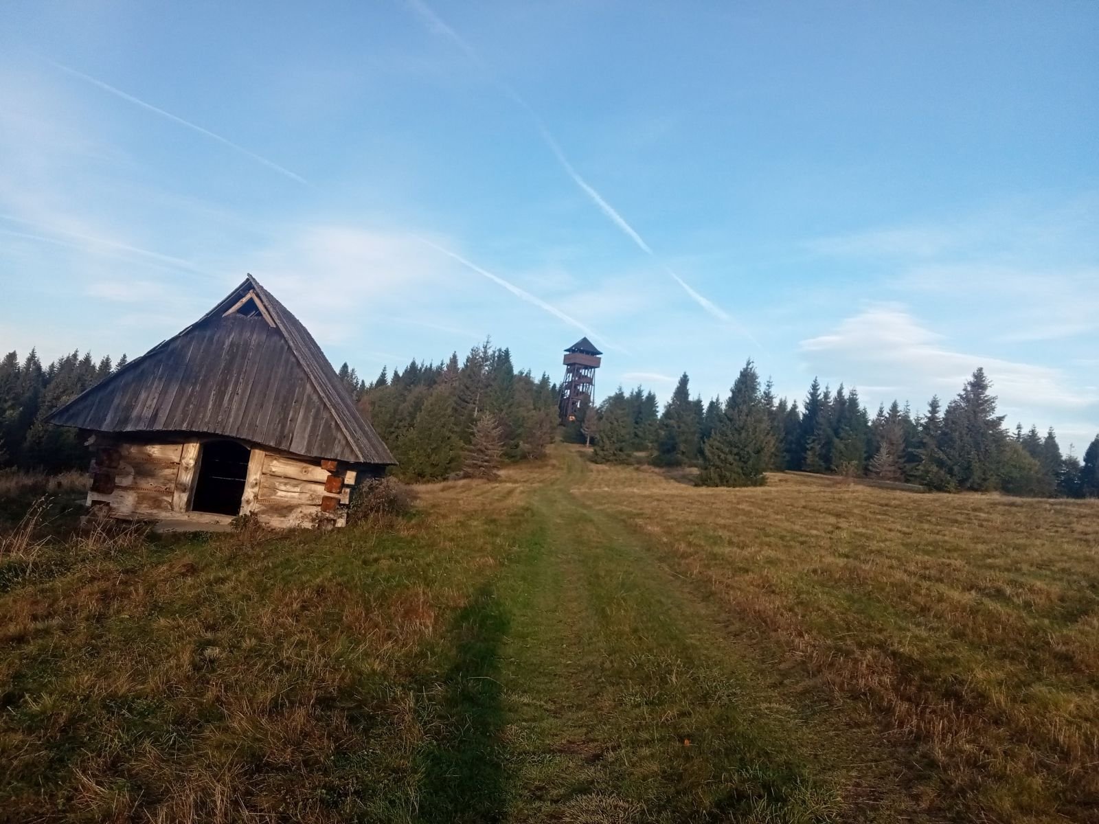 Koliba Królczyków na Polanie pod Magurką czyli luźne dawne zabudowania pasterskie - jesteśmy na Szlaku Kultury Wołoskiej. Sporo tablic edukacyjnych, idzie się bardzo dobrze szlak nie jest wymagający.