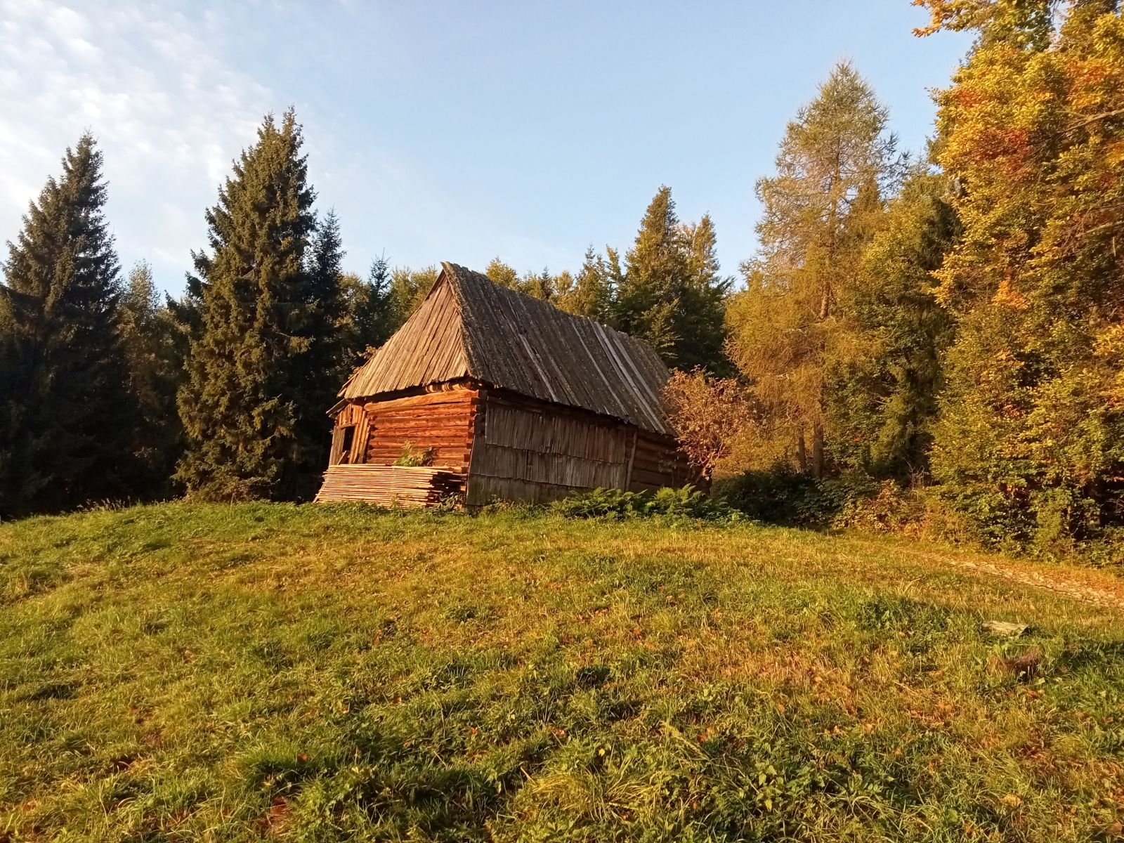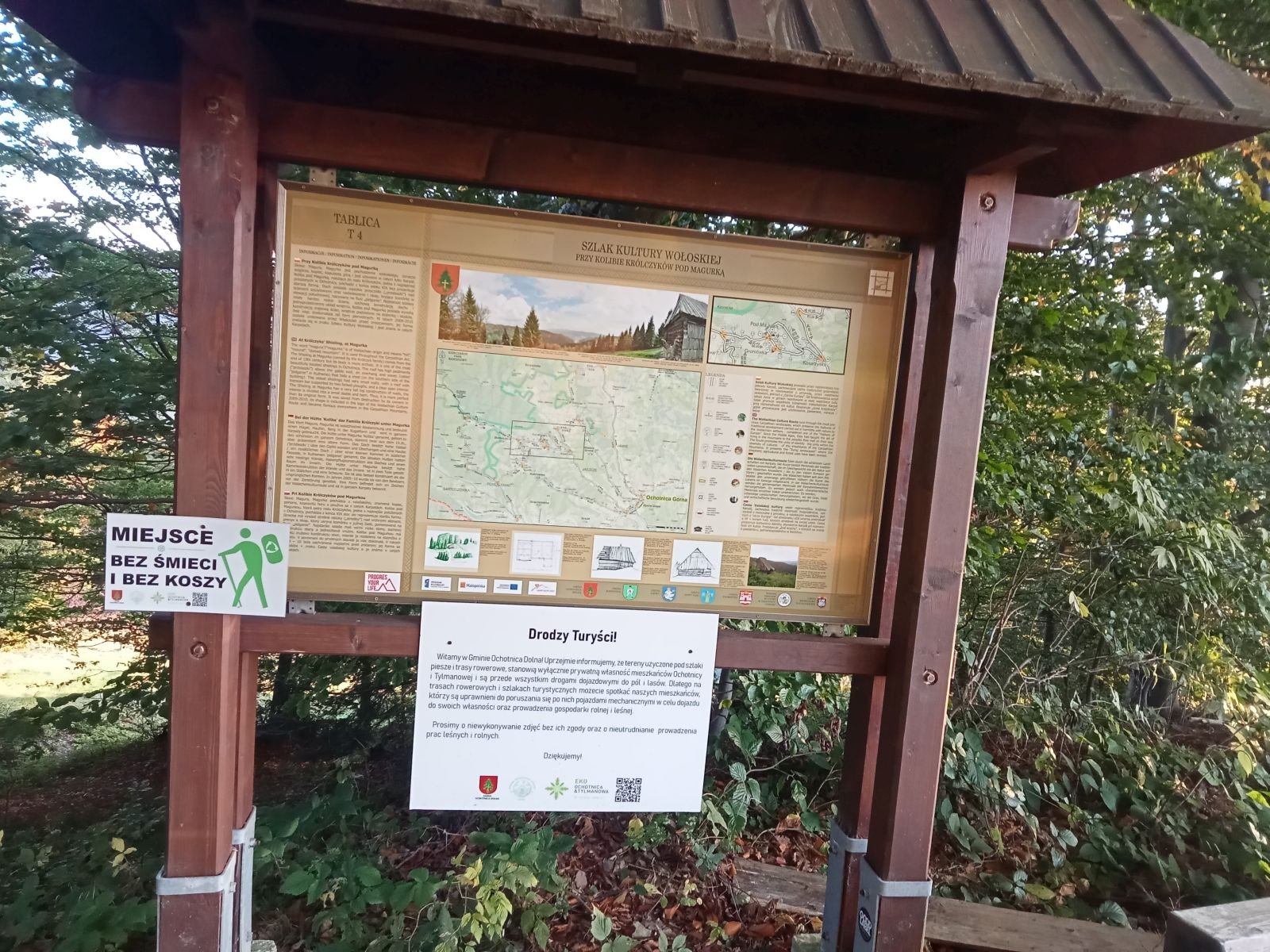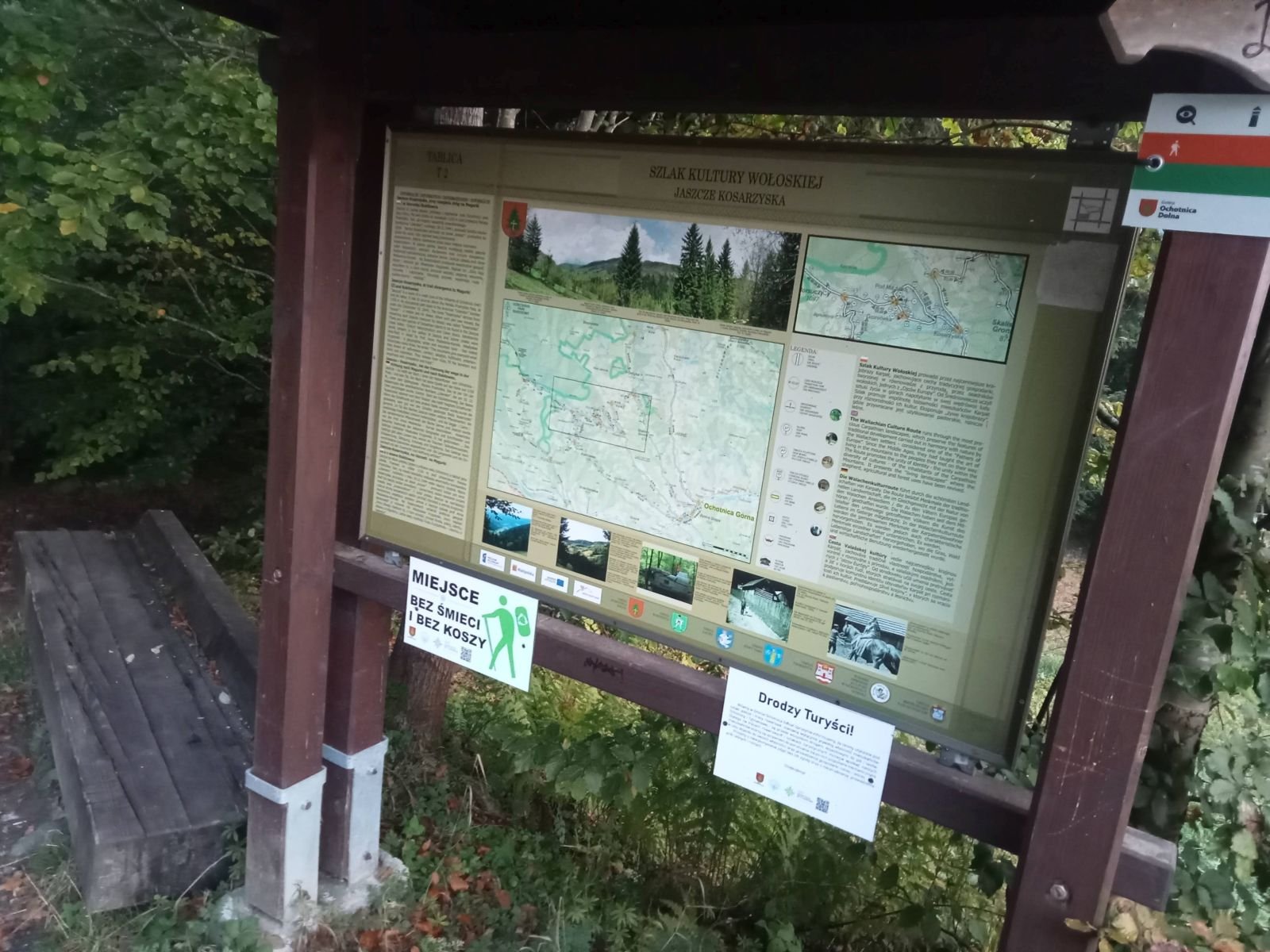 Koliba Królczyków na Polanie pod Magurką czyli luźne dawne zabudowania pasterskie - jesteśmy na Szlaku Kultury Wołoskiej. Sporo tablic edukacyjnych, idzie się bardzo dobrze szlak nie jest wymagający.