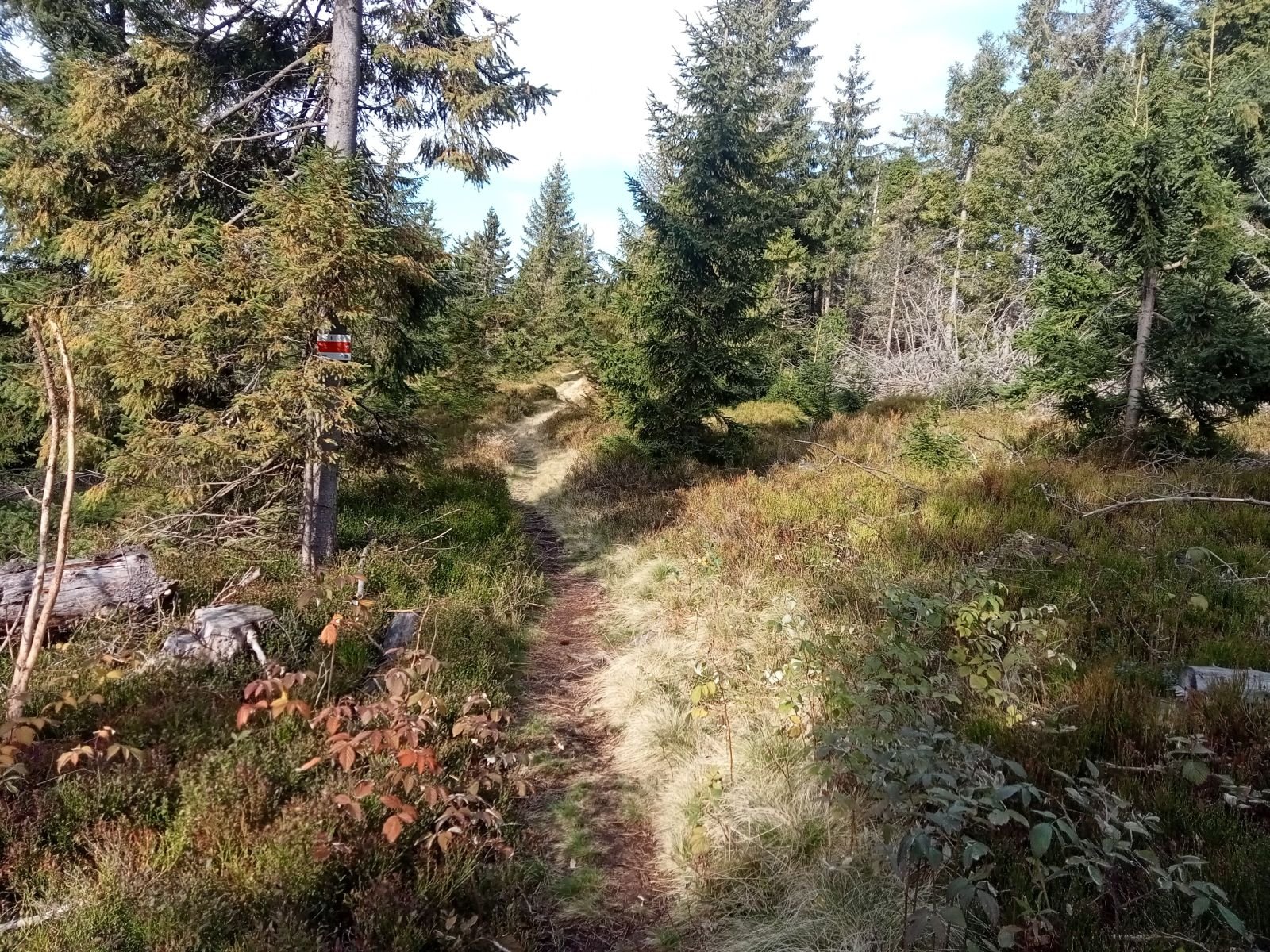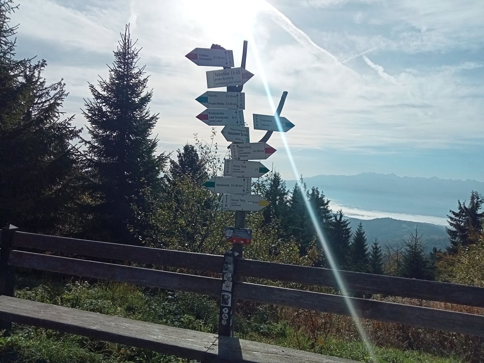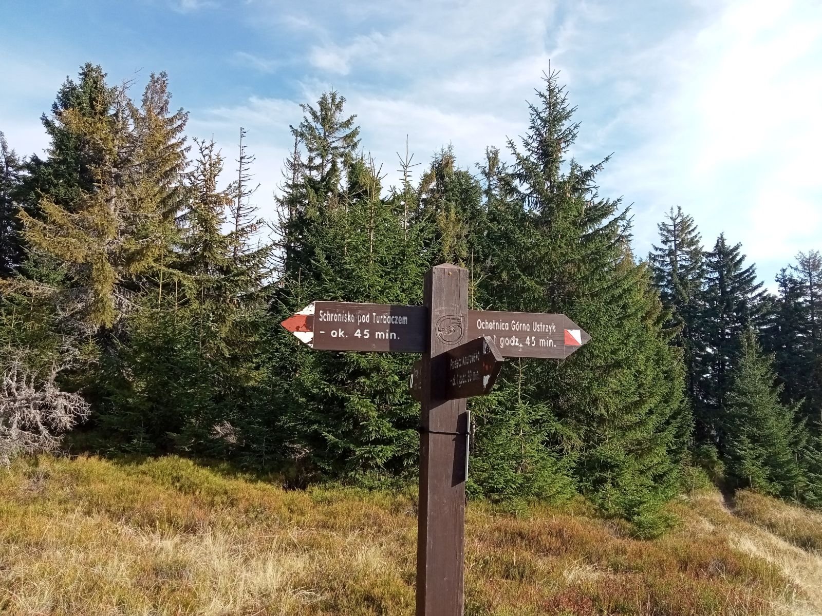 Między Magurkami a czerwonym szlakiem, który prowadzi na Turbacz nie ma typowego szlaku, jest tylko ścieżka. Co jakiś czas mijamy takowe oznaczenia, czy tu powstanie szlak? czy oznacza to coś innego tego nie wiemy. Samo dojście do czerwonego szlaku sprawia nam wiele trudności. Nawigacja w telefonie wiesza się lub myli ścieżki, których tu w niektórych miejscach jest sporo. Bardzo trudny etap wycieczki jeden z najtrudniejszych jakie nas spotkały przez te lata. Według nas nie ma możliwości przejścia tego etapu bez błądzenia. Na szczęście udało nam się wbić na czerwony szlak ufff teraz to już z górki, a było naprawdę nerwowo.