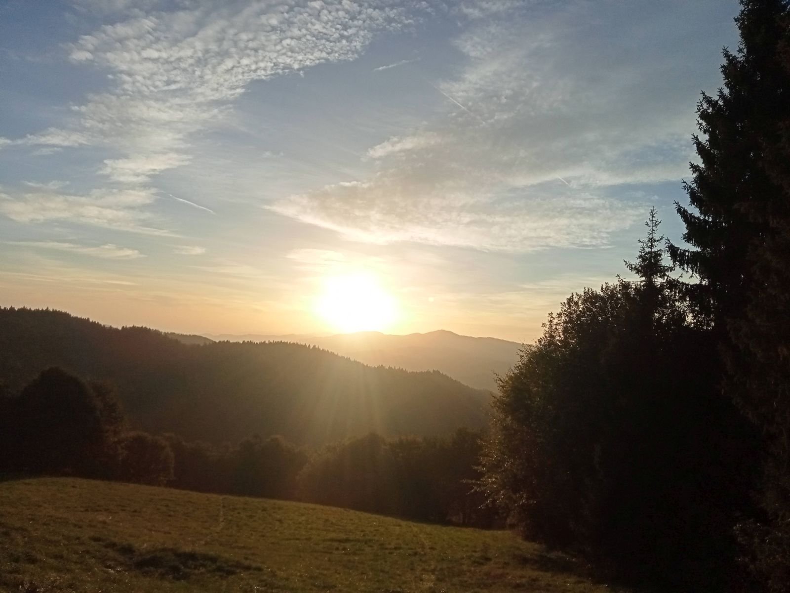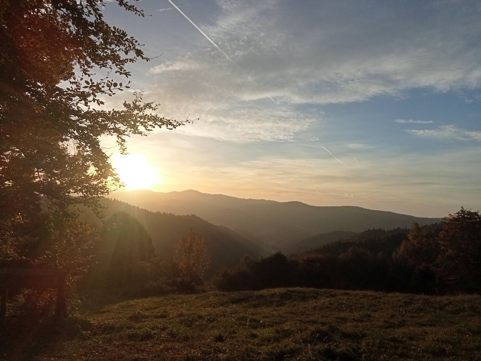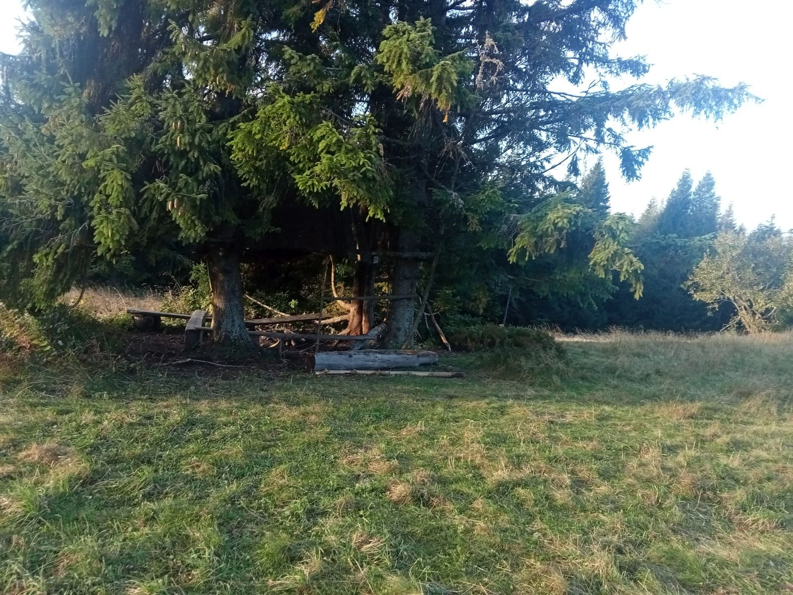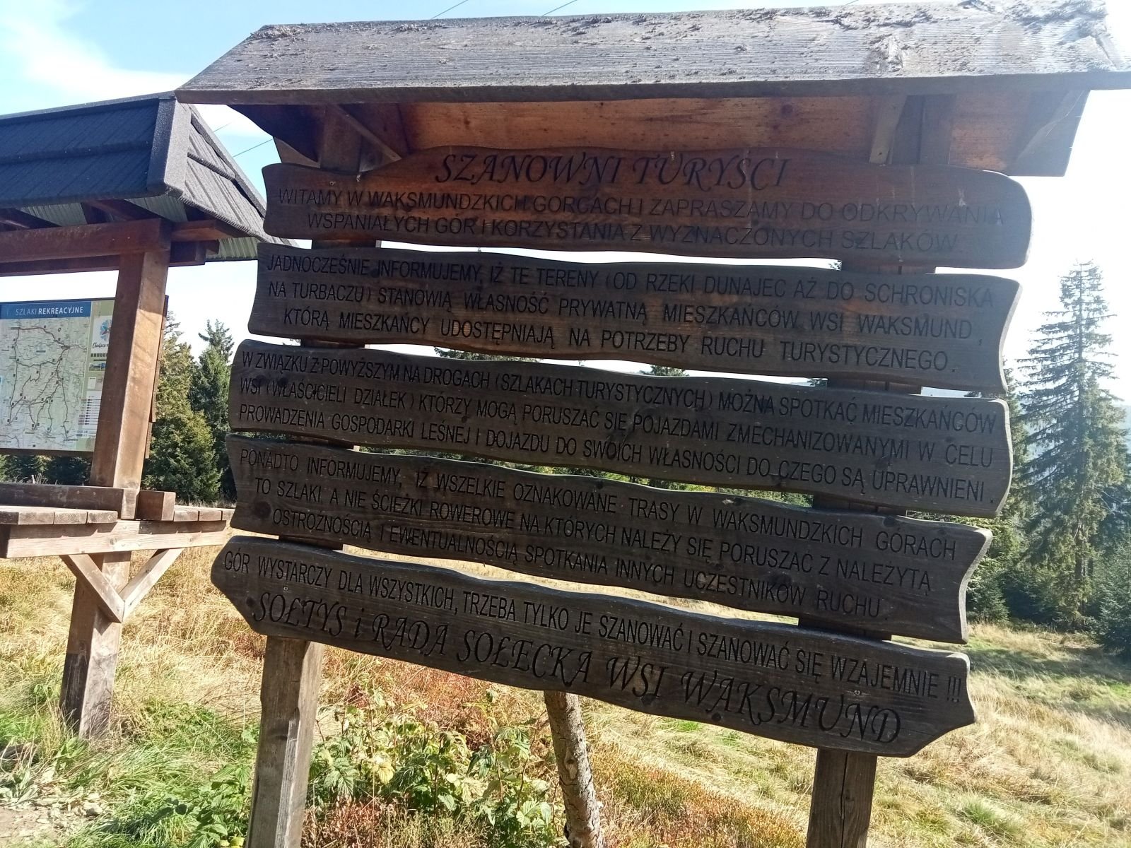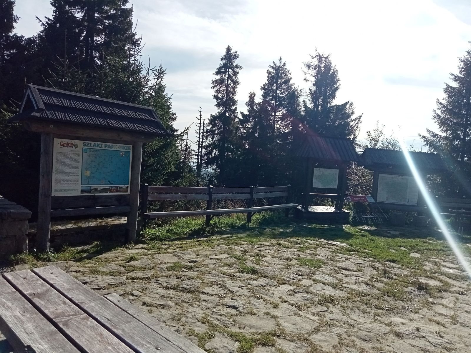 Wychodzimy z lasu z błotnistego fragmentu odcinka i przed nami wielka polana na, której znajduję się wieża widokowa na Magurkach.... choć sam szczyt jest nieco dalej. Po lewej drewniany gorczański szałas, czyli jakaś alternatywa, by przed opadami deszczu czy też burzą. Przy wieży znajduję się kamień...przepowiadający pogodę....Możecie go sobie zobaczyć w naszej galerii zdjęć. Fajna sprawa! Szczerze do tego etapu wyprawy nie zdążyliśmy się jeszcze zmęczyć, tak szło się przyjemnie z rana!