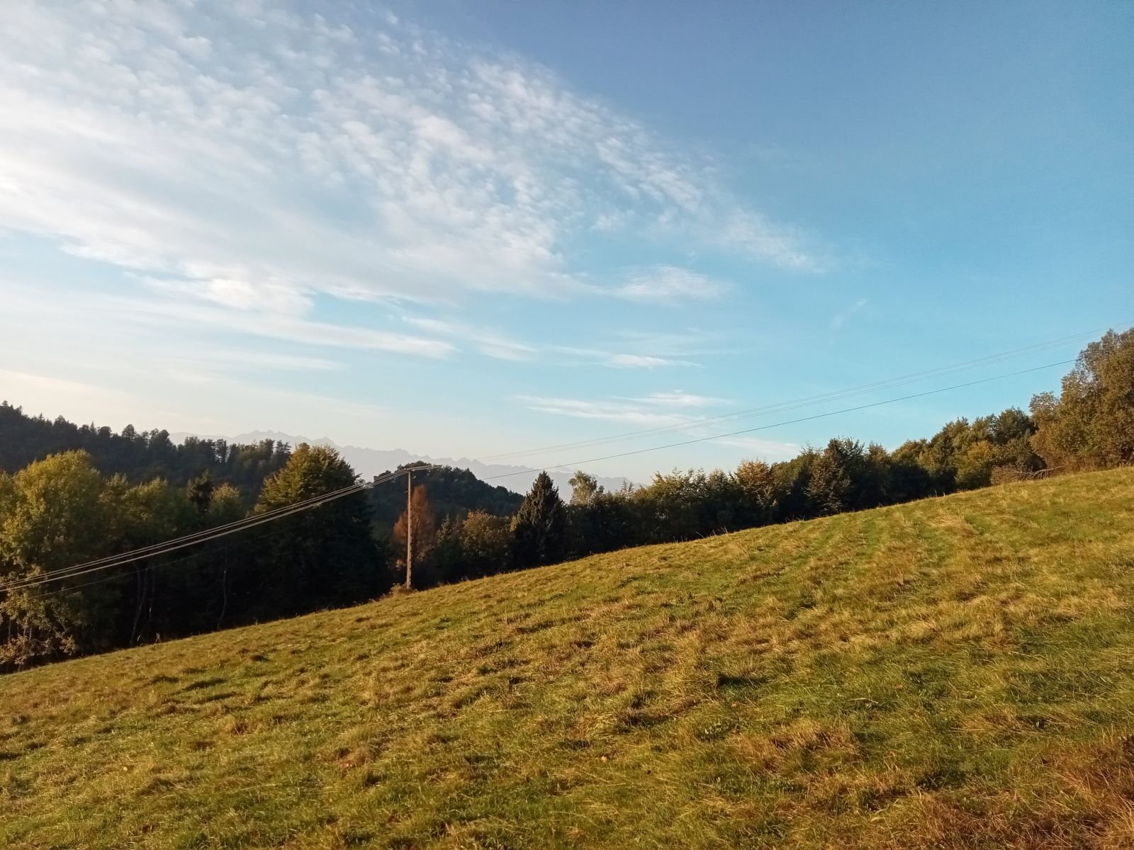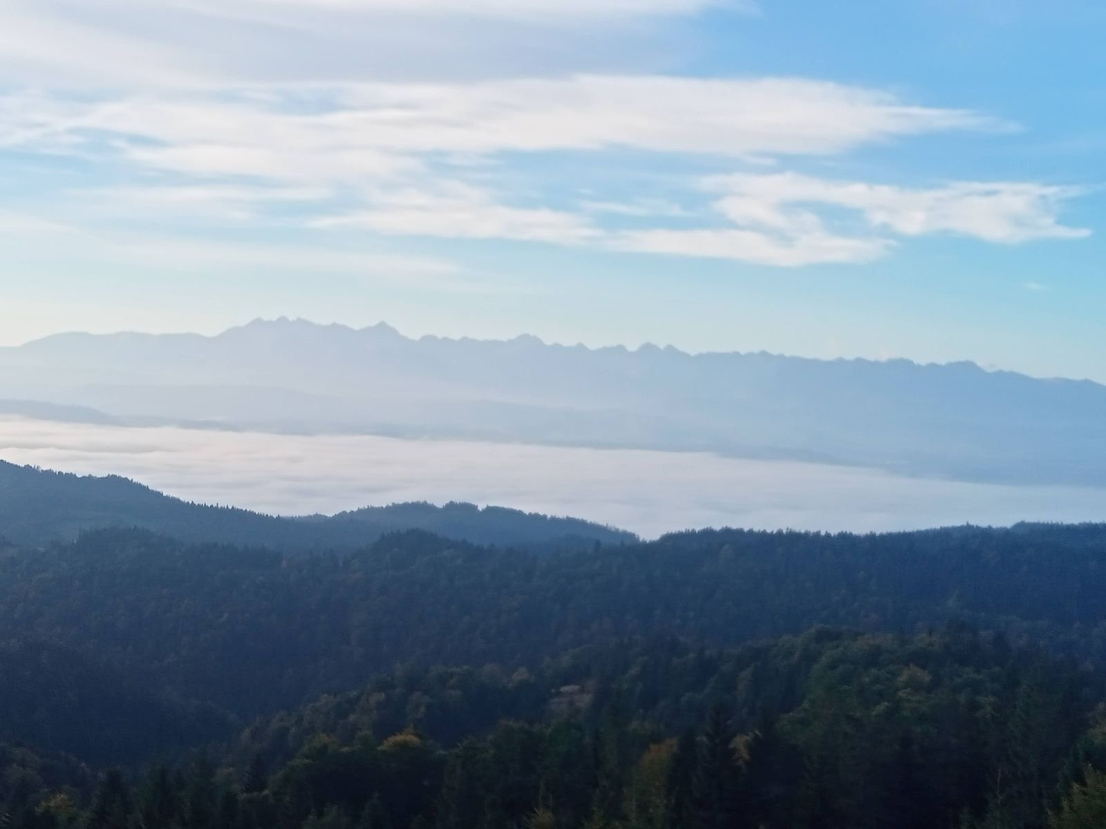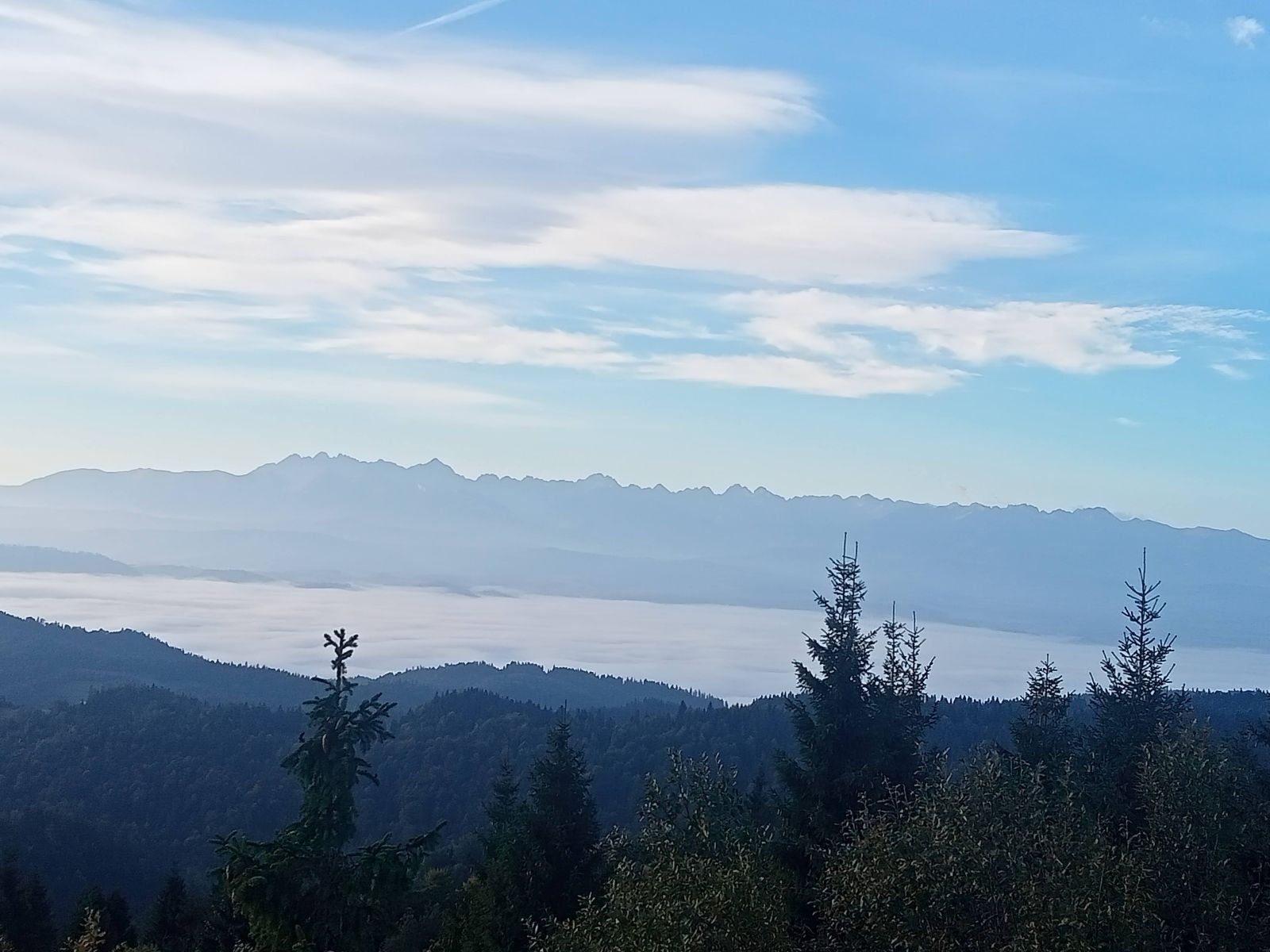 Miejsce z którego widać Tatry. Pogoda nam dopisała. Na szlaku znajdziemy nie jedną ławeczkę z której możemy podziwiać cudowne widoki. Nie ma wiatru, robi się coraz cieplej, idealnie... Idzie się idealnie, przeplatana ścieżka las-polana.