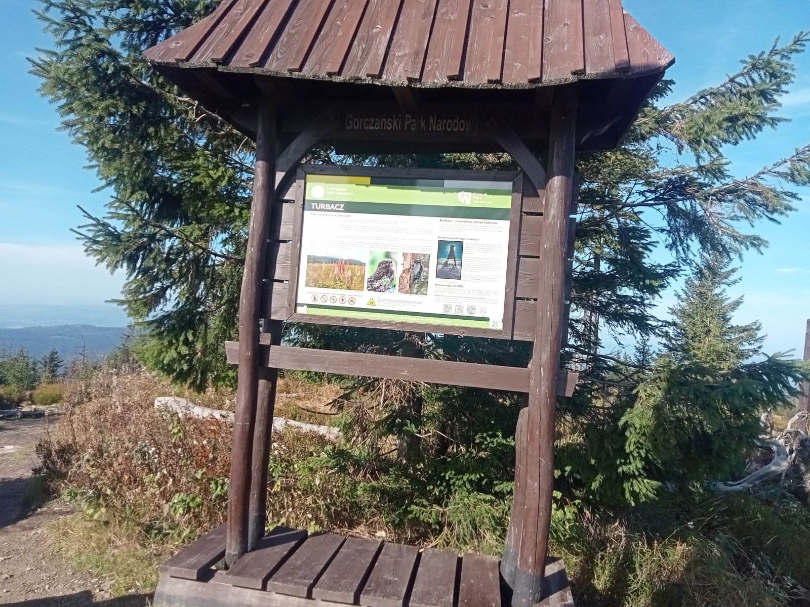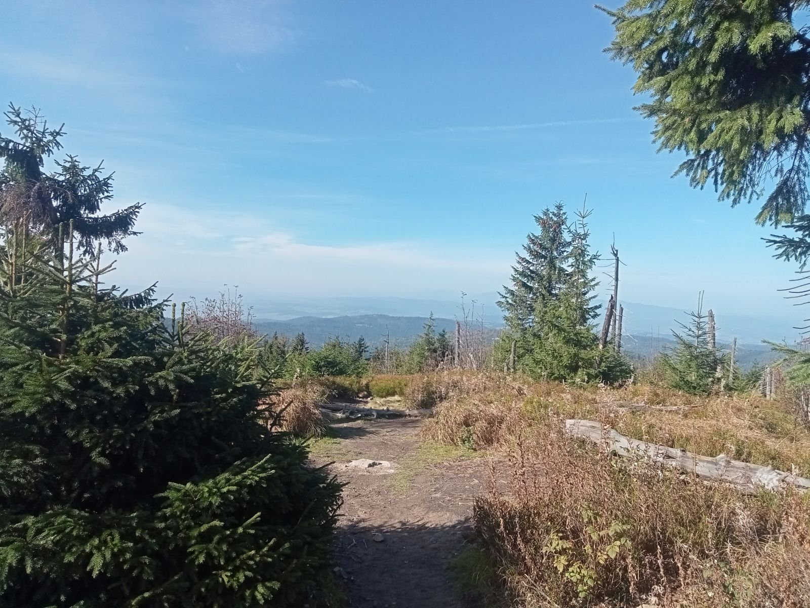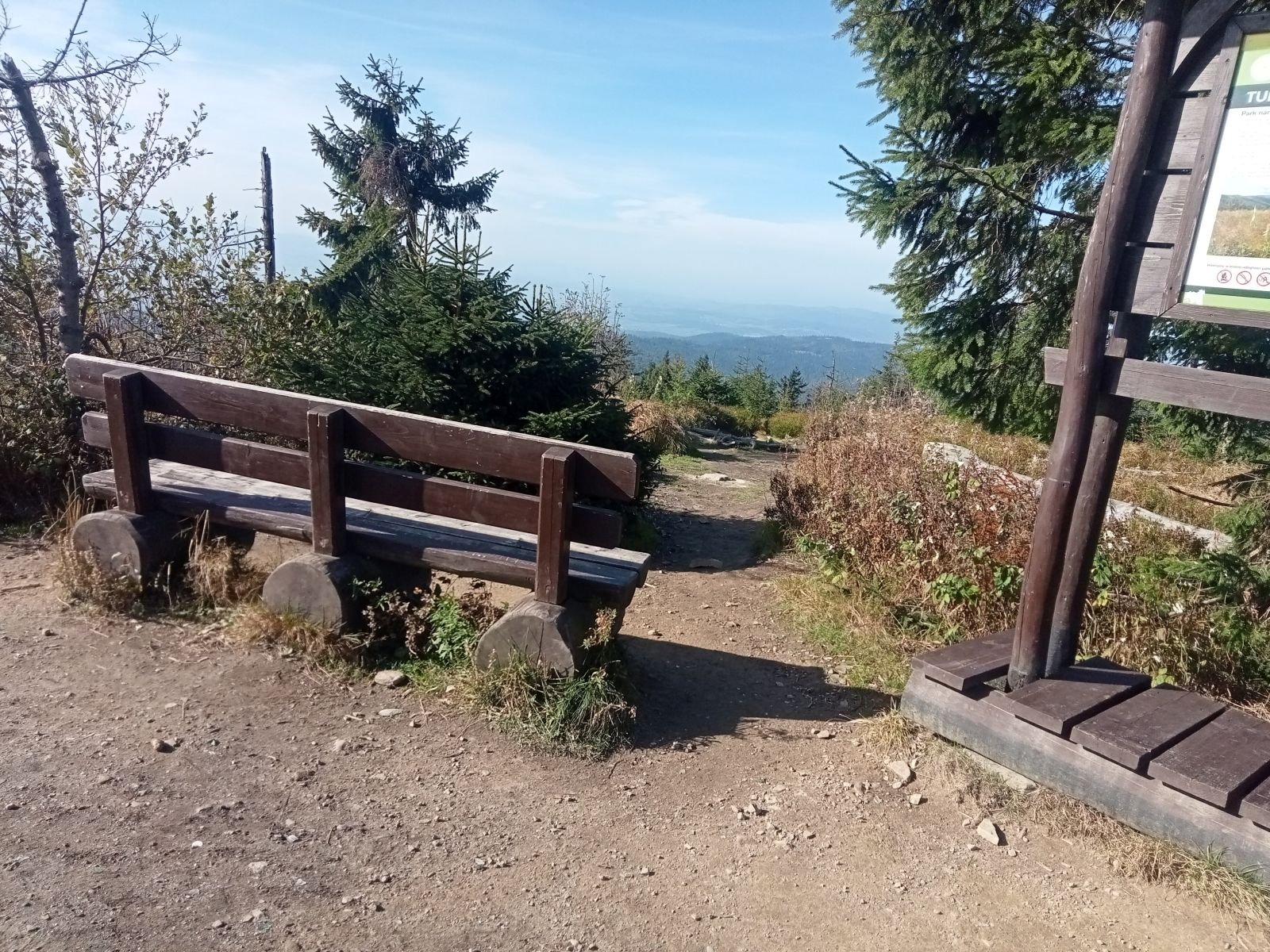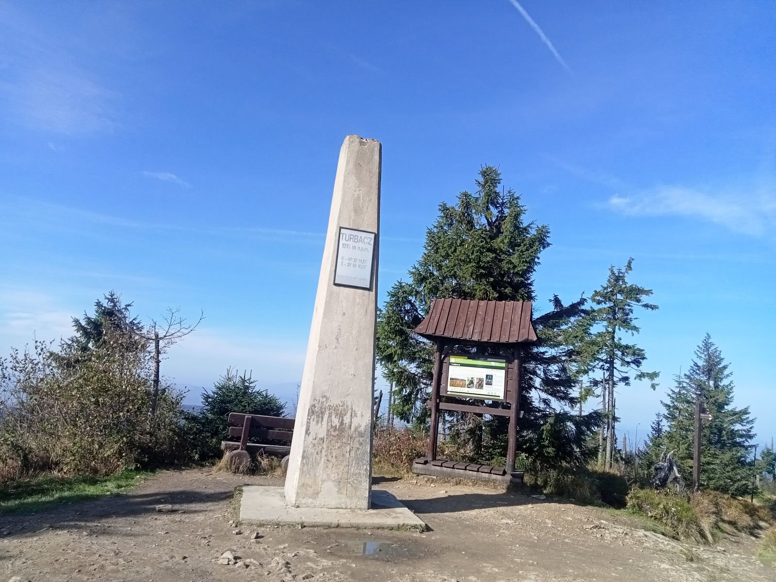 Turbacz szczyt. Sam ten szczyt jest chyba mniej popularny niż schronisko. Wiatr zrobił takie szkody, że przynajmniej coś stąd widać. Fajna jest ta ławeczka z lewej strony, można się zapatrzeć...