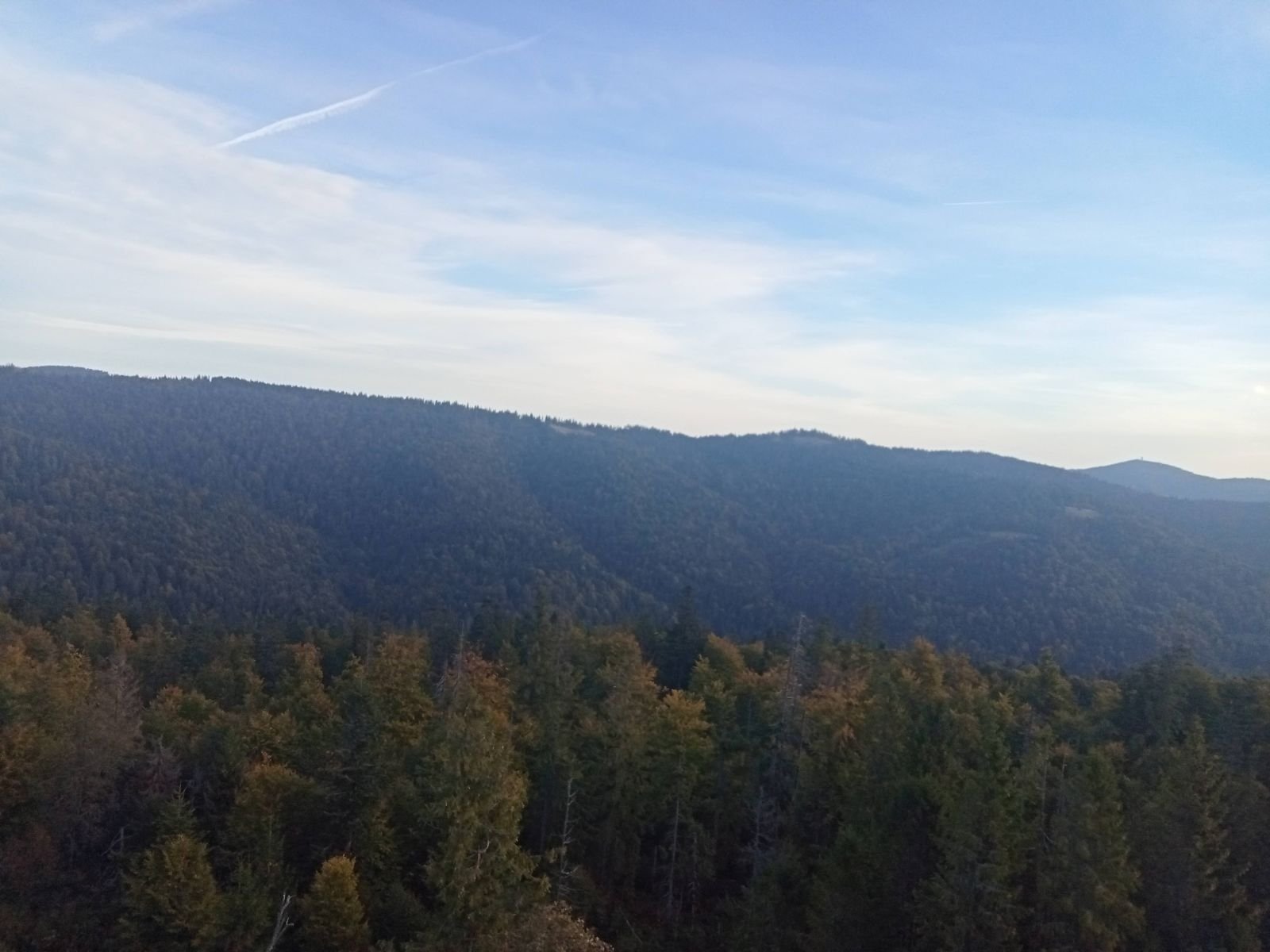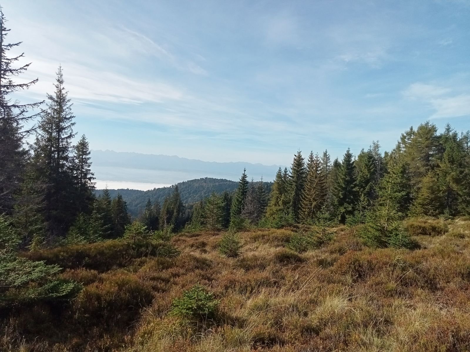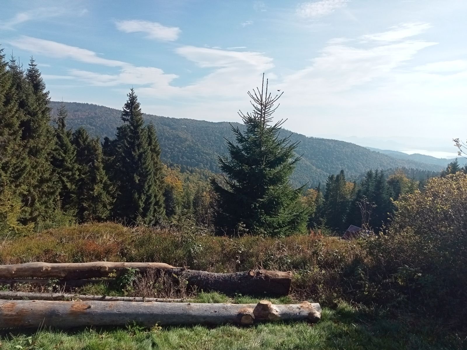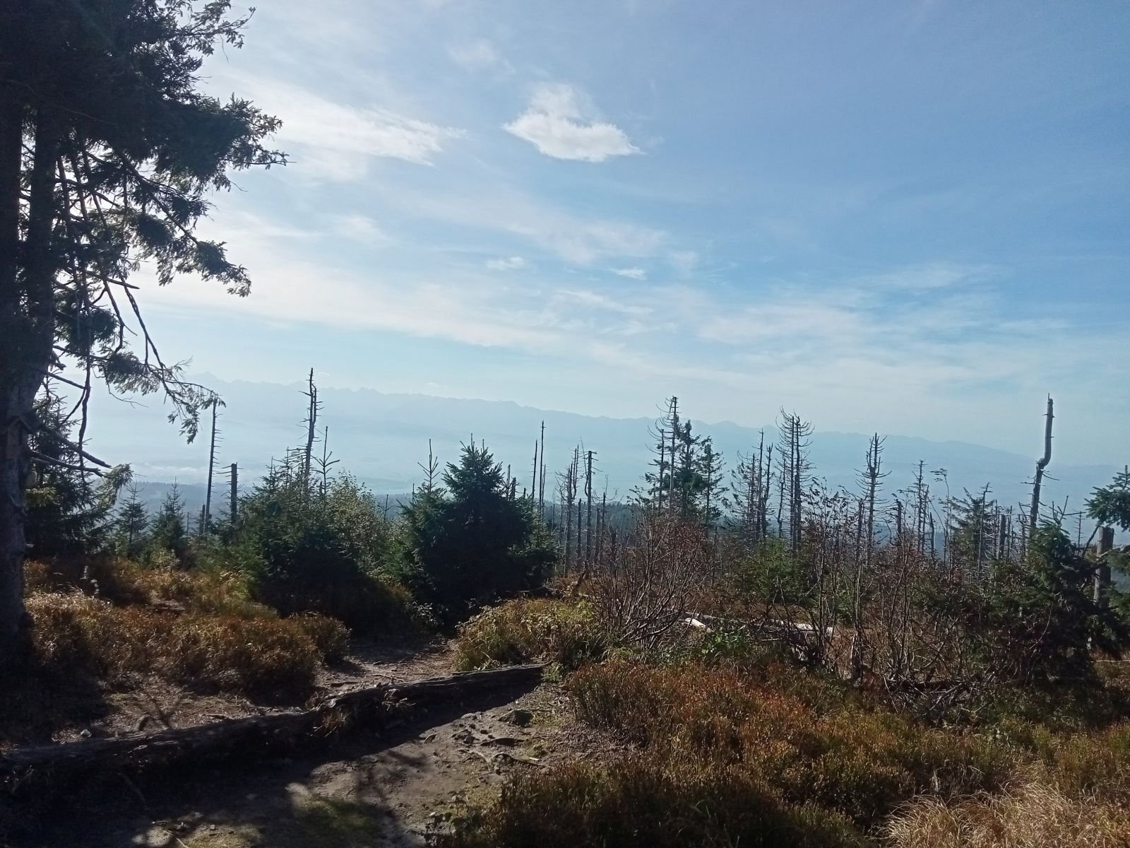 Turbacz szczyt. Sam ten szczyt jest chyba mniej popularny niż schronisko. Wiatr zrobił takie szkody, że przynajmniej coś stąd widać. Fajna jest ta ławeczka z lewej strony, można się zapatrzeć...