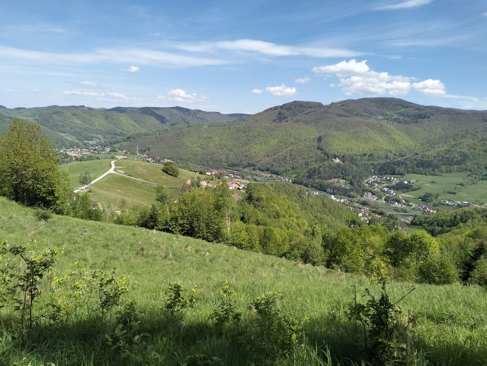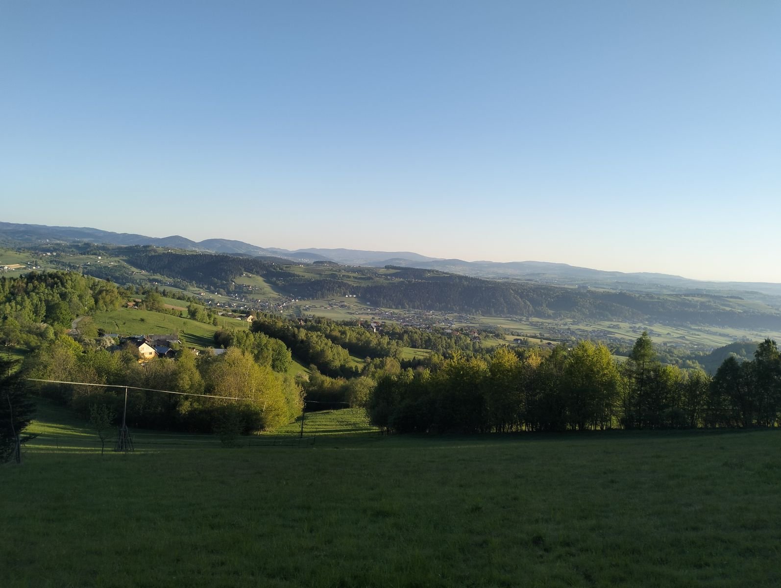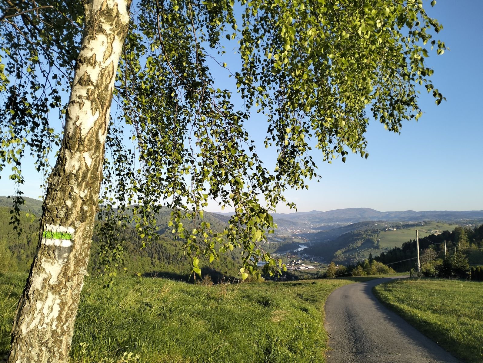 Zielony szlak z Jazowska jak widnieje na tabliczce startowej to 3 godziny 30 minut. Patrząc na inne szlaki ten podany czas jest zawyżony. Mijamy most nad Dunajcem, przechodzimy przez Łazy Brzyńskie asfaltem i kierujemy się w stronę lasu. Stąd jak widać na zdjęciu piękny widok m.in. na Łącko, nie wspominając o paśmie Gorców. Dostrzec można także wieże na Koziarzu i Lubaniu.
