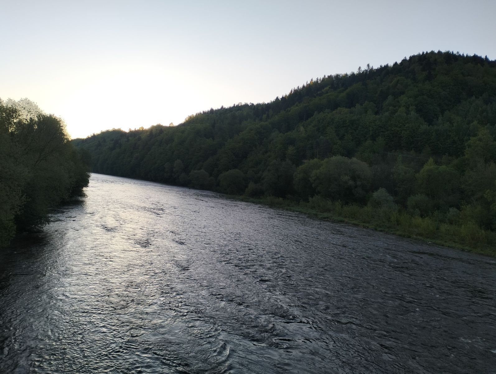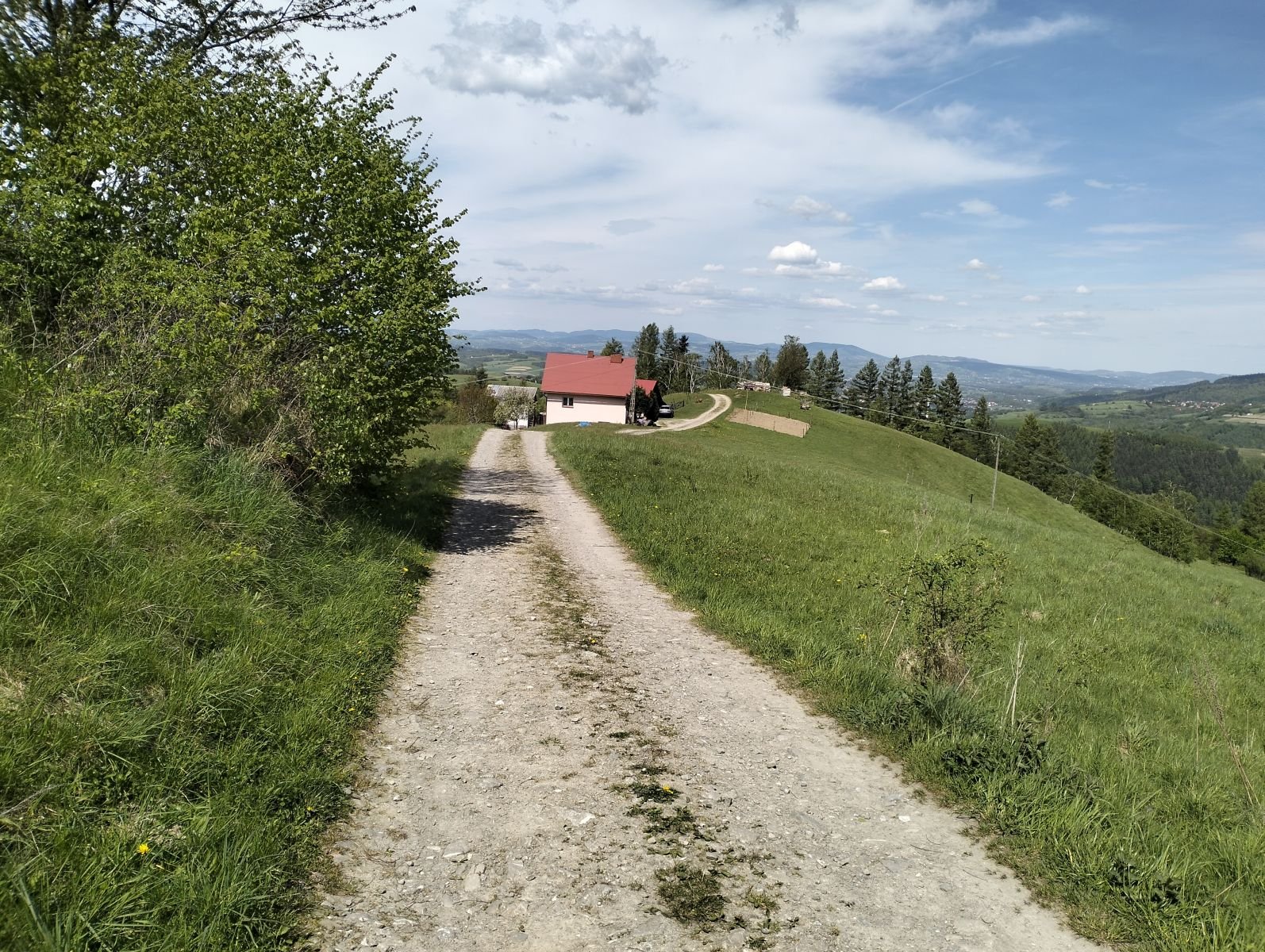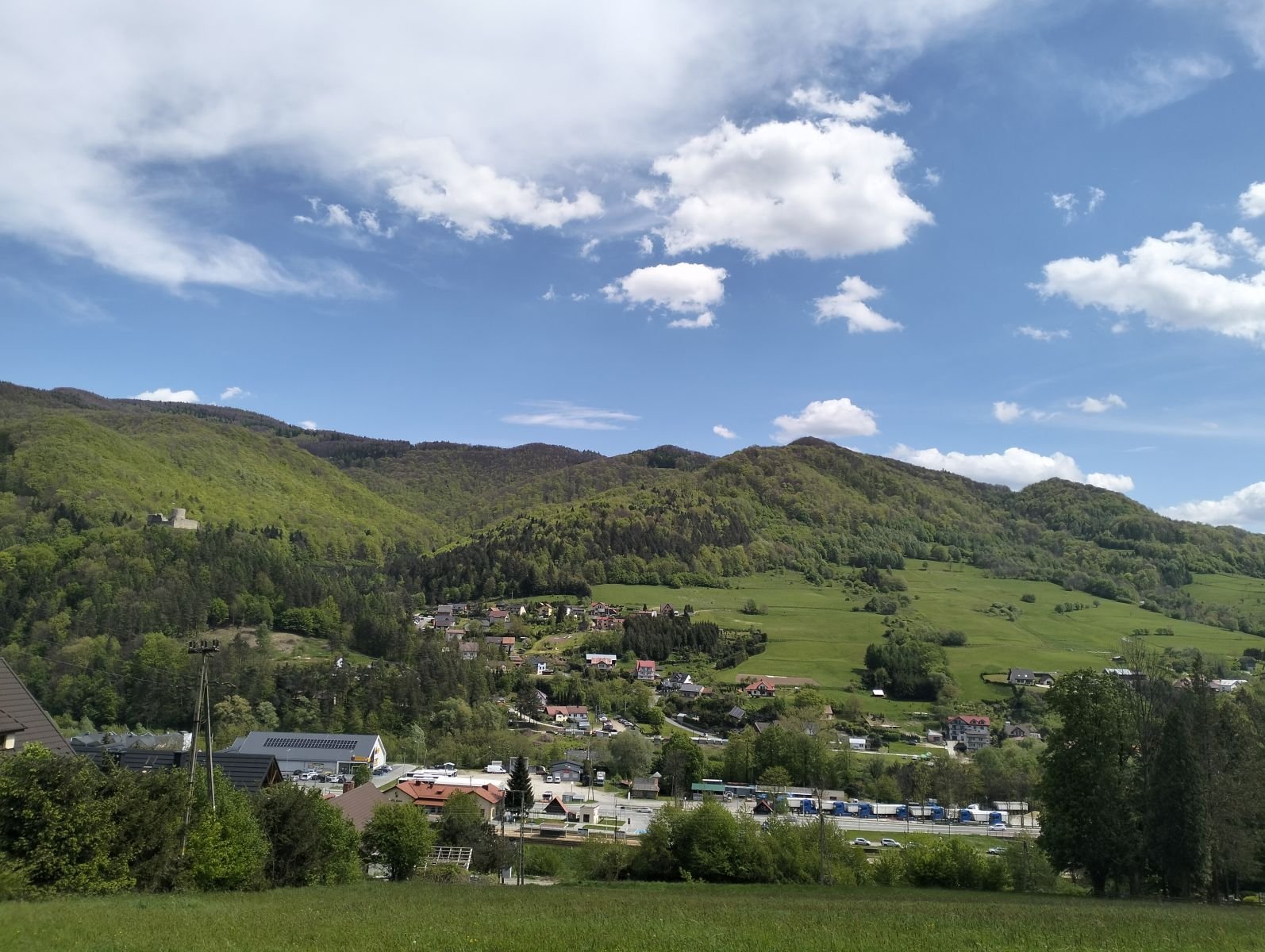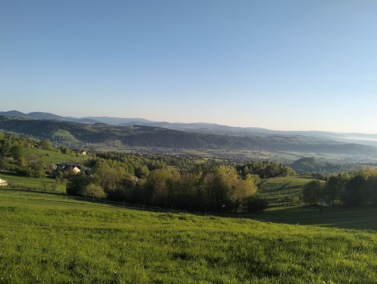 Zielony szlak z Jazowska jak widnieje na tabliczce startowej to 3 godziny 30 minut. Patrząc na inne szlaki ten podany czas jest zawyżony. Mijamy most nad Dunajcem, przechodzimy przez Łazy Brzyńskie asfaltem i kierujemy się w stronę lasu. Stąd jak widać na zdjęciu piękny widok m.in. na Łącko, nie wspominając o paśmie Gorców. Dostrzec można także wieże na Koziarzu i Lubaniu.