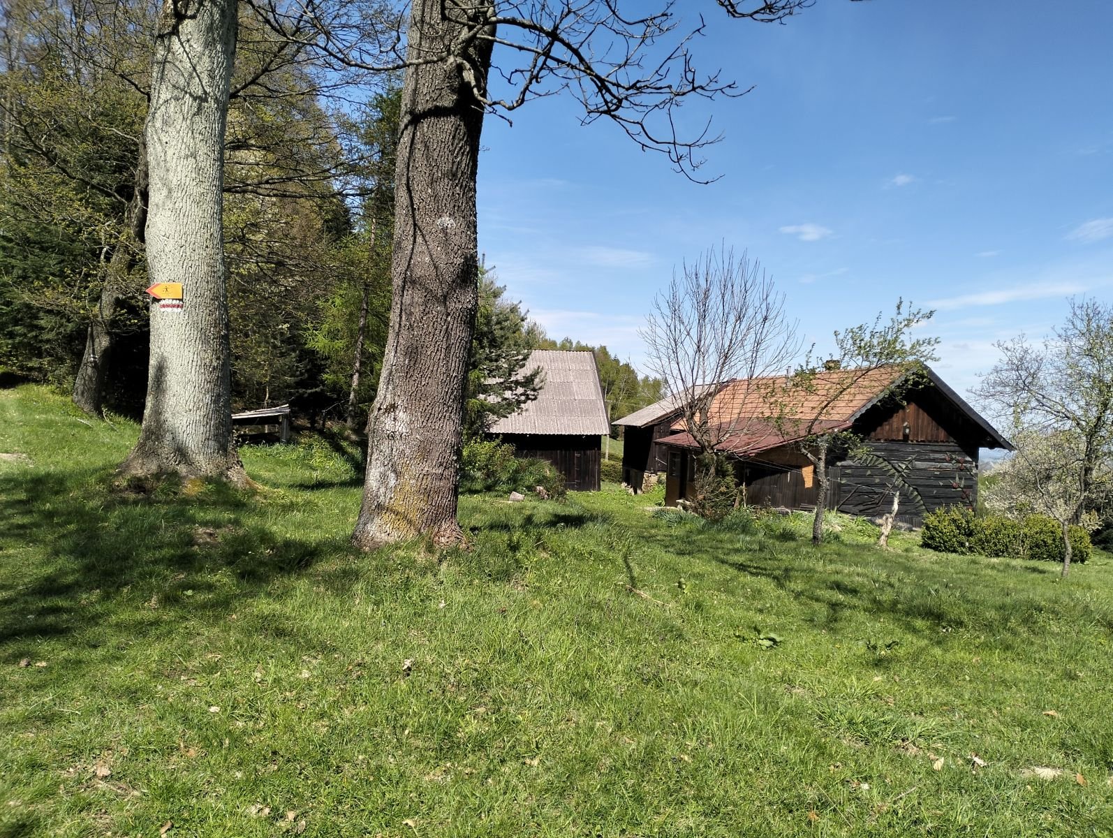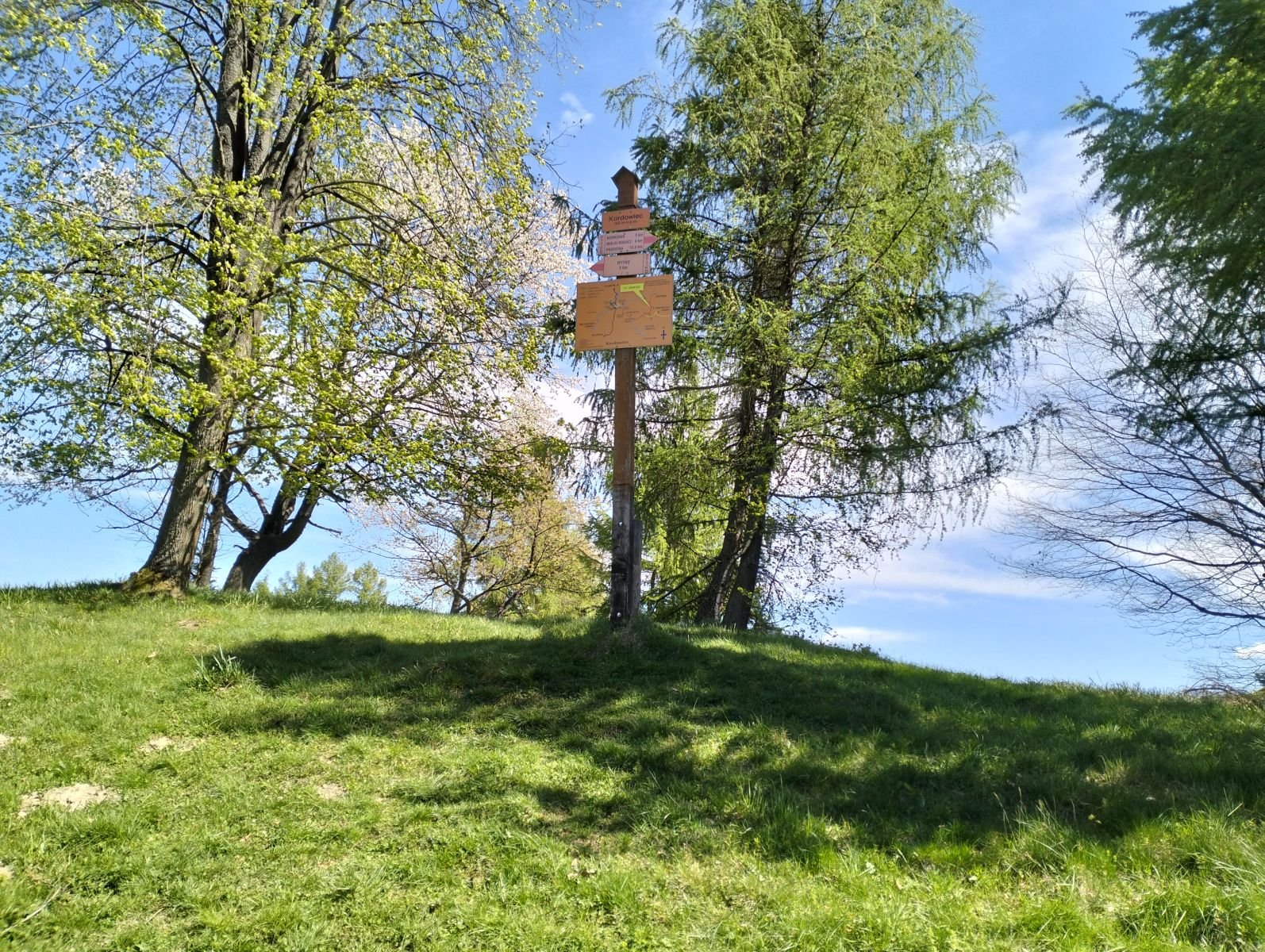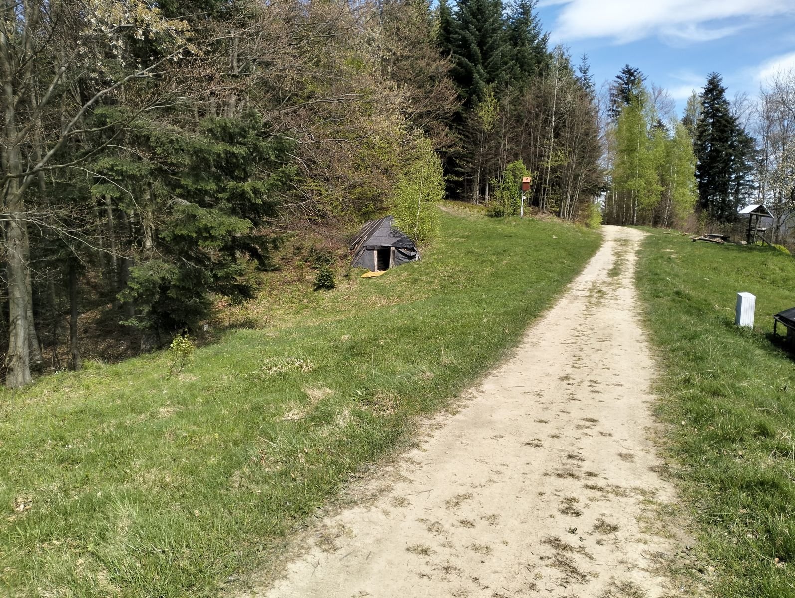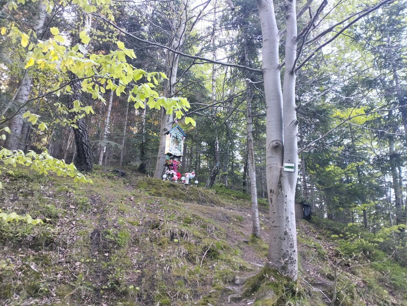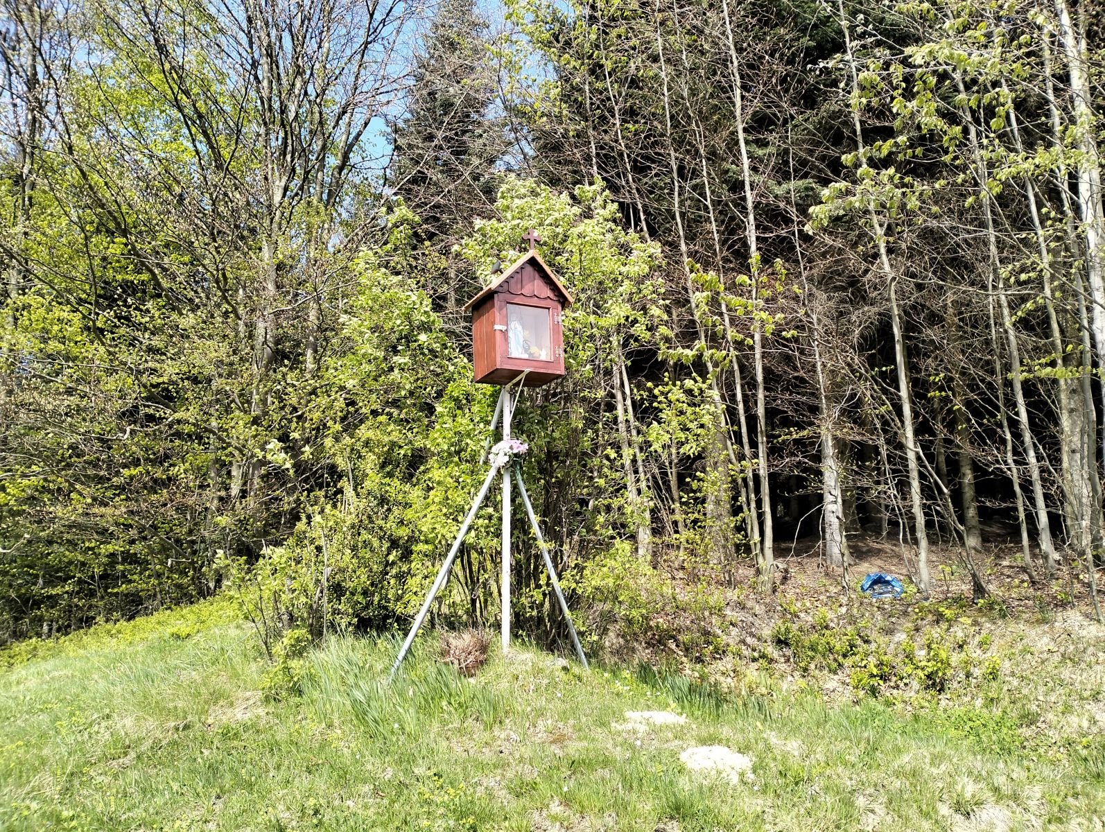 Mijamy zabudowania, na chwilę zatrzymujemy się, by porozmawiać ze starszą Panią, która opowiada znakomite historię m.in. historię kapliczki, która jest kilkanaście metrów dalej i tam też polecamy zrobić sobie przerwę. Jak widać na zdjęciu są osoby, które już słuchają opowieści. Jak będziecie schodzić tym miejscem, warto wypatrywać tej Pani.
