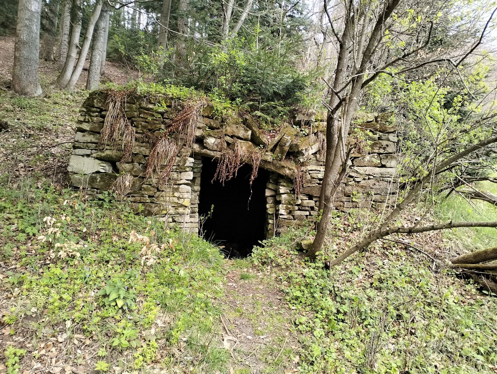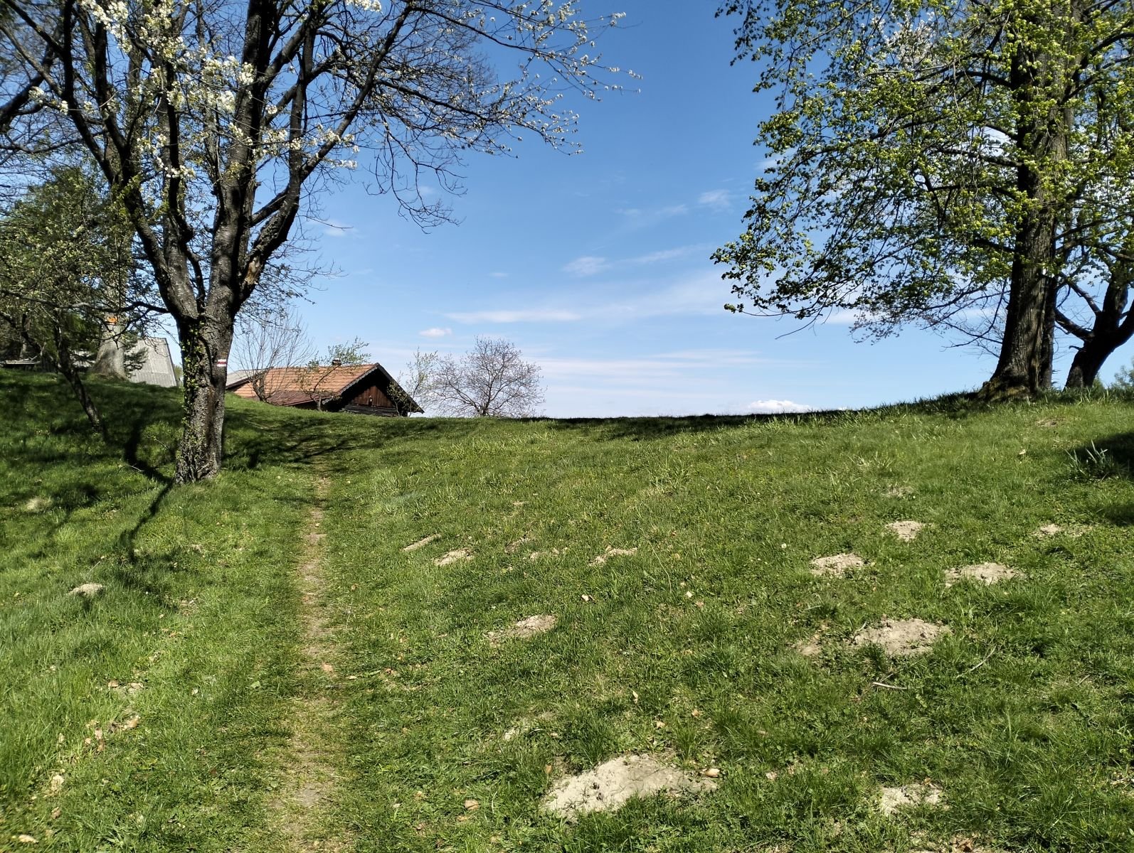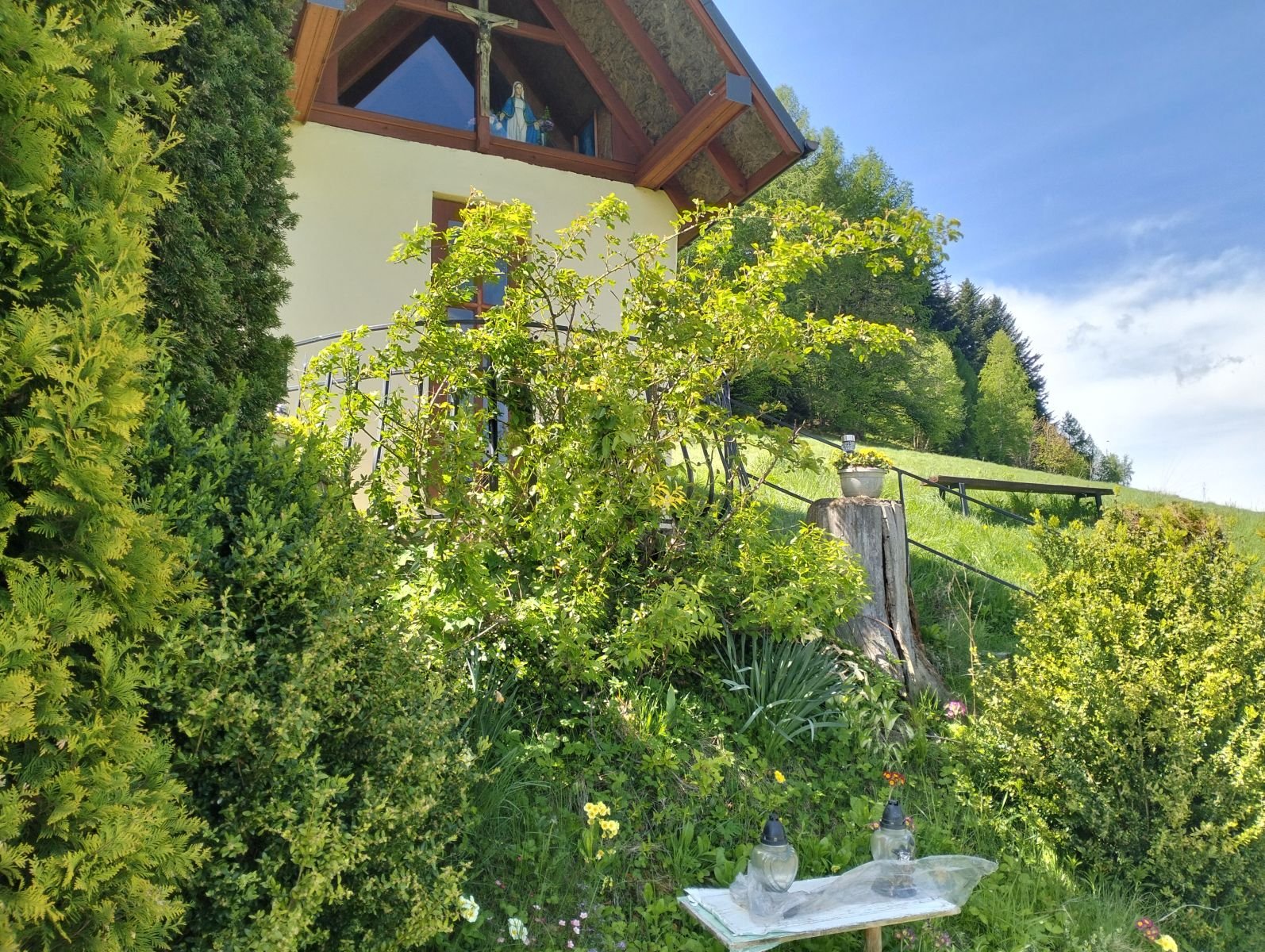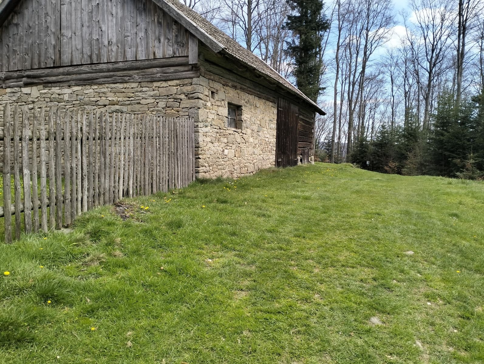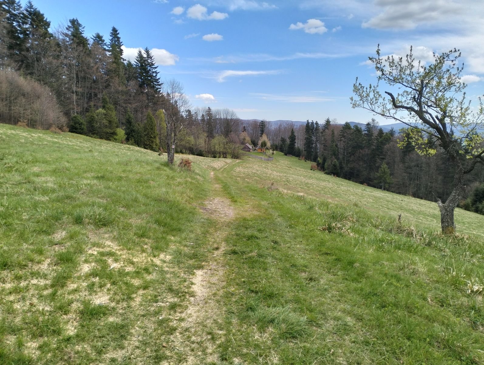 Mijamy zabudowania, na chwilę zatrzymujemy się, by porozmawiać ze starszą Panią, która opowiada znakomite historię m.in. historię kapliczki, która jest kilkanaście metrów dalej i tam też polecamy zrobić sobie przerwę. Jak widać na zdjęciu są osoby, które już słuchają opowieści. Jak będziecie schodzić tym miejscem, warto wypatrywać tej Pani.