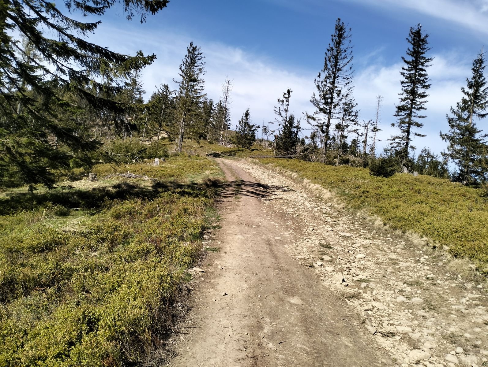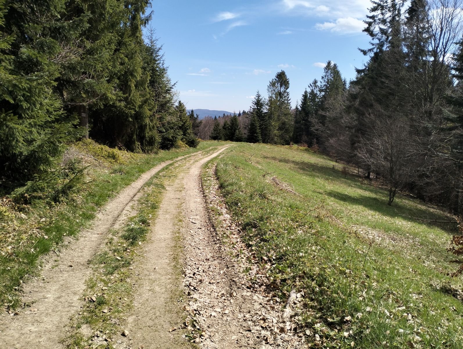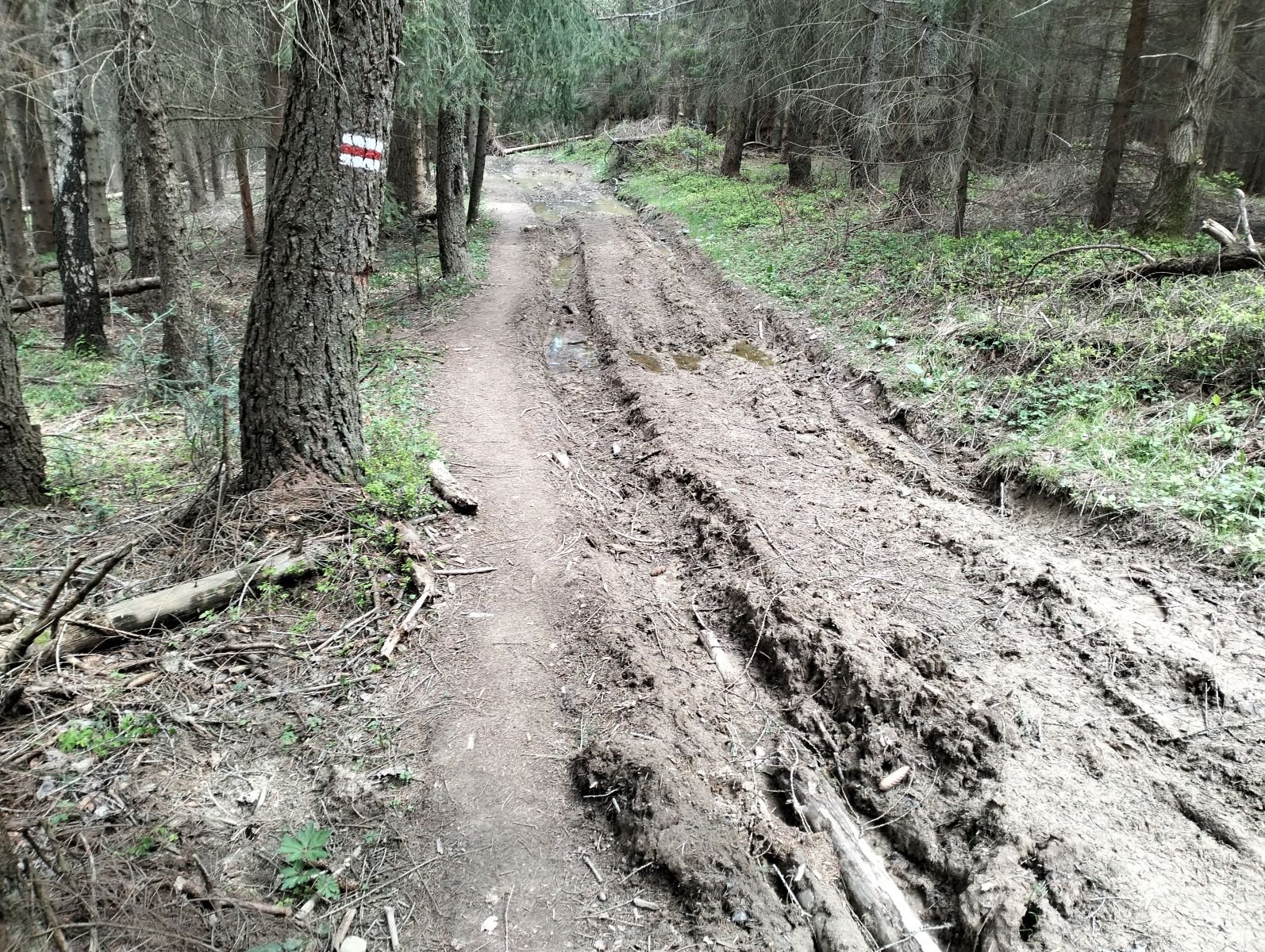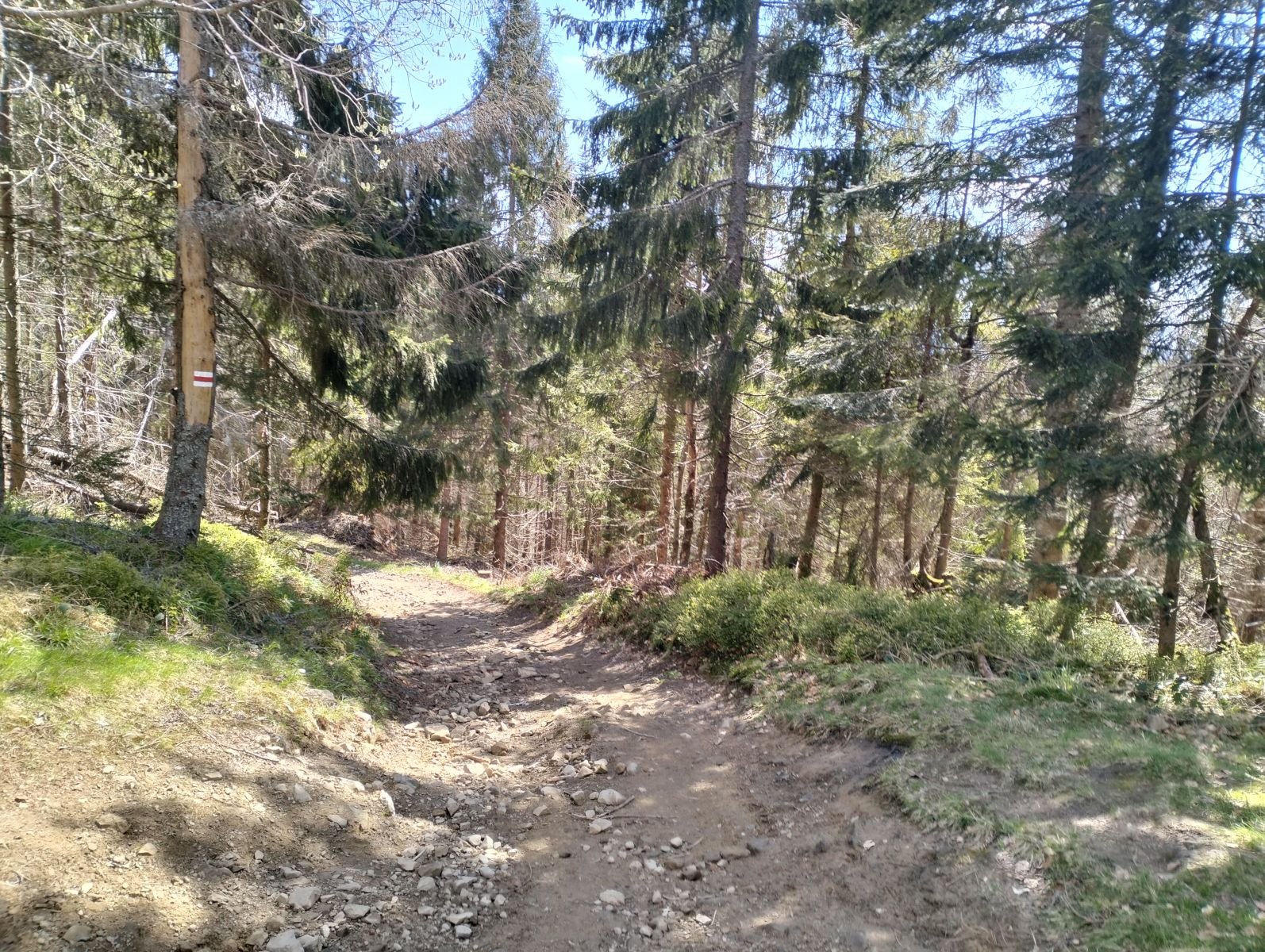 Skręcamy na słynny czerwony szlak, którym podąża kultowy najdłuższy szlak w Polsce GSB. Do samego Rytra albo idziemy płaską drogą, albo schodzimy w dół.