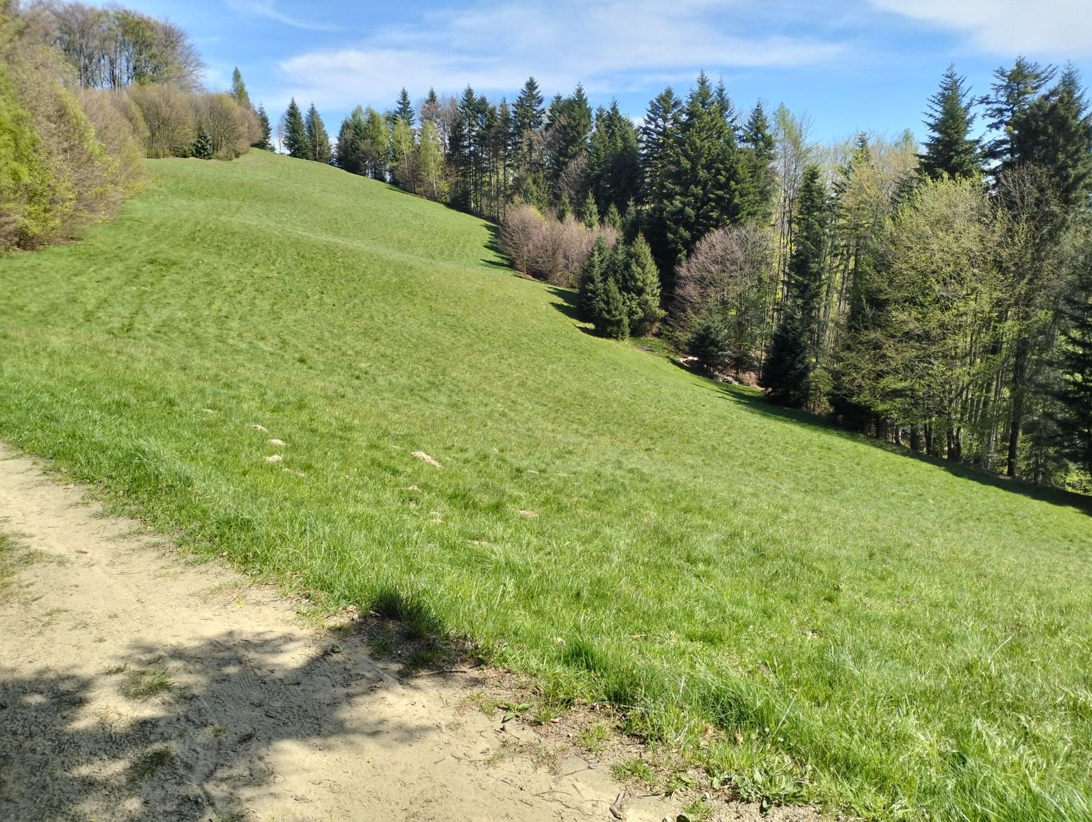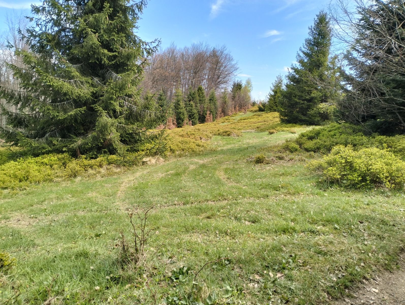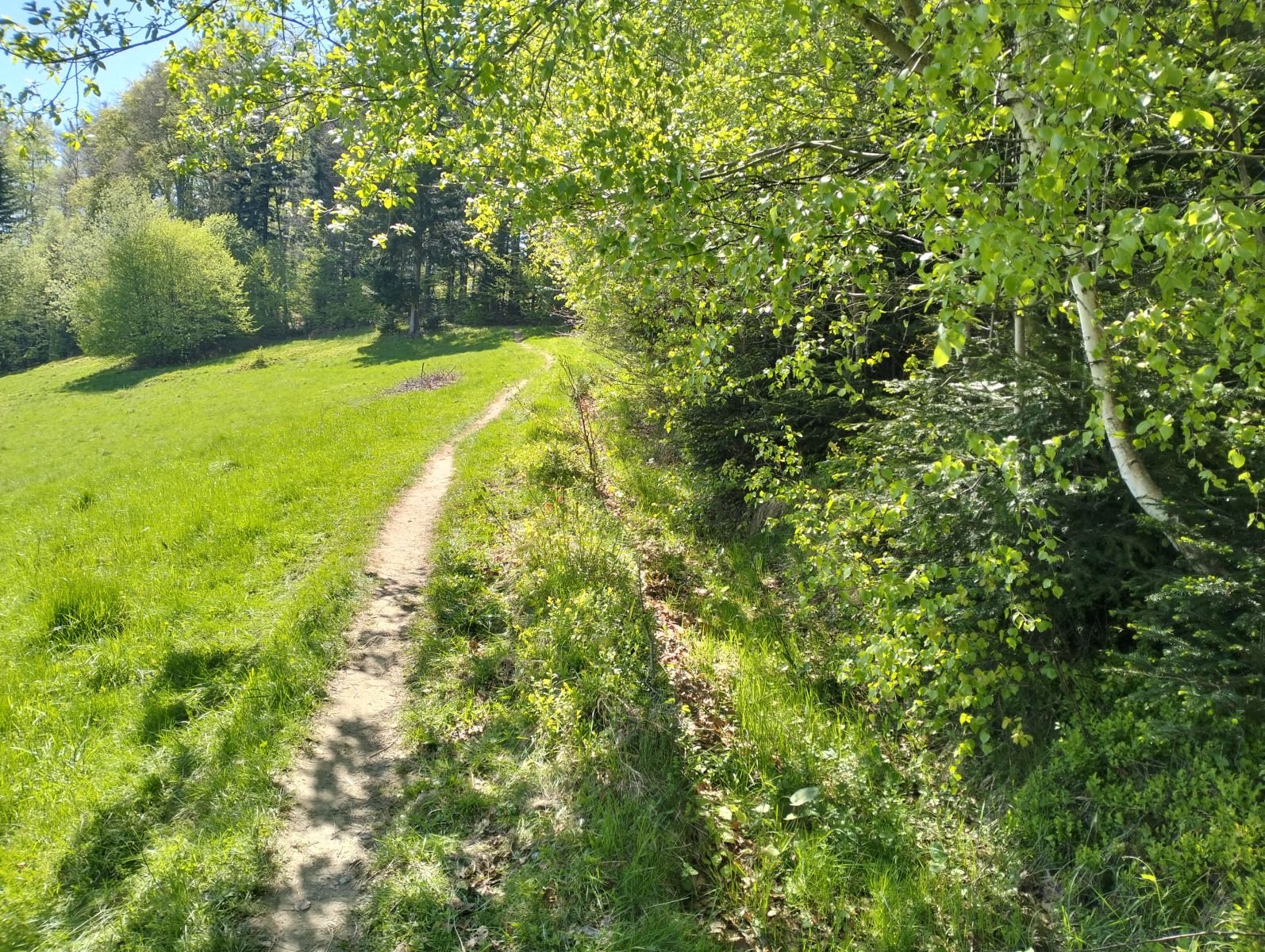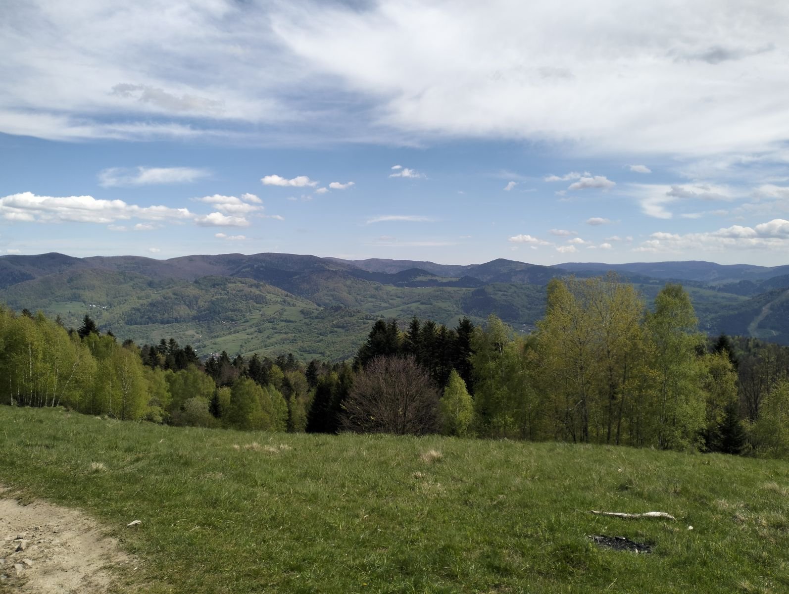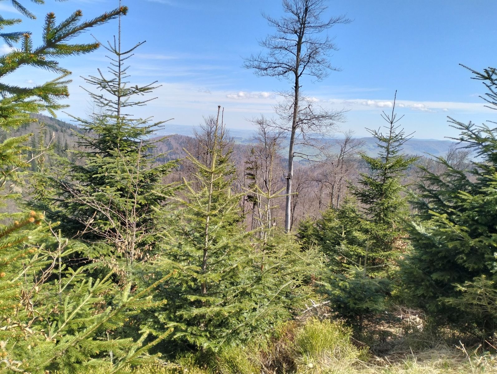 Praktycznie jedyny widok na szlaku jest coraz bardziej zalesiony. Za kilka lat nic tu nie zobaczymy. W tym miejscu co ciekawe rośnie ... czosnek niedźwiedzi.