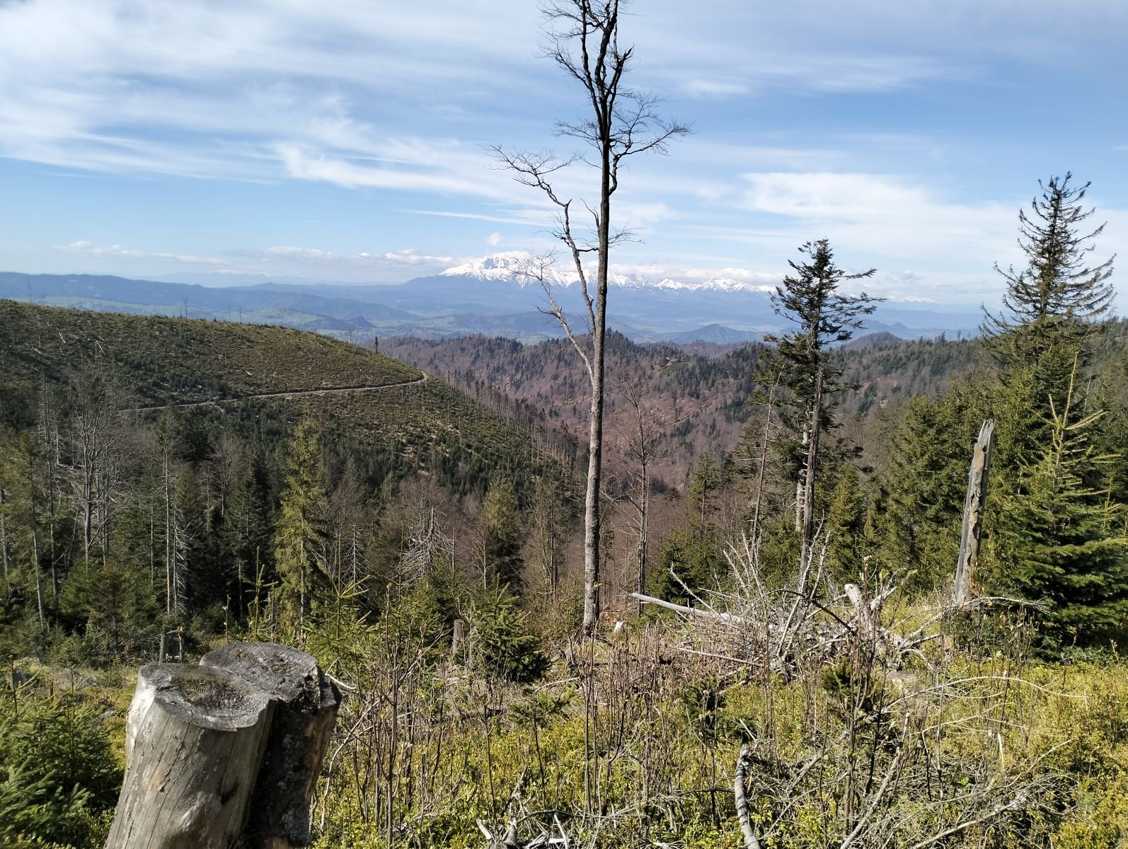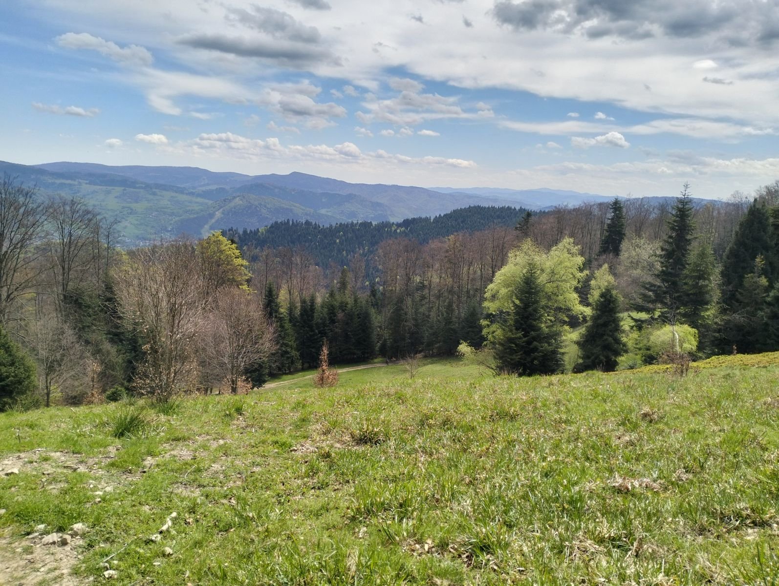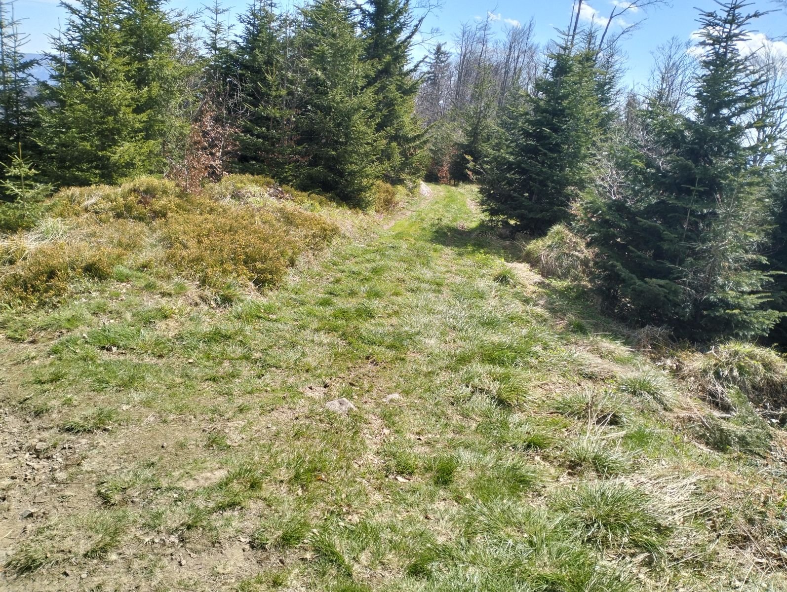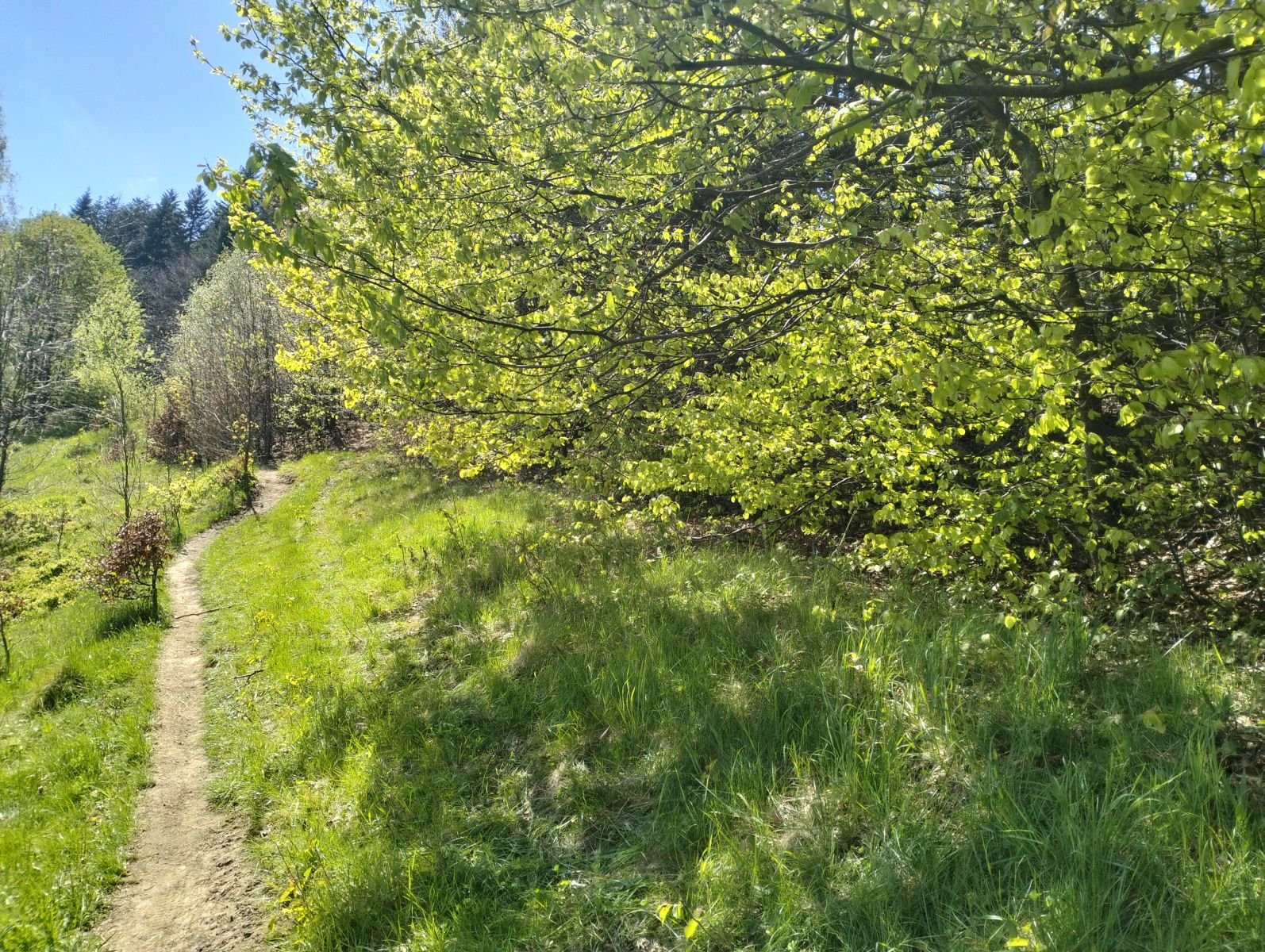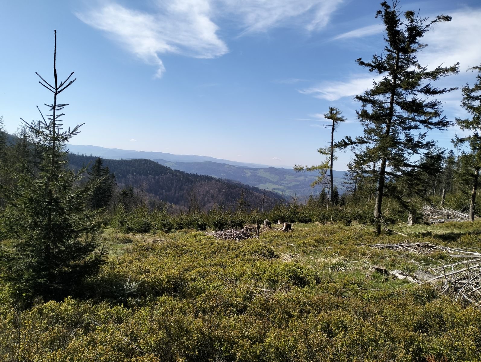 Praktycznie jedyny widok na szlaku jest coraz bardziej zalesiony. Za kilka lat nic tu nie zobaczymy. W tym miejscu co ciekawe rośnie ... czosnek niedźwiedzi.