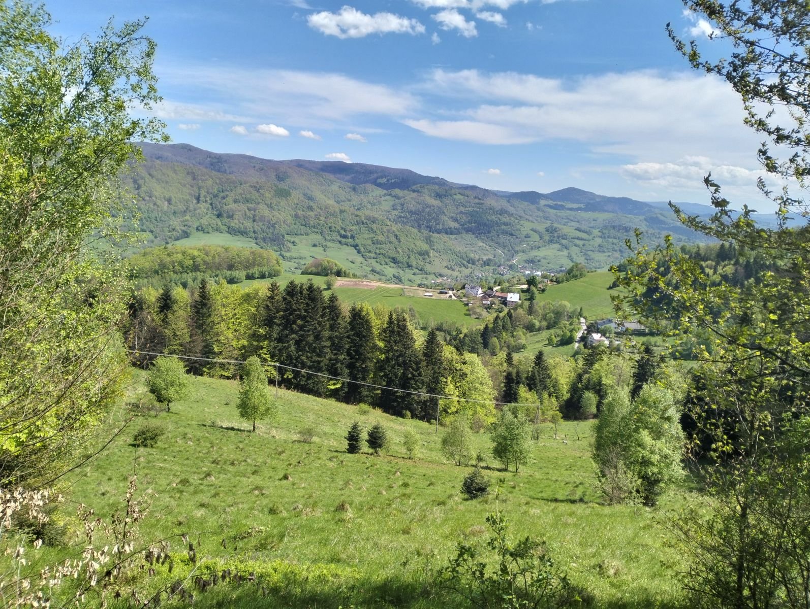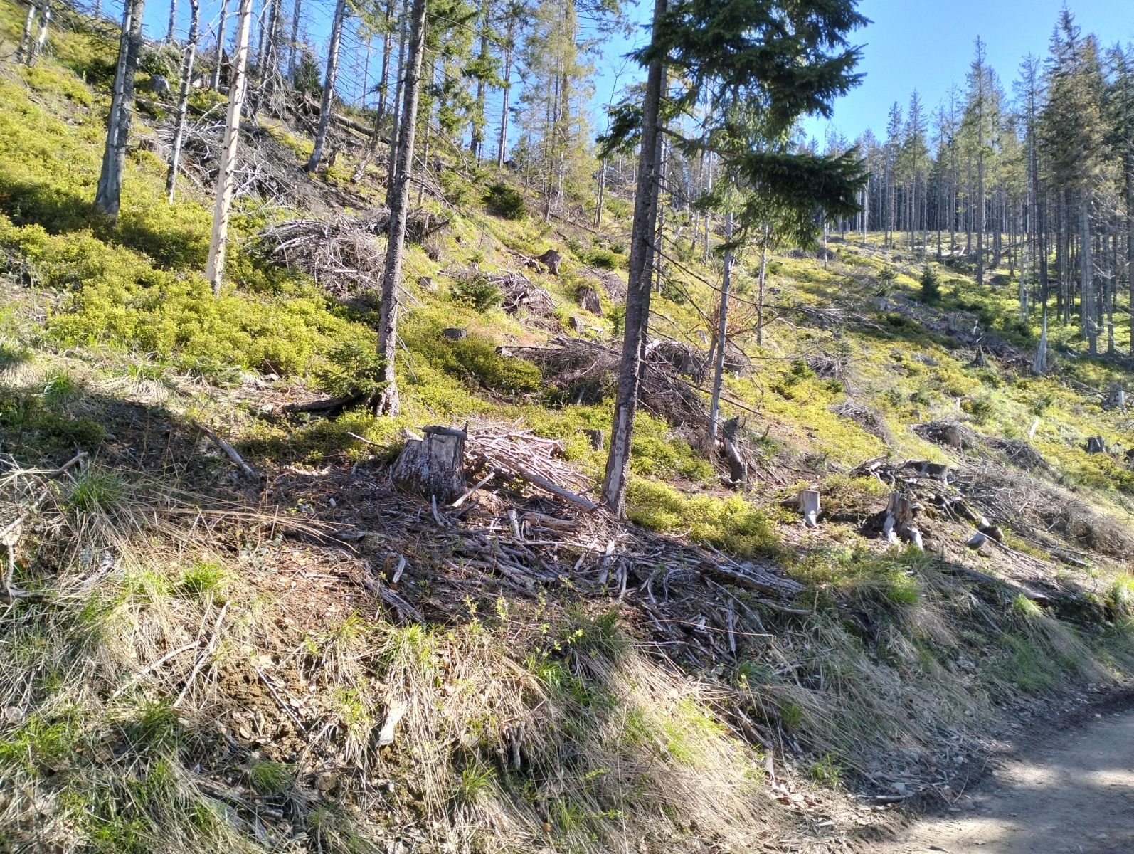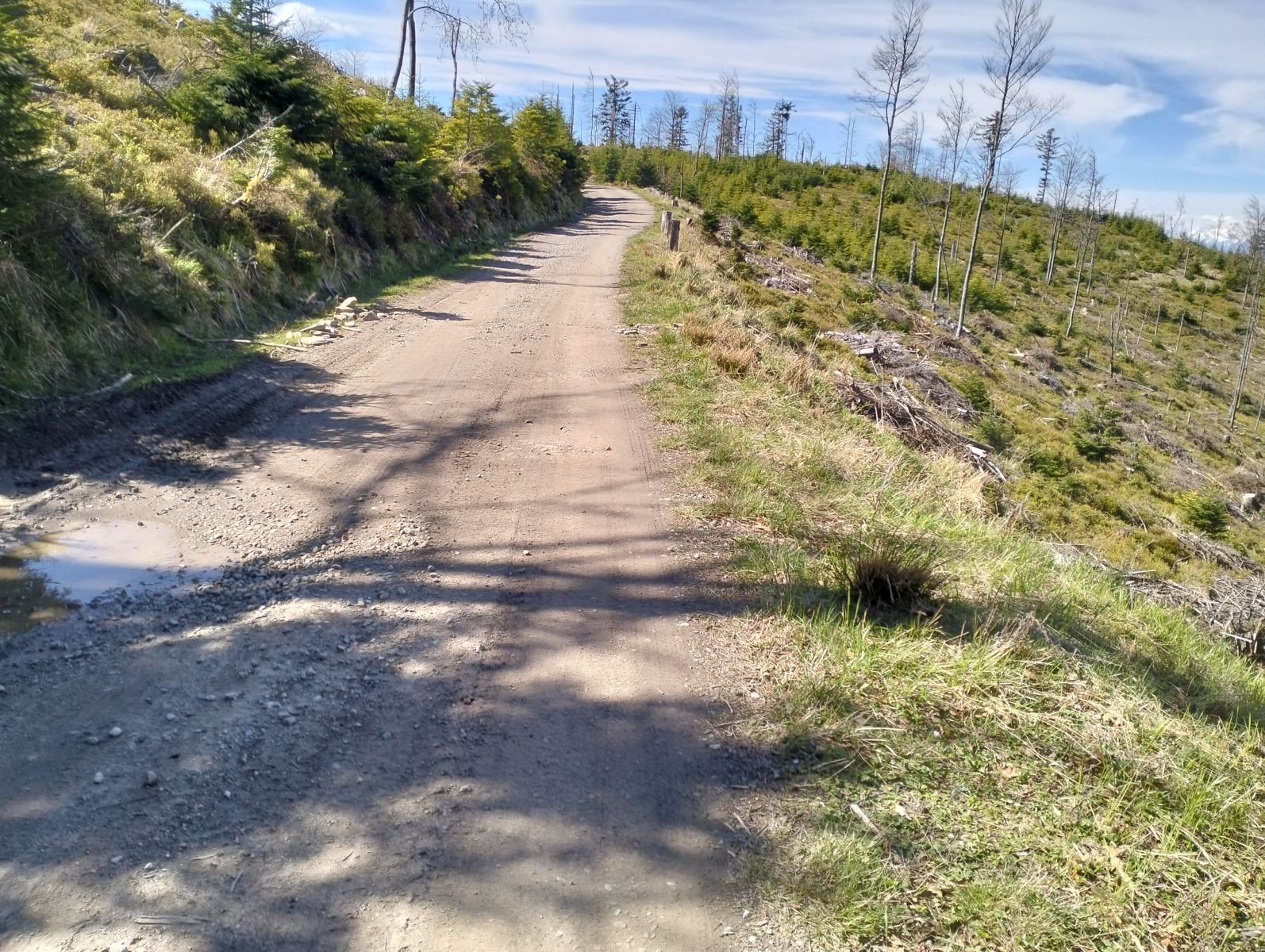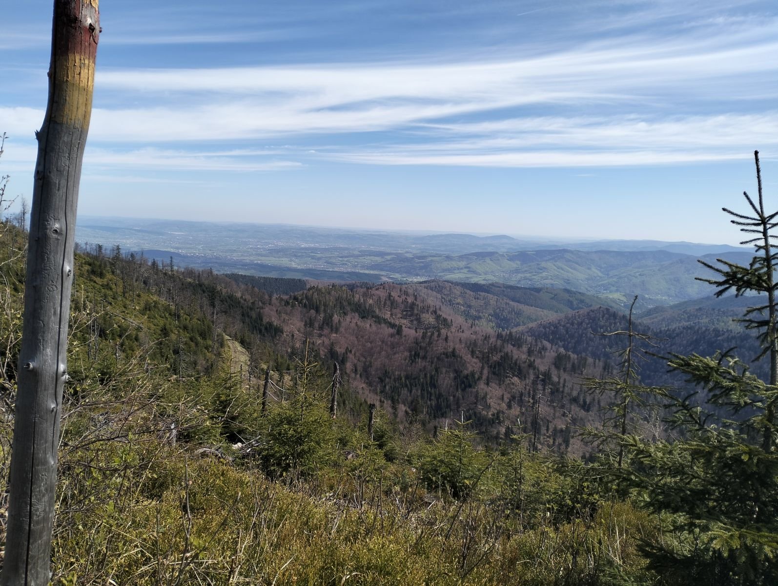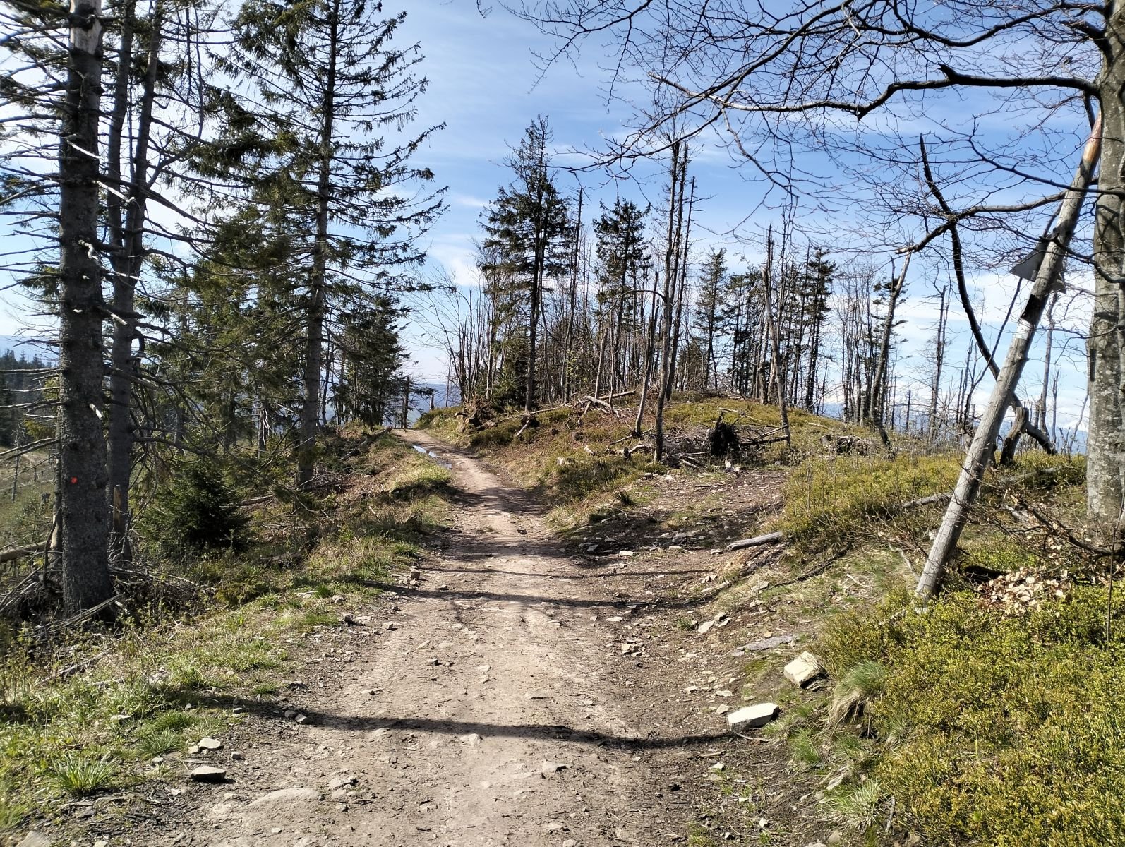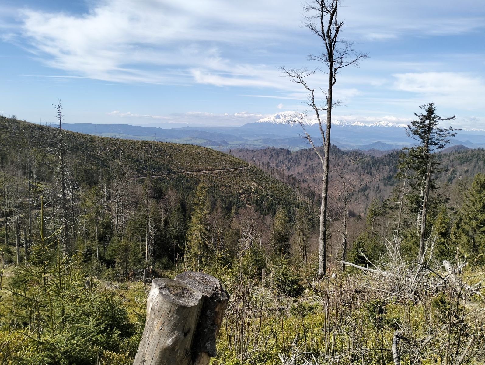 Praktycznie jedyny widok na szlaku jest coraz bardziej zalesiony. Za kilka lat nic tu nie zobaczymy. W tym miejscu co ciekawe rośnie ... czosnek niedźwiedzi.