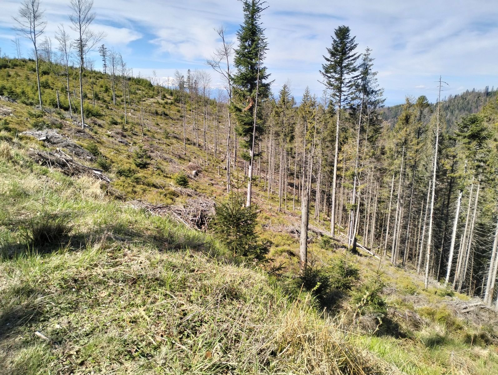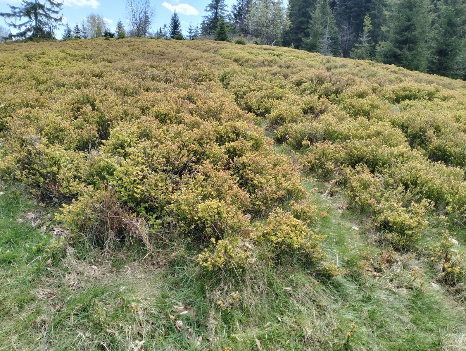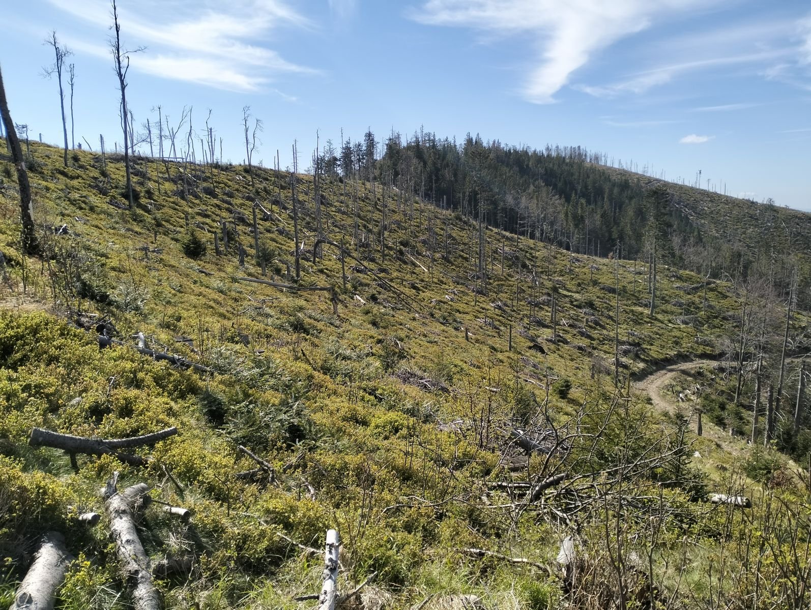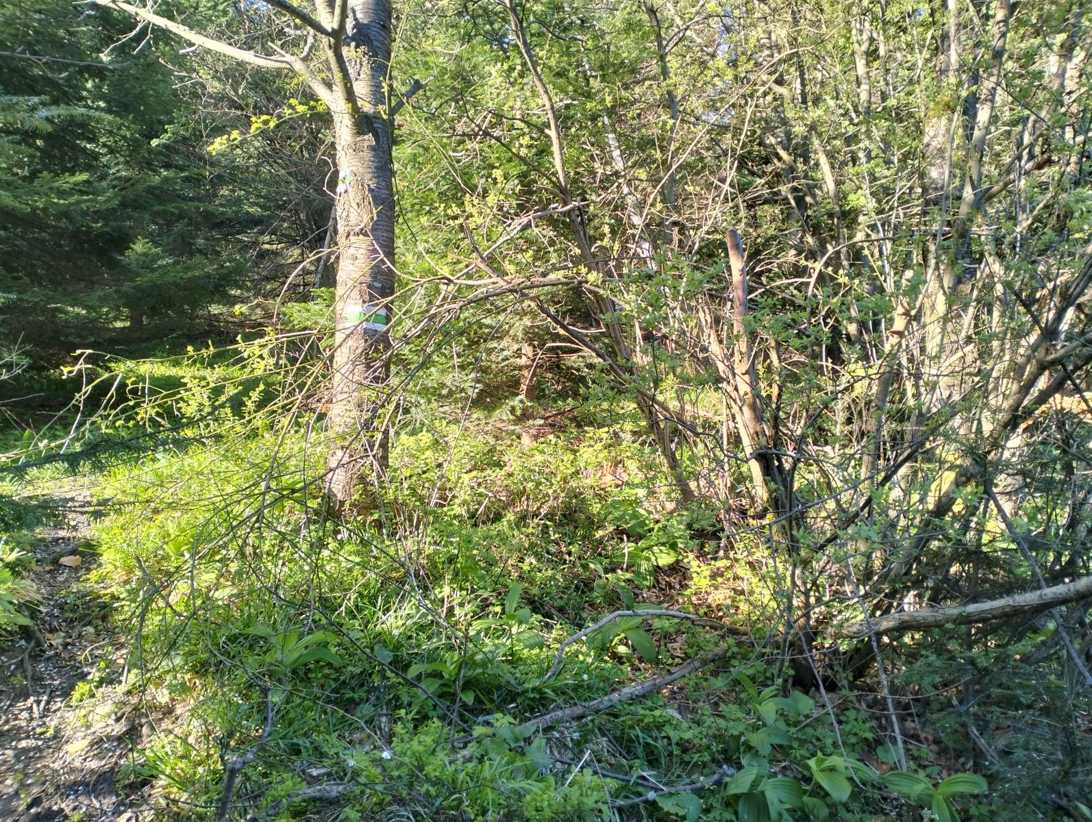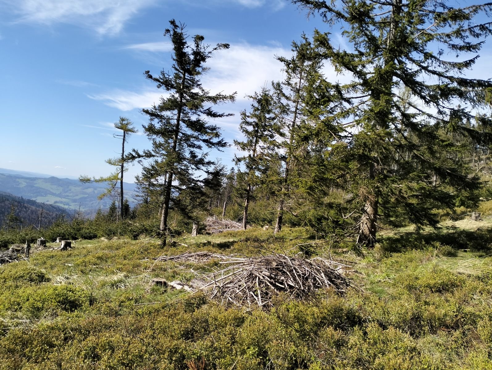Praktycznie jedyny widok na szlaku jest coraz bardziej zalesiony. Za kilka lat nic tu nie zobaczymy. W tym miejscu co ciekawe rośnie ... czosnek niedźwiedzi.