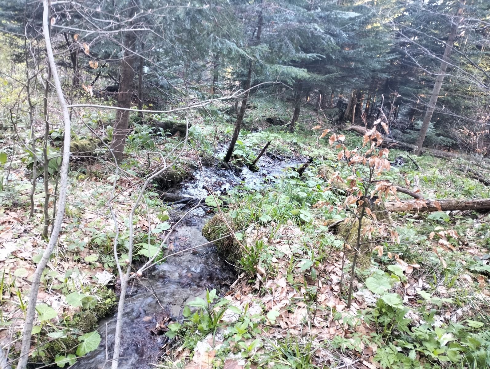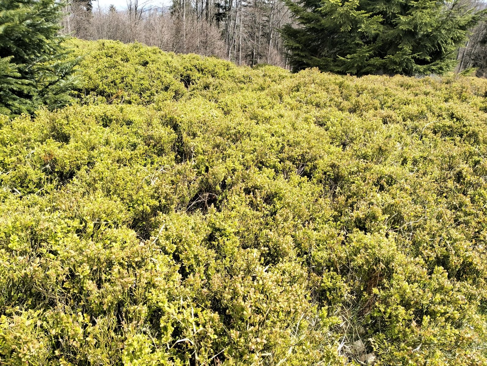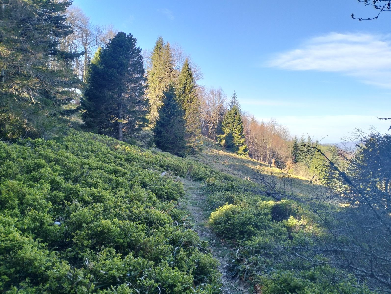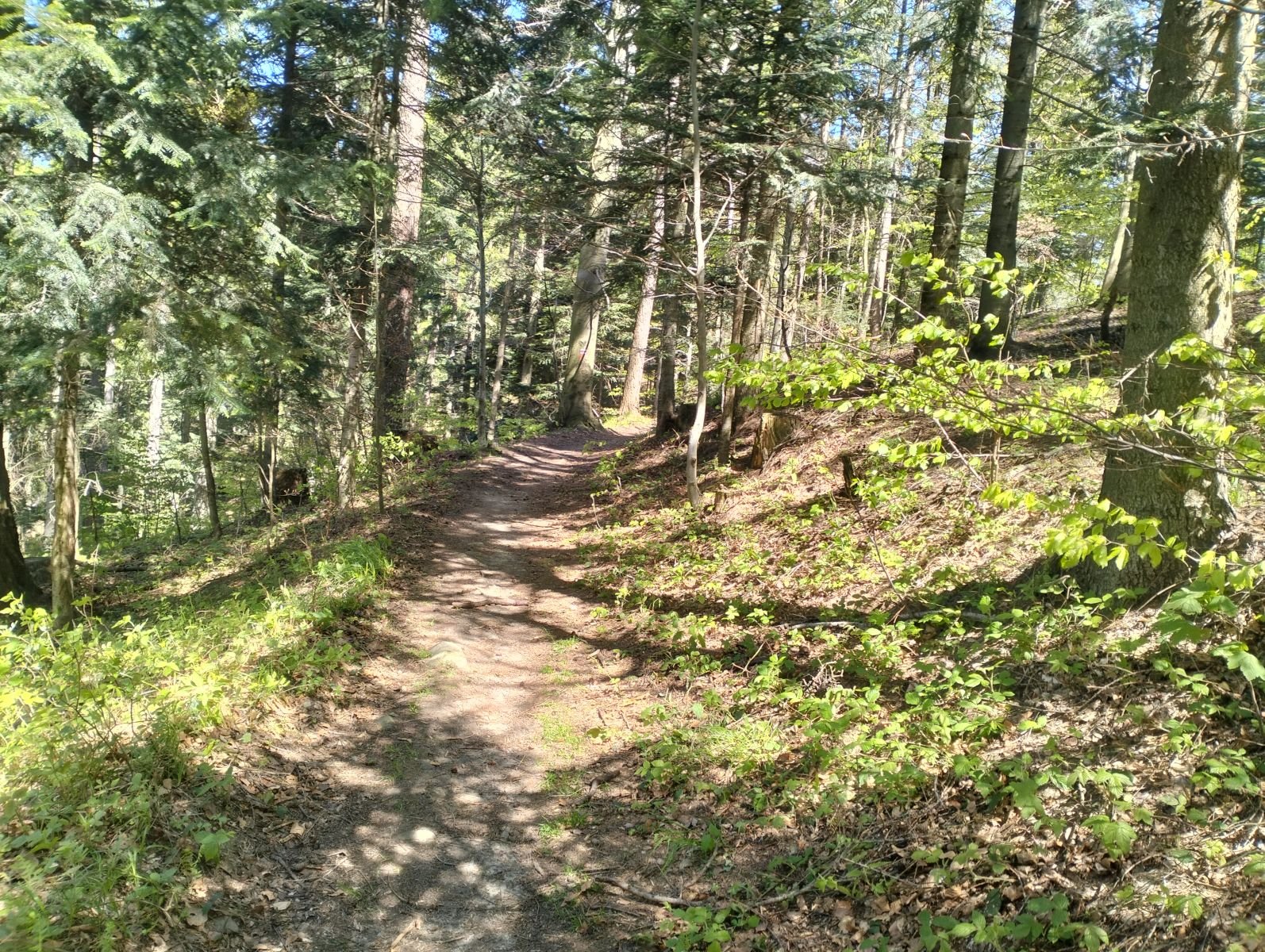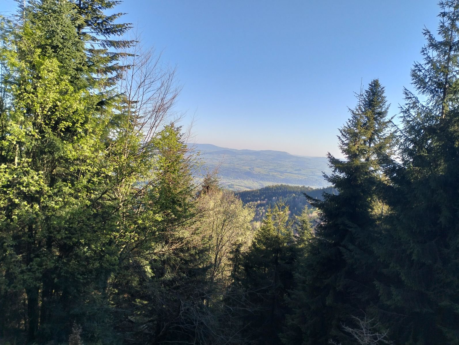 Praktycznie jedyny widok na szlaku jest coraz bardziej zalesiony. Za kilka lat nic tu nie zobaczymy. W tym miejscu co ciekawe rośnie ... czosnek niedźwiedzi.