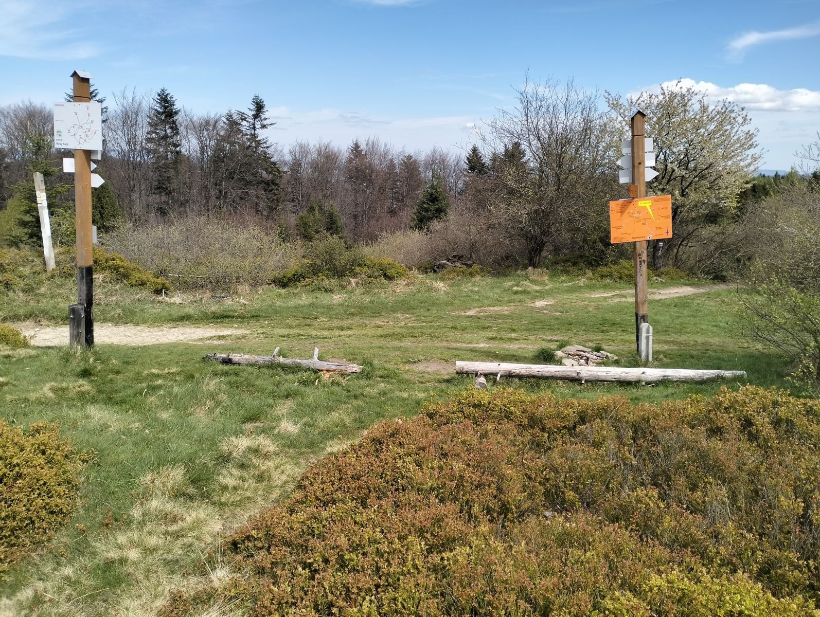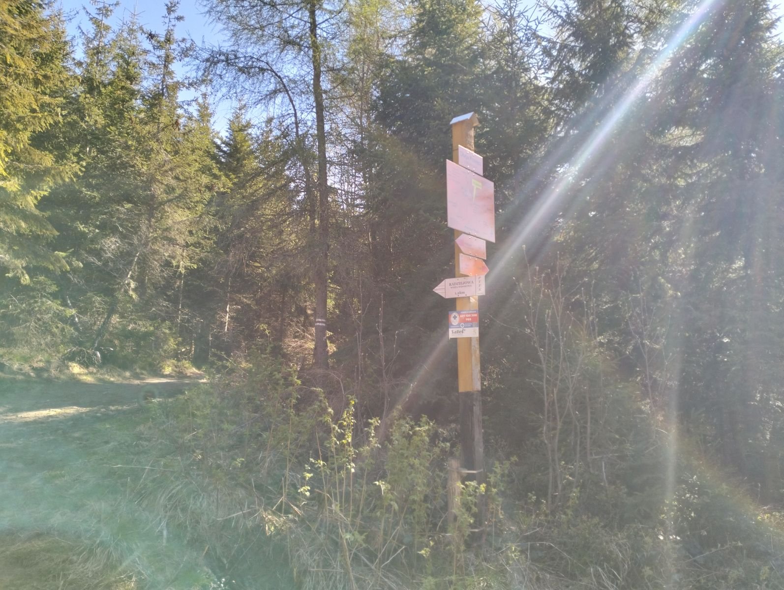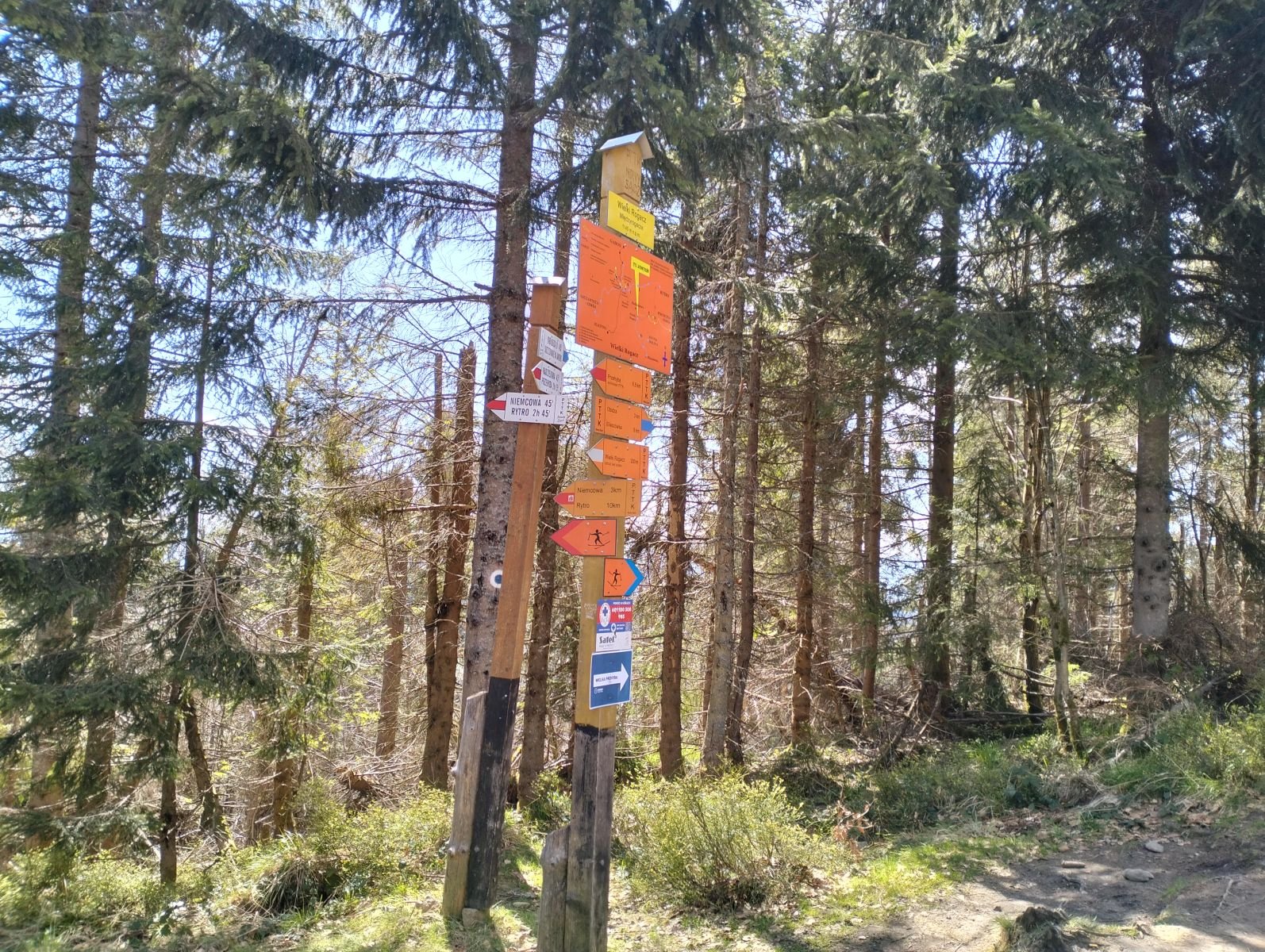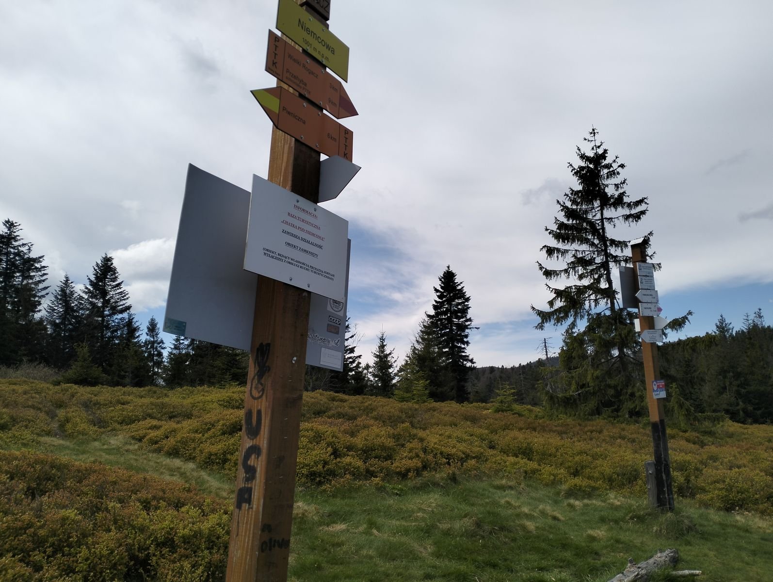 Szczyt całkowicie zalesiony, jakby nie ta kartka na drzewie nic szczególnego byśmy tu nie zauważyli. Po drodze mijamy sporo turystów.