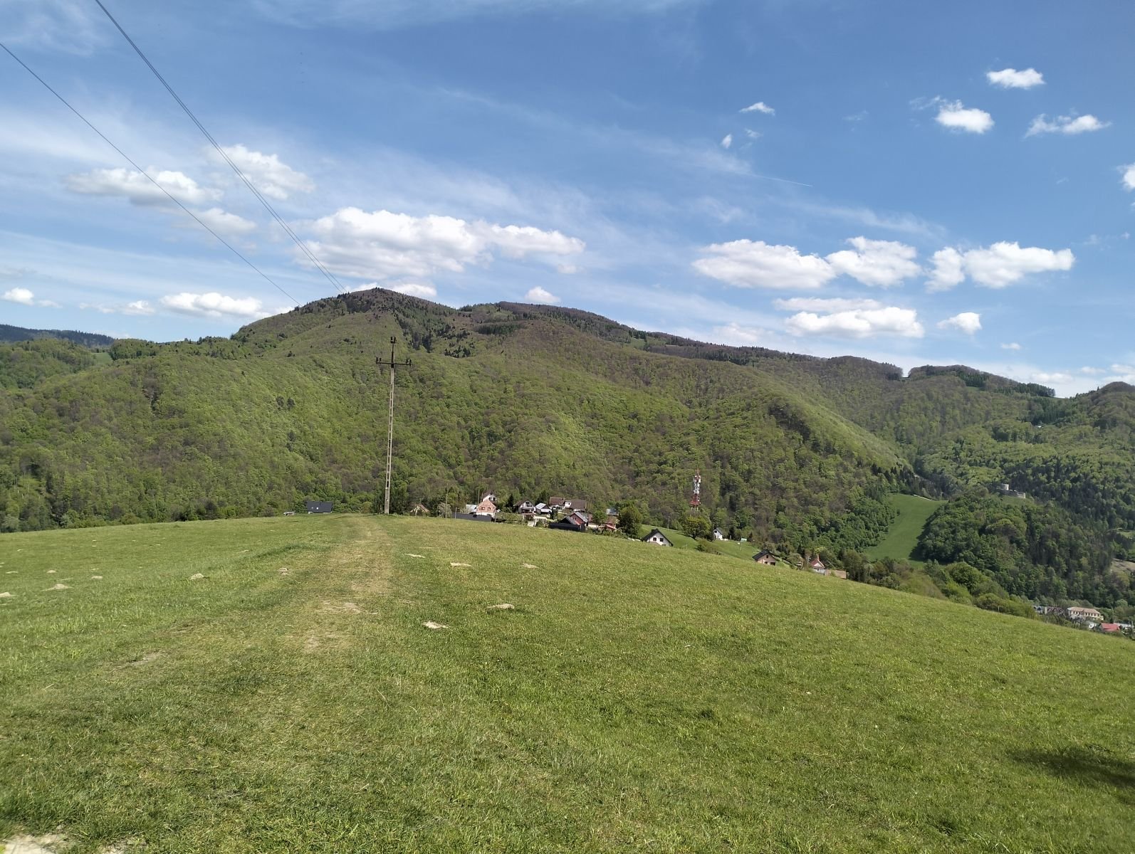 Takie piękne widoki. Góra Połom 503 m n.p.m. Biegnie tu żółty szlak gminny, który przebiega właśnie pod wiatrakiem. Widać, że jest to popularne miejsce, dookoła sporo piknikujących osób.