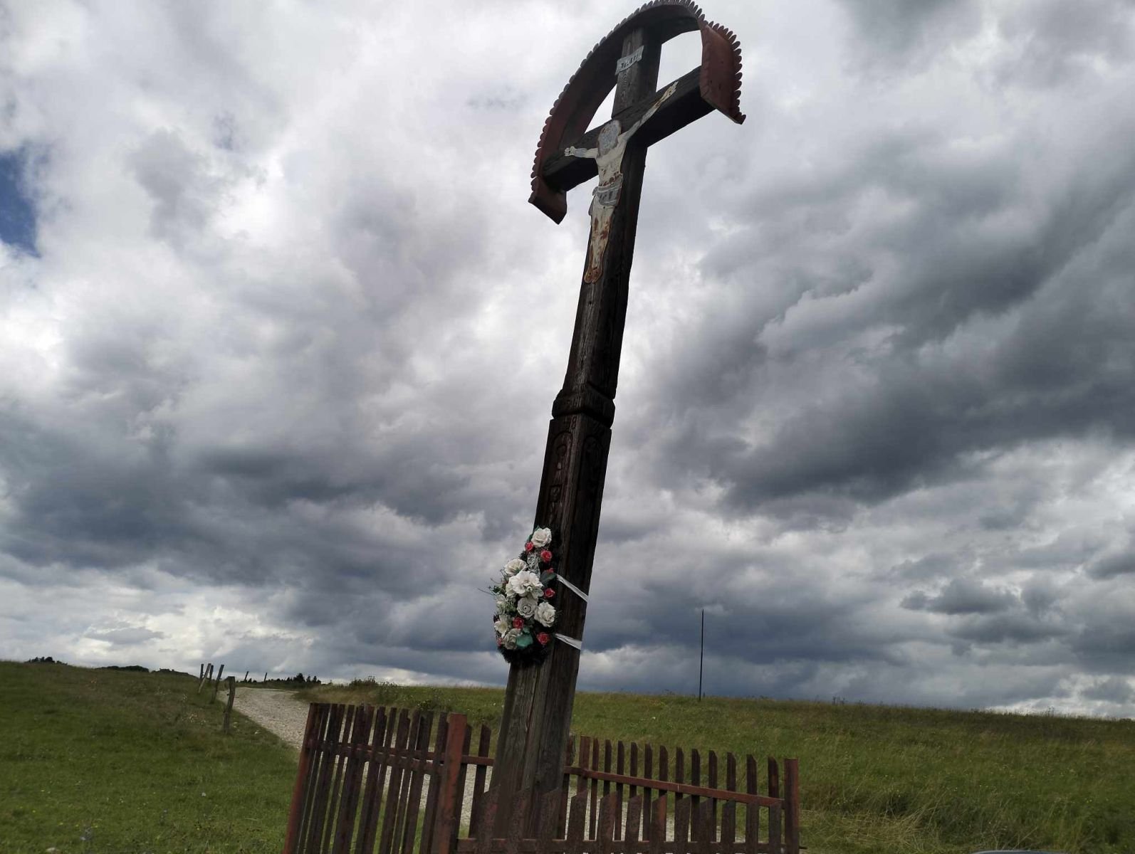 Przydrożny krzyż, teraz tylko i wyłącznie asfalt! Te chmury tak groźnie tylko na zdjęciu wyglądały.