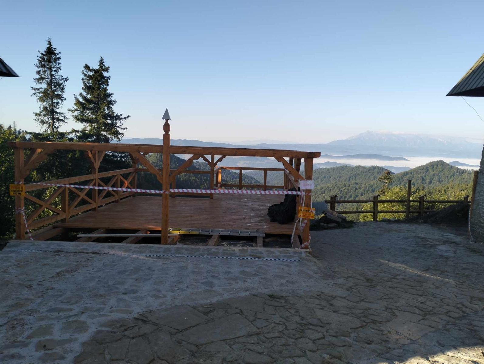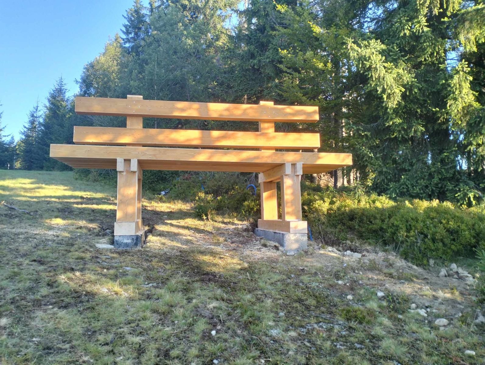 Ławeczka pod nadajnikiem z widokiem... po drugiej stronie powstaje taka sama. Nie widać tego na zdjęciu, ale jest bardzo wysoka, i nie jest łatwo na nią wyjść. Bardzo fajna atrakcja, na pewno będzie to hit! Niebawem gotowy będzie i nowy taras widokowy (już jest gotowy). Schronisko otwarte od godziny 8:00 a ktoś tu zapomniał wody.....na szczęście była w plecaku pusta butelka co się dalej z nią działo lepiej nie pisać!
