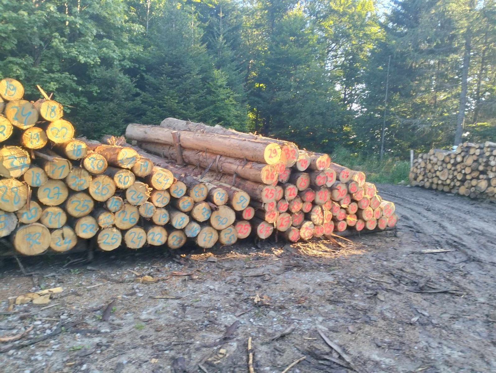 Tuż przed Przehybą nic się nie zmienia, wycinka i składowisko drewna, tym razem z jakimiś liczbami - wygląda to zabawnie, niebiesko -czerwono, ale o co w tym chodzi nie wiemy.