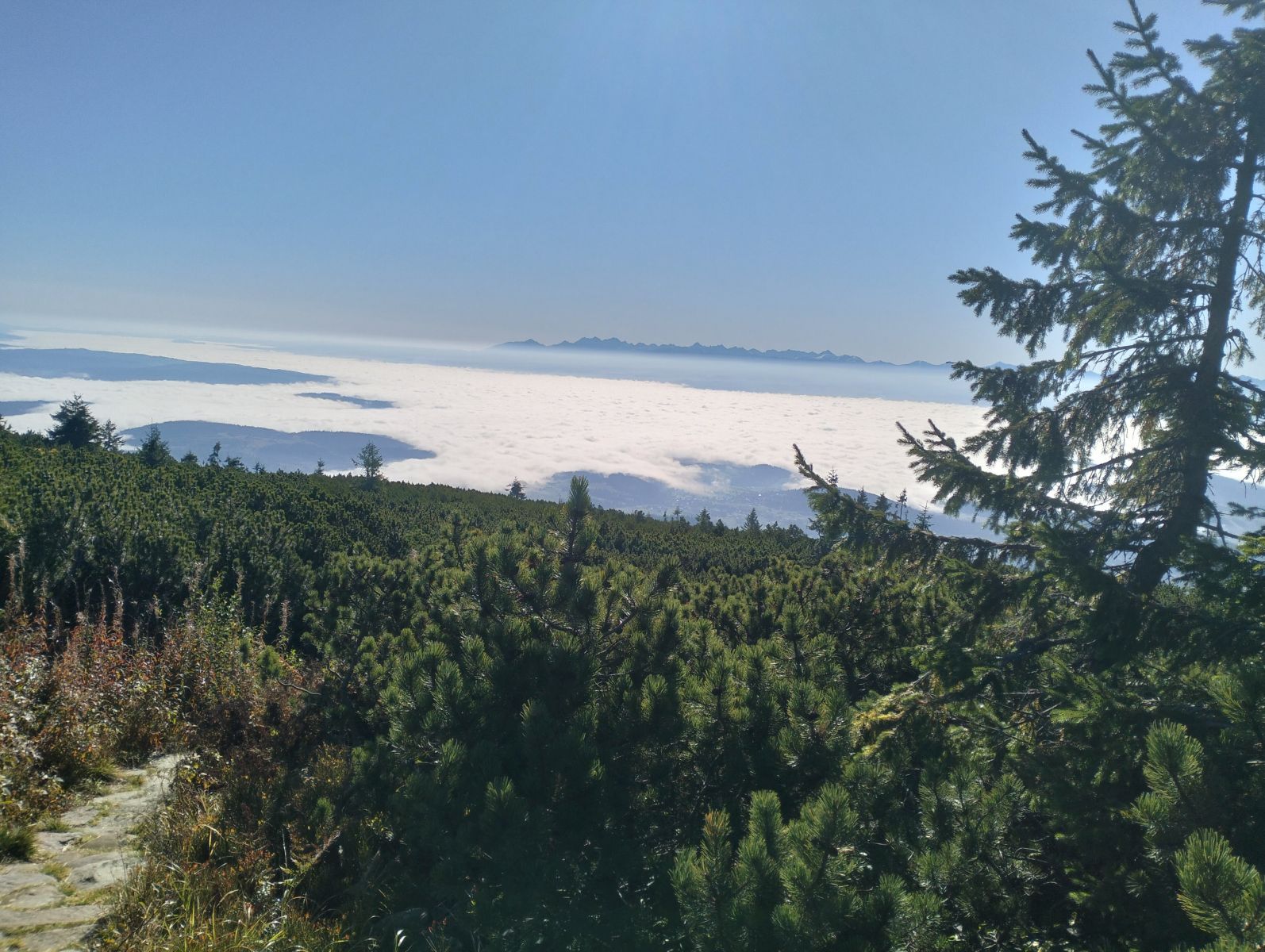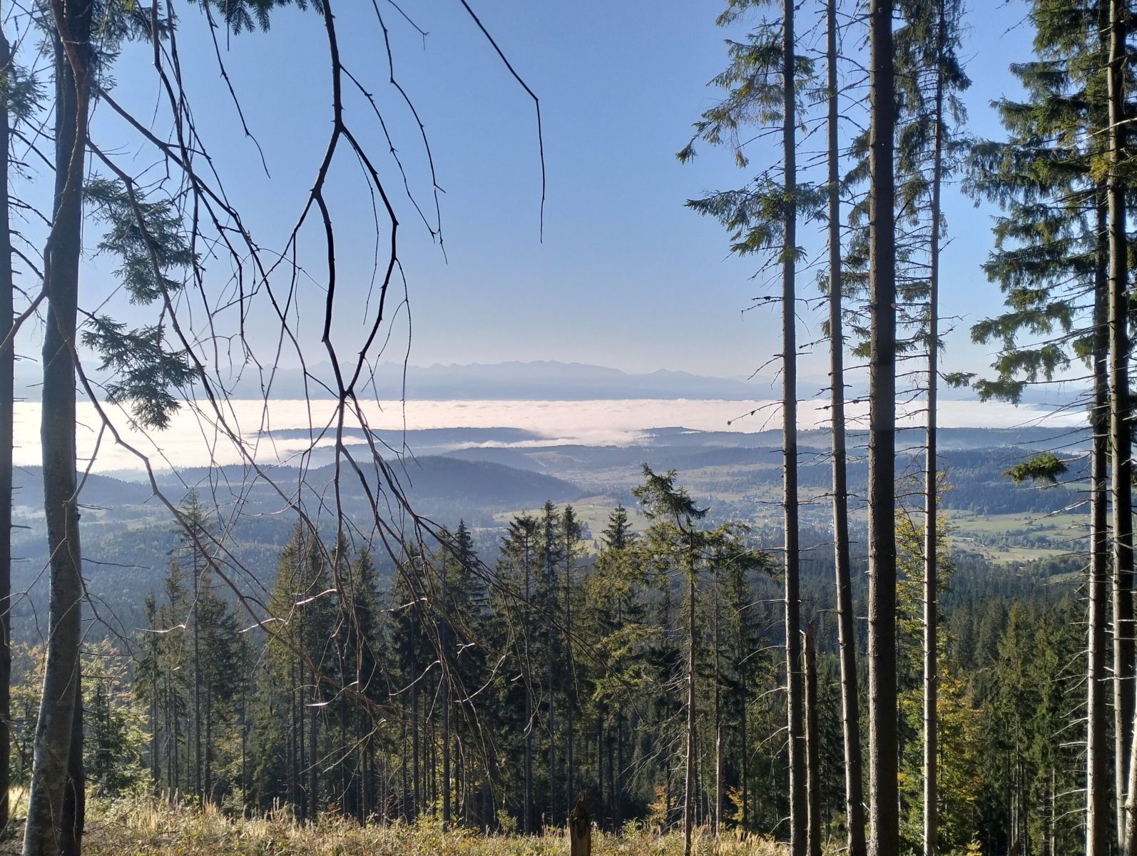 No wow. Taki pierwszy prześwit przez las w stronę Taterek. Na dole mgła, warunki znakomite, przejrzystość powietrza daję nam takie piękne widoki. Maszerujemy przy potoku, aż w pewnym momencie robi się cisza...