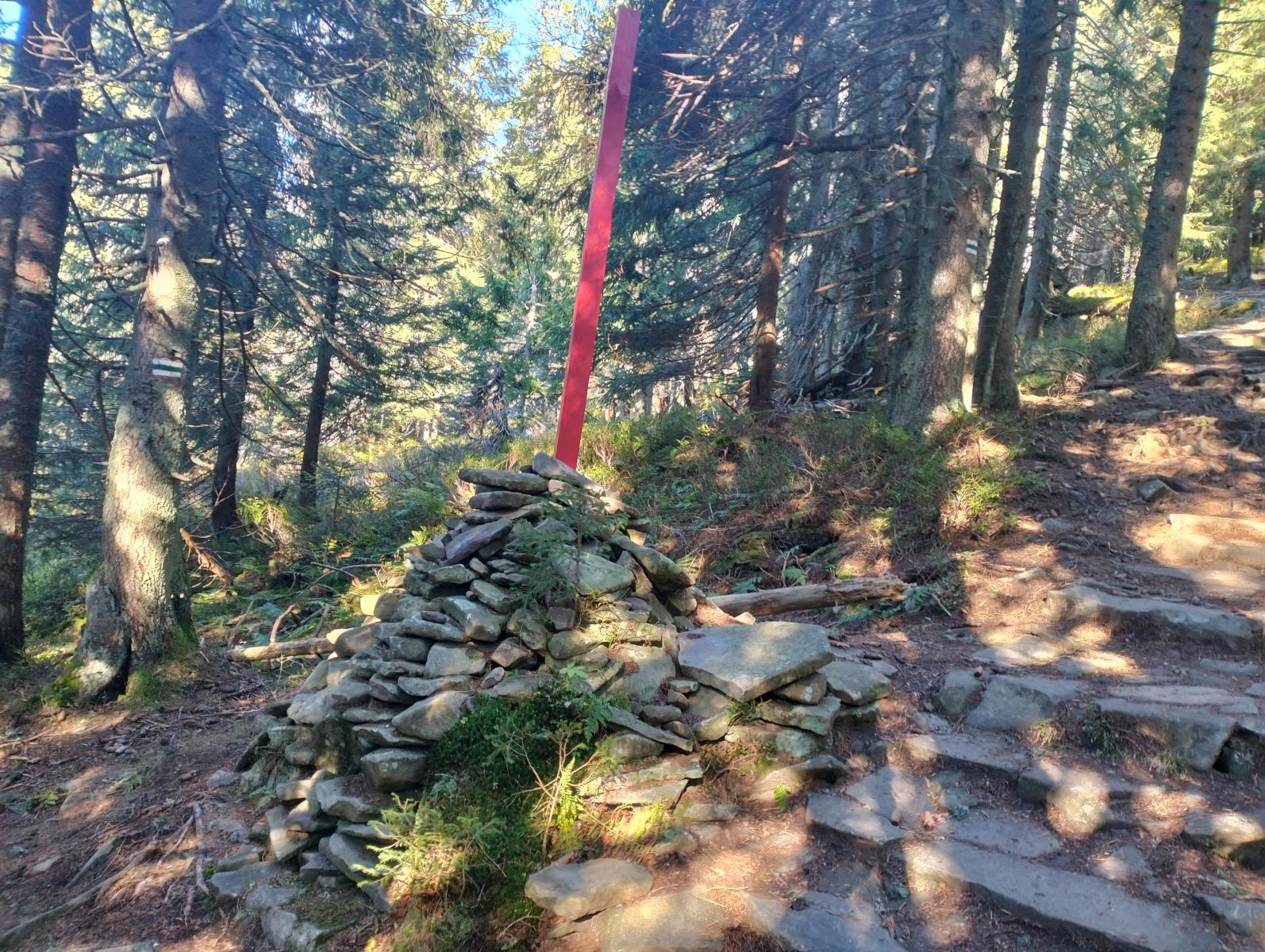 Kupa kamieni i drogowskaz, pomocny gdy ten na drzewie po lewej stronie zasypany jest śniegiem. Generalnie w wyższej partii nie ma drzew więc te słupy je zastępują.
