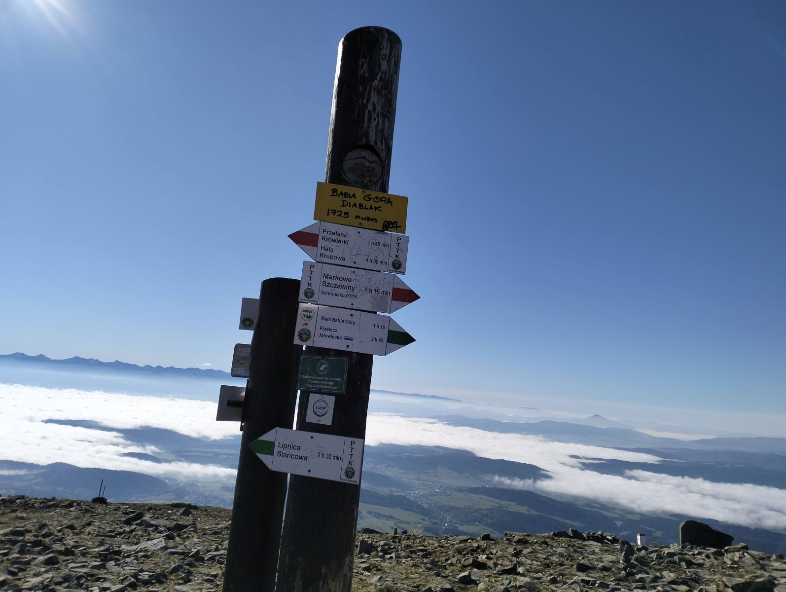 Szczyt fajnie wygląda, połowa strona Polska, krok dalej jesteśmy na Słowacji. Widoki niczemu sobie. Ponoć na Babiej Górze zawsze wieje, w tym dniu nie wiało!