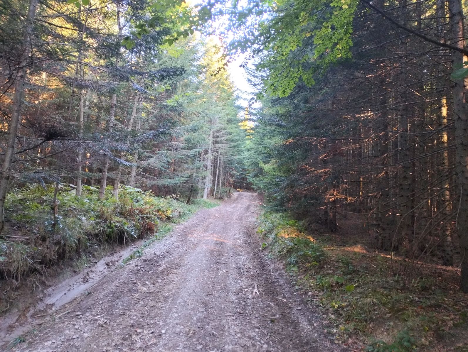 Początek szlaku, to szeroka utwardzona droga, las bardzo gęsty , są i grzybiarze, choć na tej wysokości chyba ciężko o grzyby. Bardzo gęsty las, robi wrażenie.