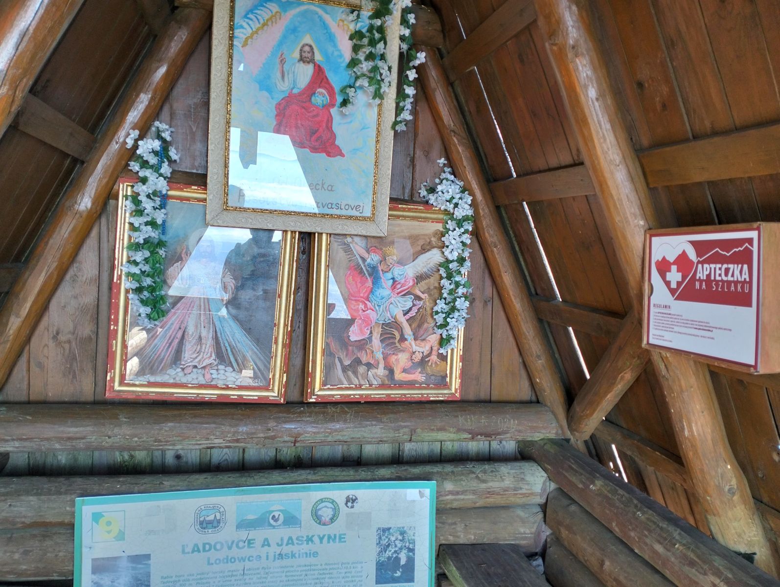 Wiata - Święte obrazy, obok apteczka na szlaku.