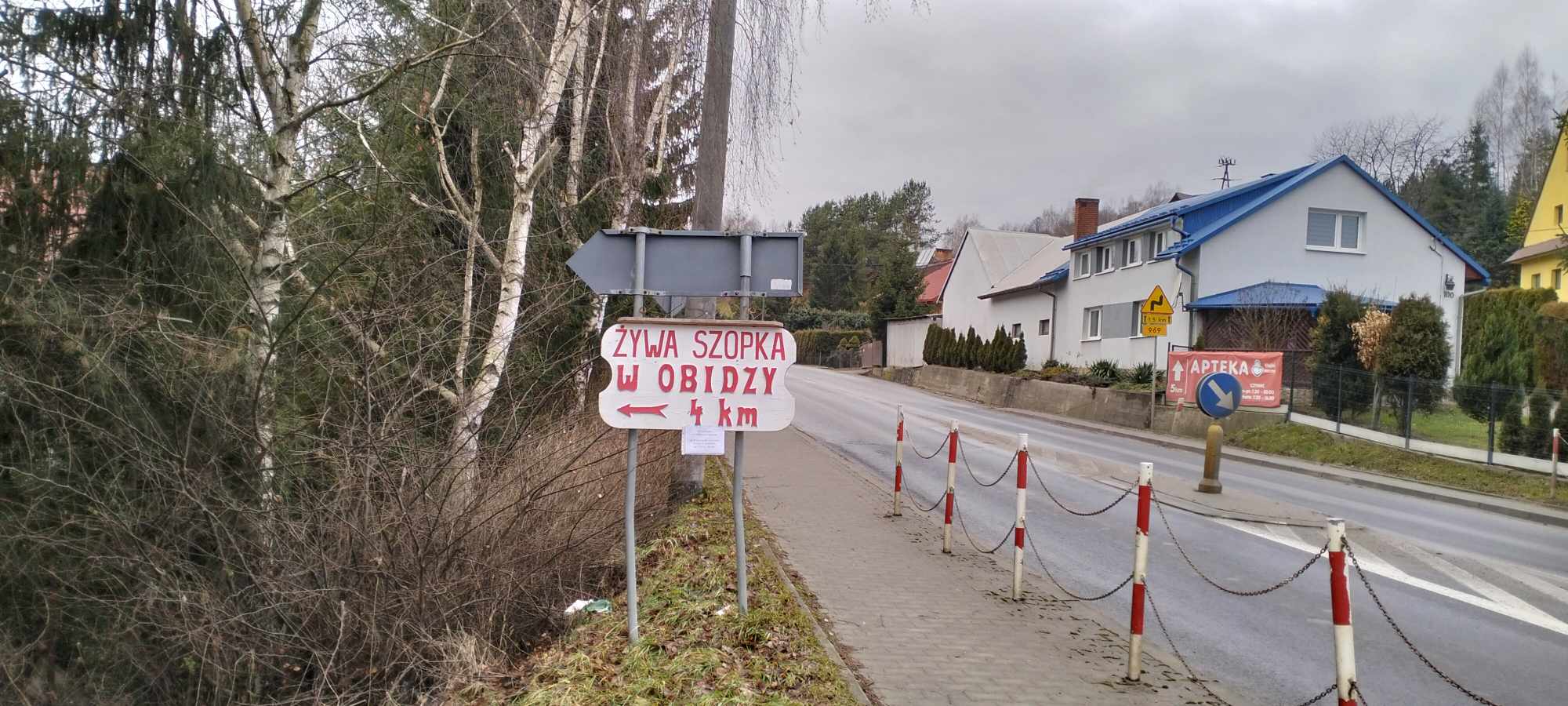 Jadąc od Nowego Sącza mijamy stację paliw Moya, budynek OSP w Jazowsku i po chwili na skrzyżowaniu drogi skręcamy w lewo ( w prawo jest skręt do kościoła w Jazowsku) i tak jak na widocznym zdjęciu jedziemy 4 kilometry powiatową drogą w górę Obidzy. Parking i szopka znajdują się tuż przed kościołem po lewej stronie więc bez problemu można zaparkować.